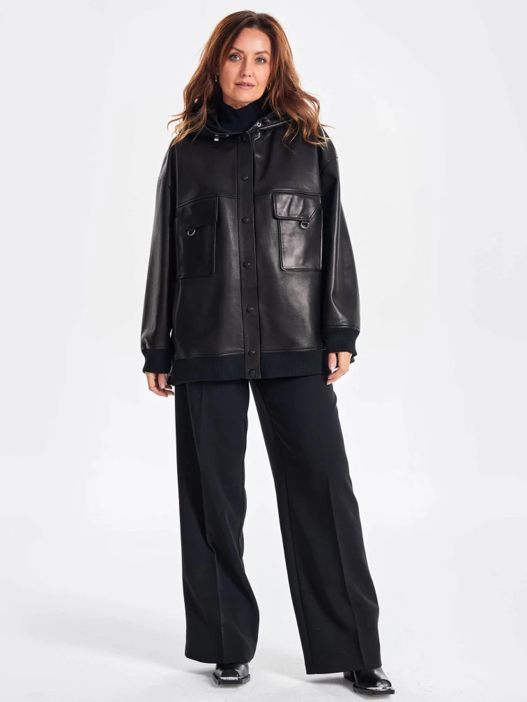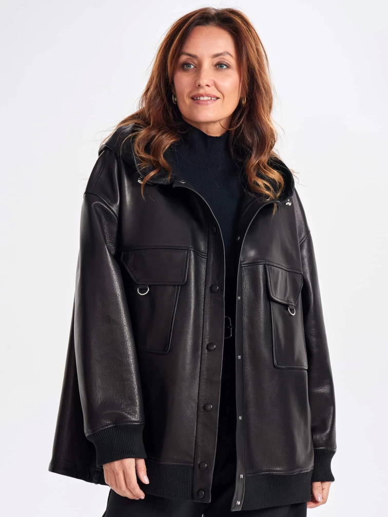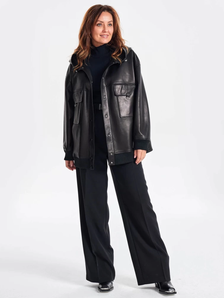 Товар удлиненная кожаная женская куртка бомбер с капюшоном премиум класса 3067, черная, размер 48, артикул 23810 выполнен из натуральной кожи с застежкой кнопки. Рассчитан на сезон: весна-лето. Длина изделия 72 см, силуэт свободный.