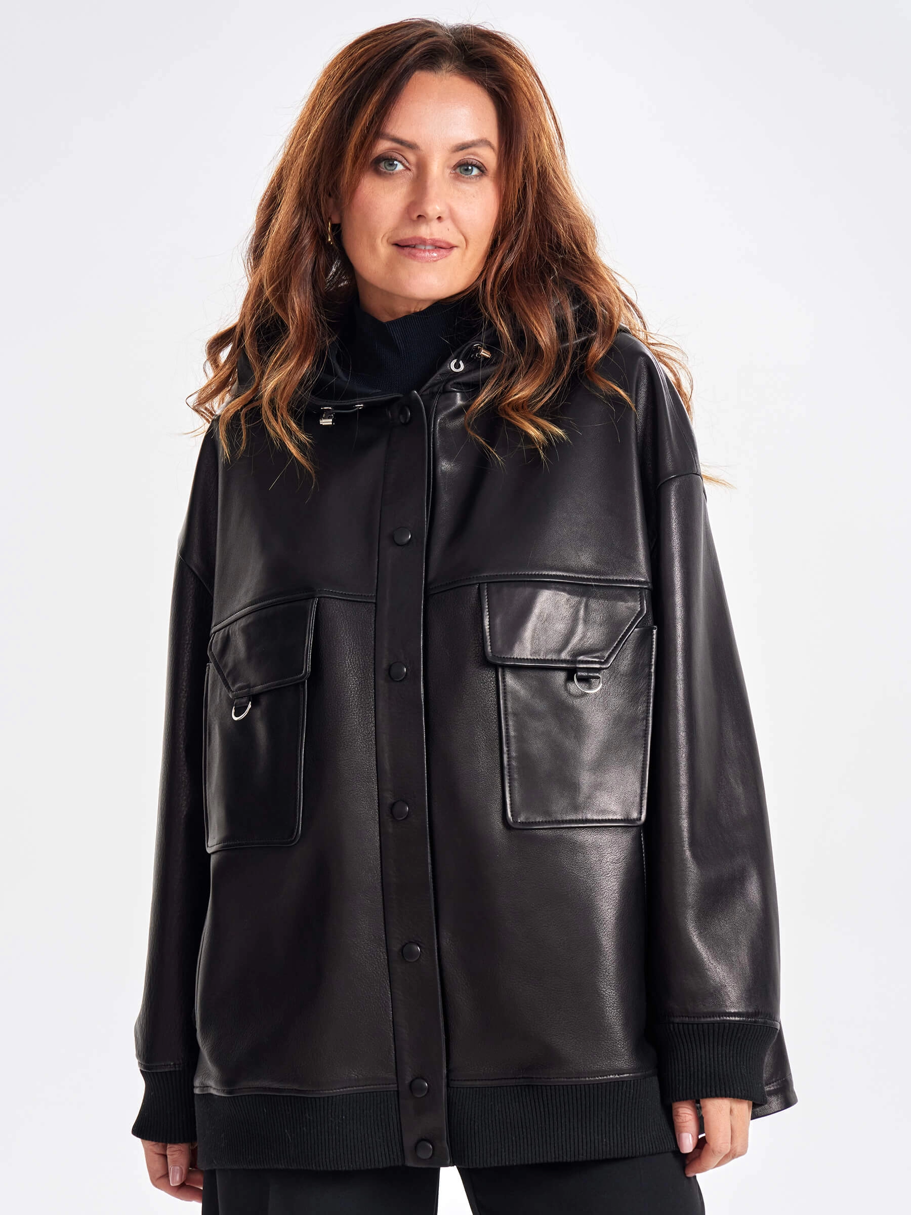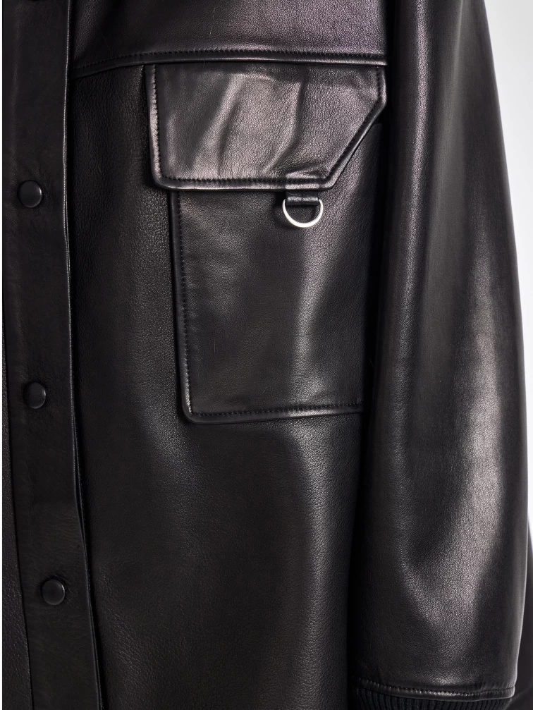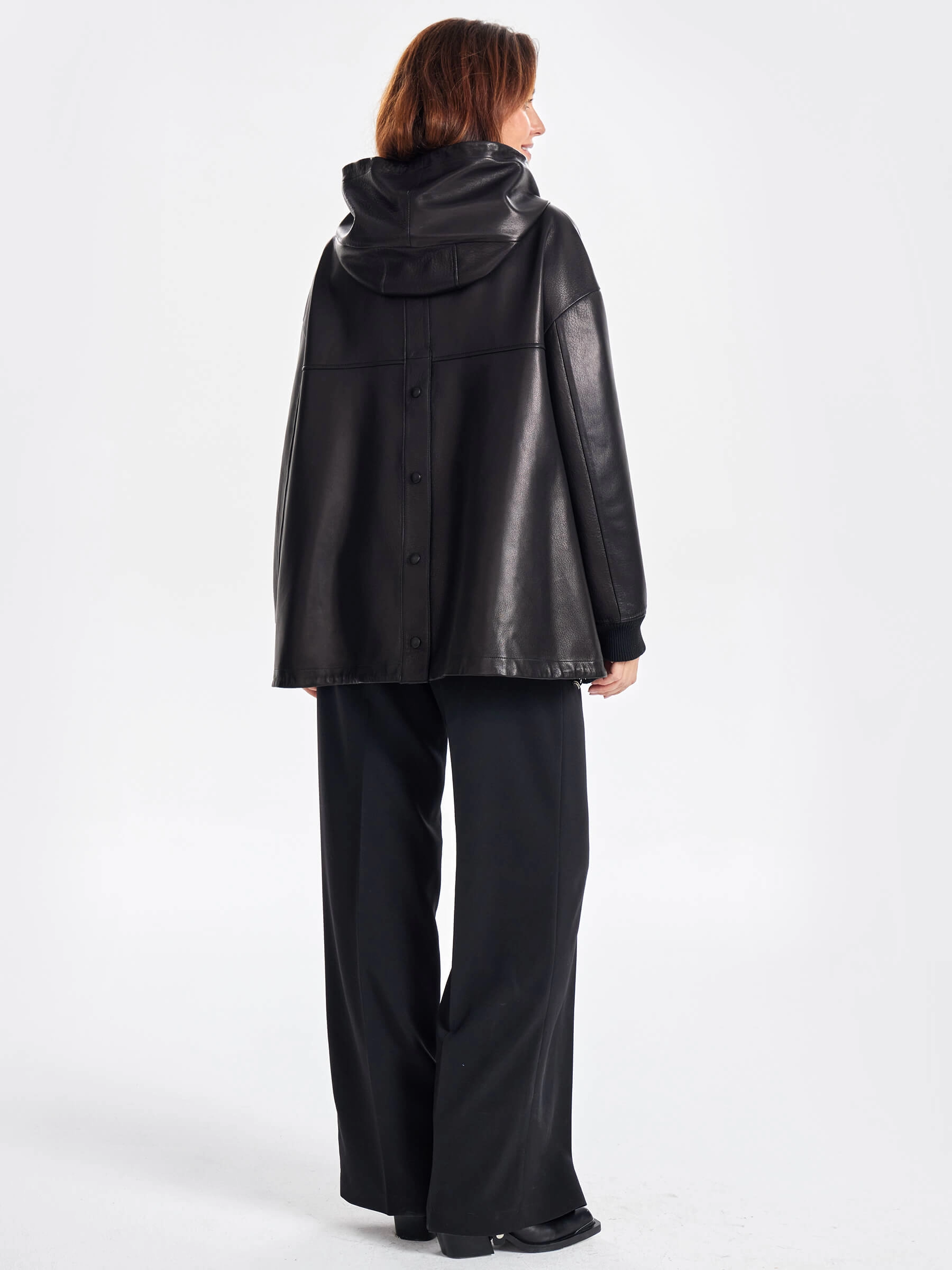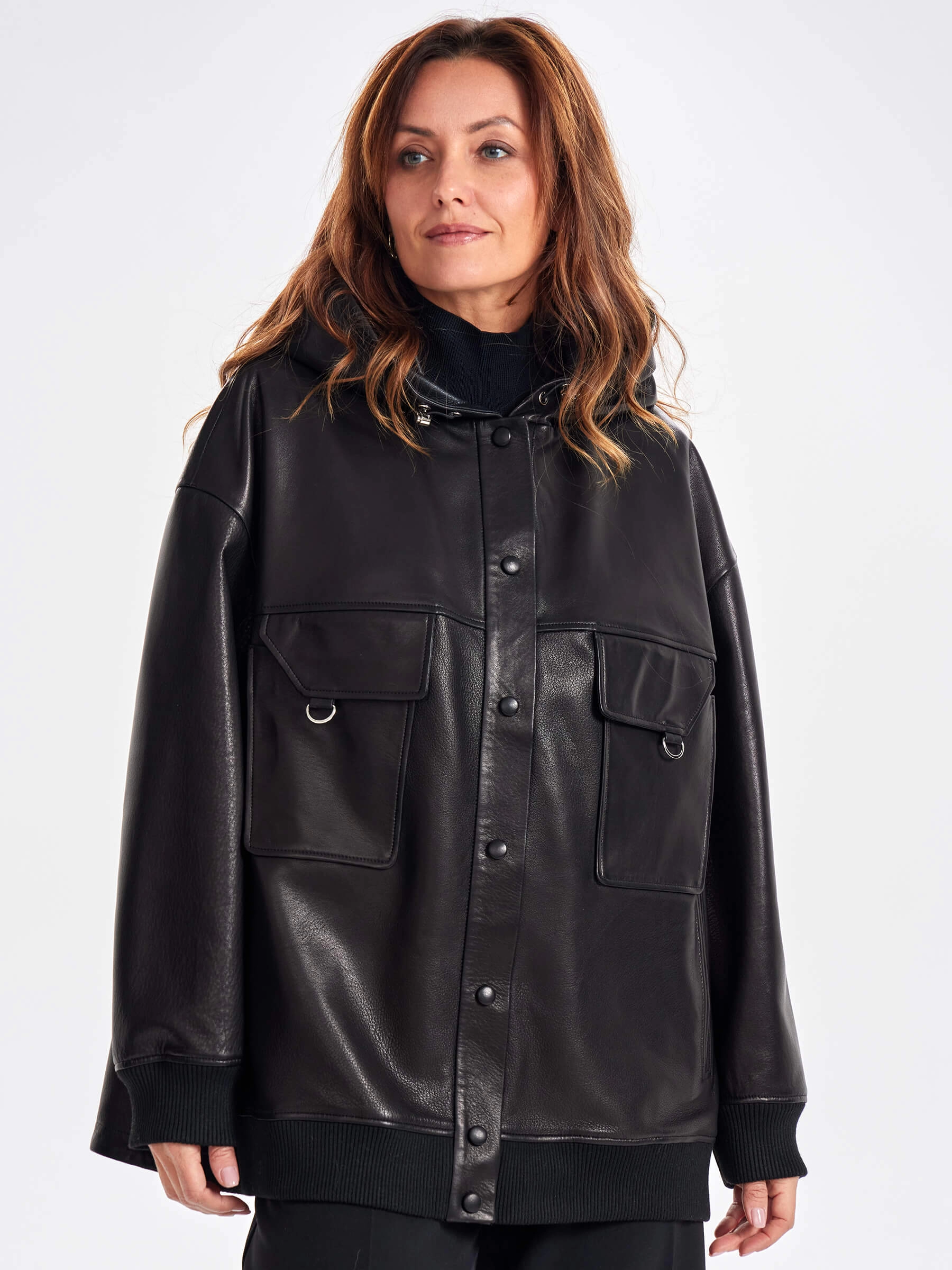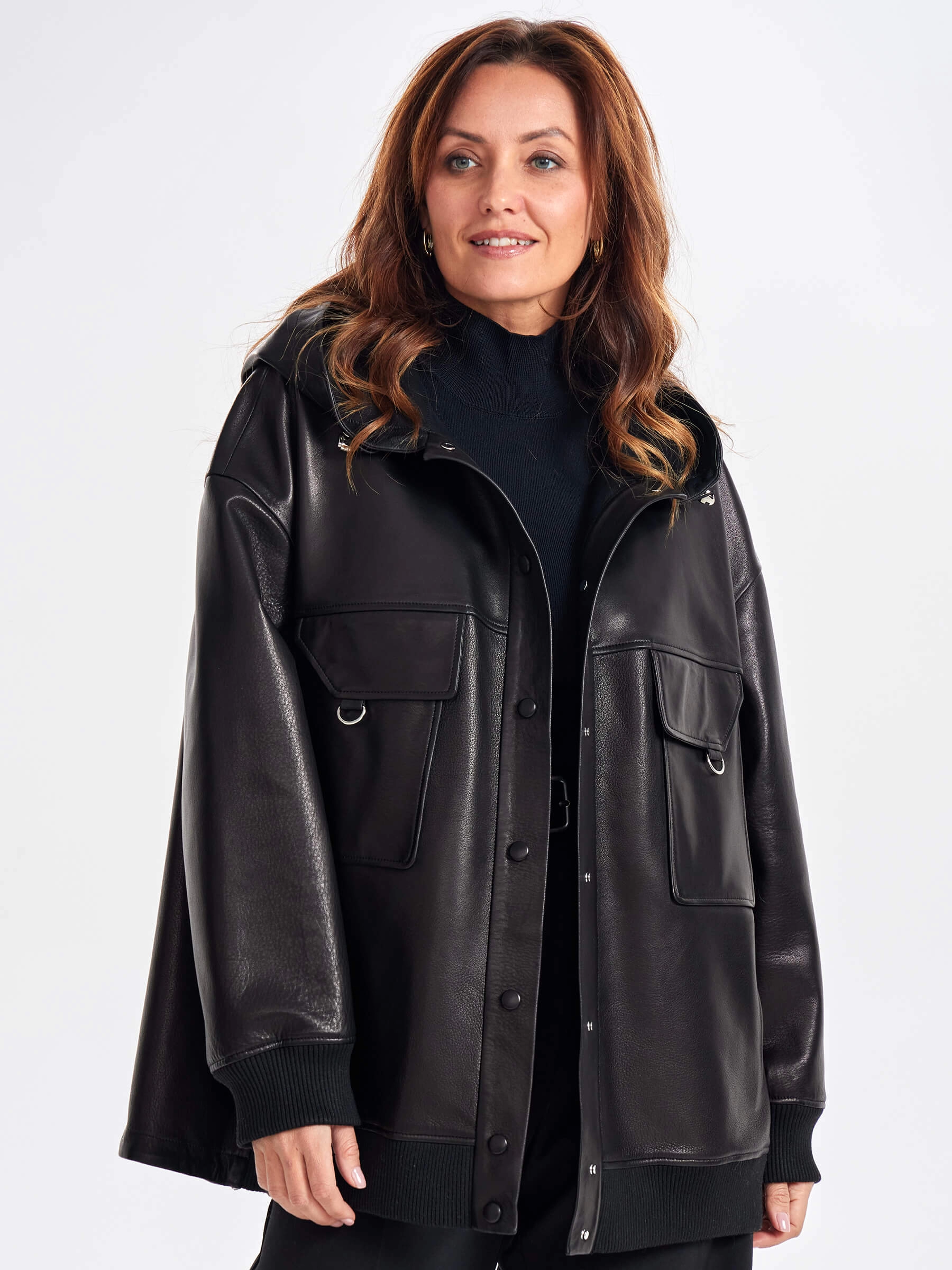 Эта удлиненная куртка-бомбер свободного кроя отшита из черной кожи премиум класса. Универсальность данной модели заключается в том, что с ней отлично сочетаются любые предметы вашего гардероба. Великолепная свобода движения, удобный регулируемый капюшон. Трикотажные манжеты добавят комфорта. Дополнением к изделию послужили два нагрудных кармана из гладкой кожи закрывающиеся клапанами.