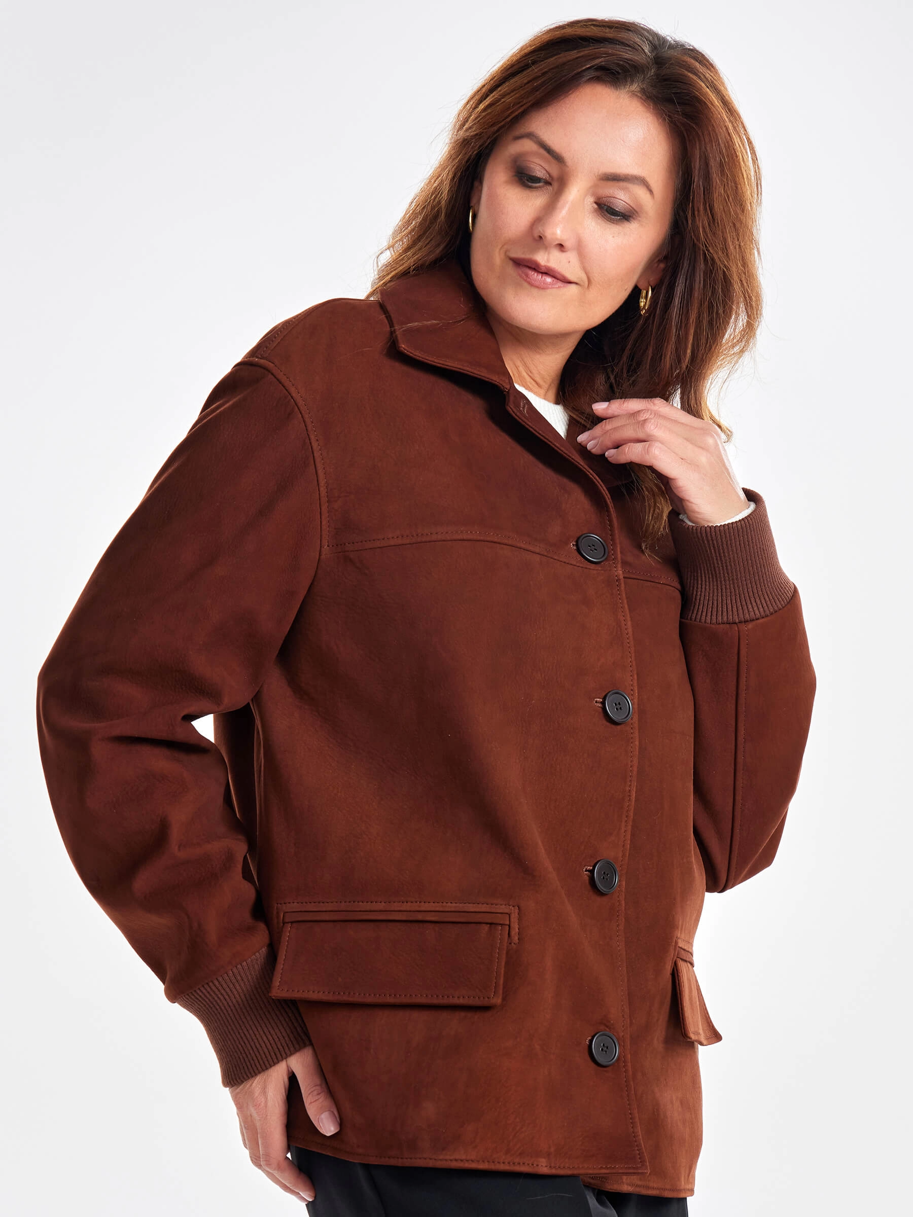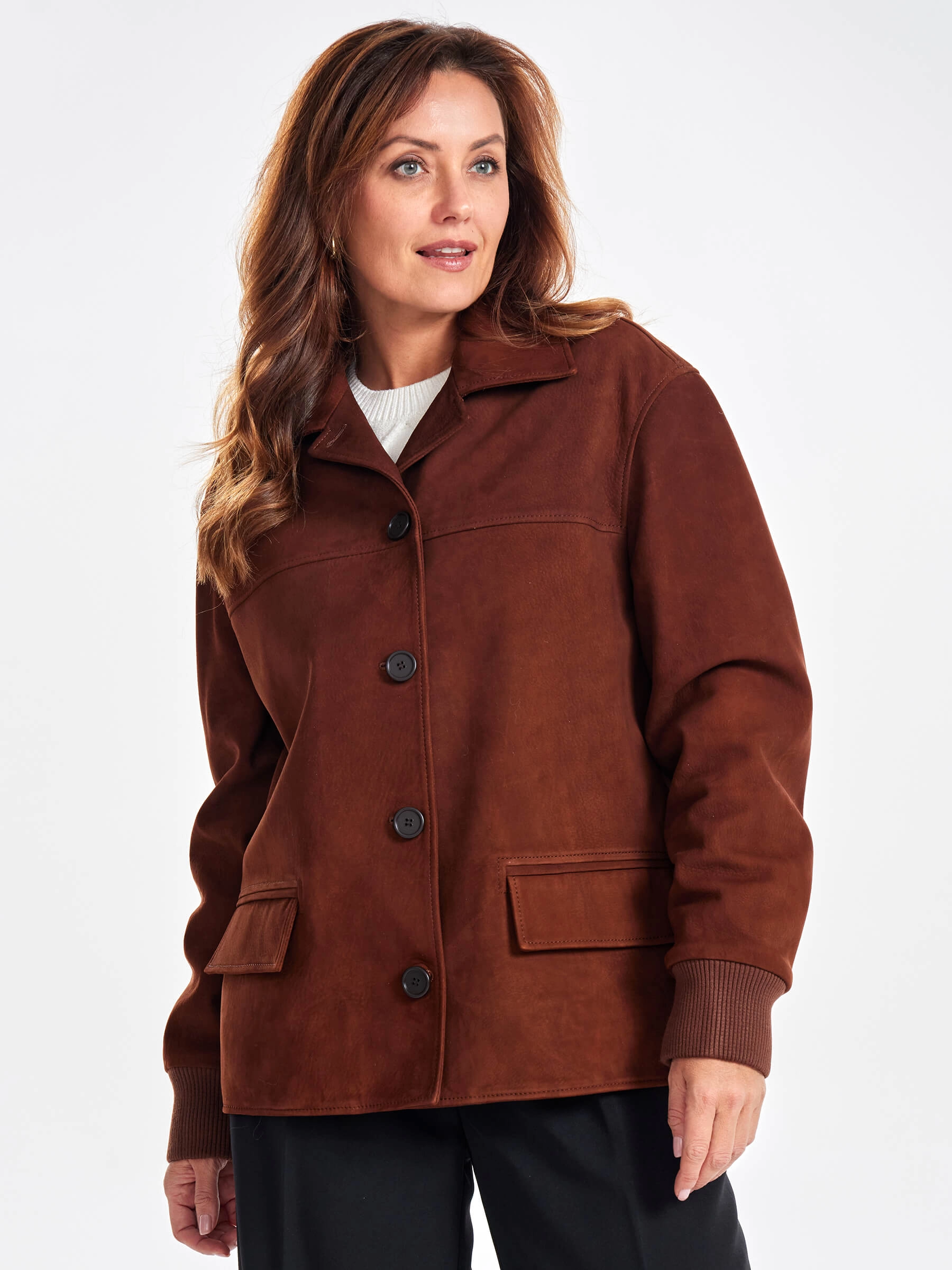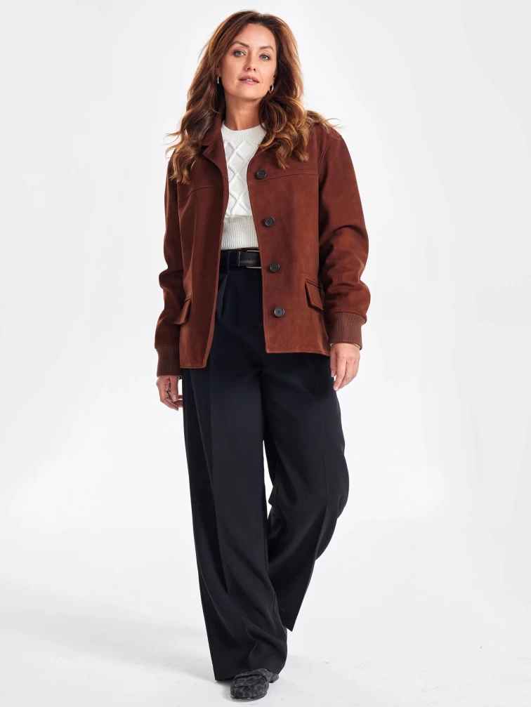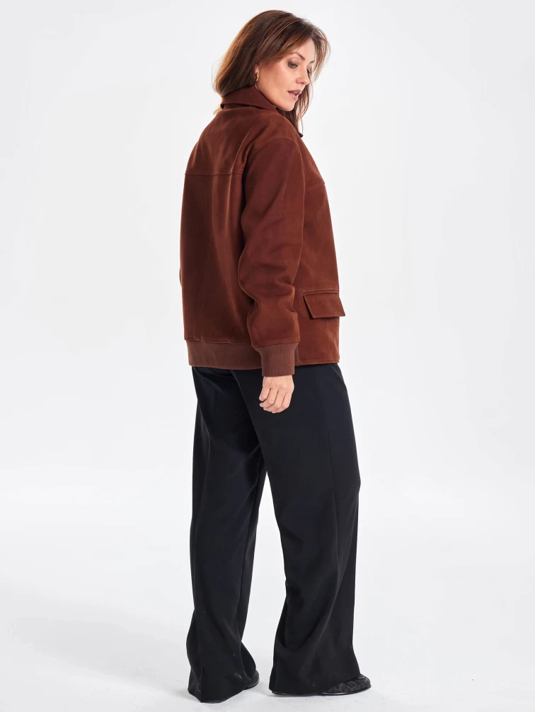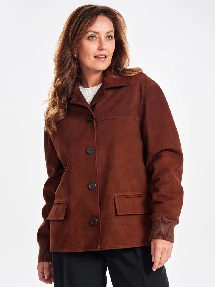 При пошиве этой лаконичной куртки с английским воротником и двумя карманами использовали мягкую кожу премиум класса. Модель свободного силуэта, со спущенной линией плеч не сковывает движения, удобно садится по фигуре. Дополнительный комфорт добавят трикотажные манжеты и пояс. Классический дизайн изделия будет одинаково гармонично смотреться как с брюками так и с платьем.