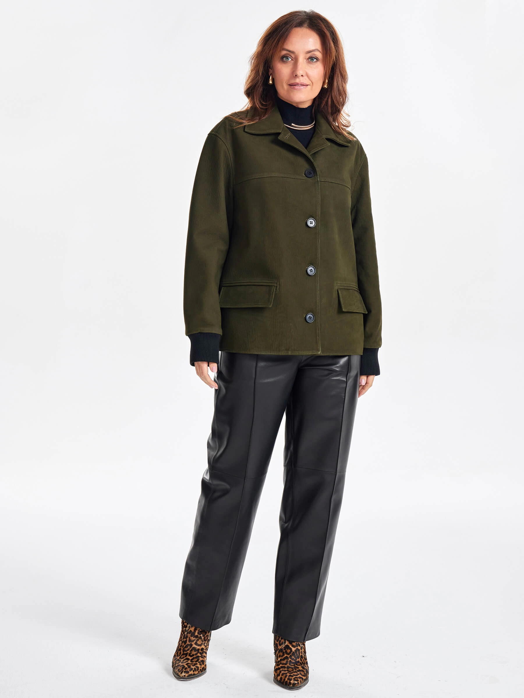 При пошиве этой лаконичной куртки с английским воротником и двумя карманами использовали мягкую кожу премиум класса. Модель свободного силуэта, со спущенной линией плеч не сковывает движения, удобно садится по фигуре. Дополнительный комфорт добавят трикотажные манжеты и пояс. Классический дизайн изделия будет одинаково гармонично смотреться как с брюками так и с платьем.