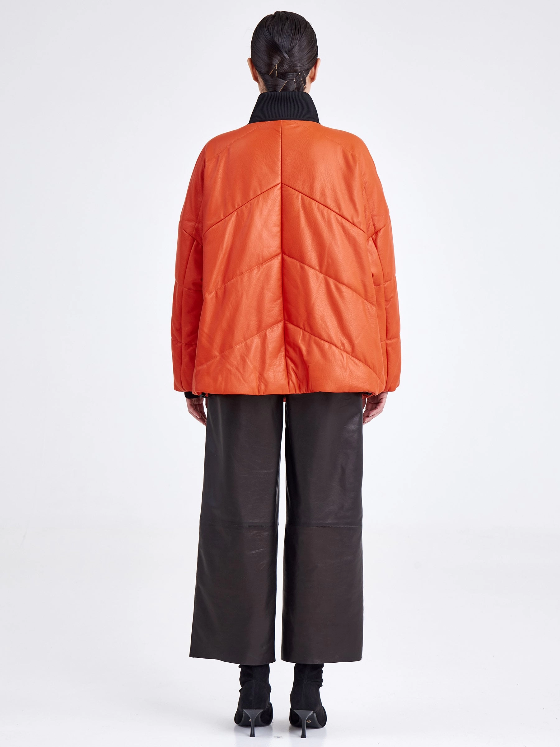 Короткий пуховик свободного кроя длиной до середины бедра (51–74 см) сшит из натуральной кожи насыщенного оранжевого цвета, который заряжает энергией и улучшает настроение. Лаконичный дизайн без декора и застёжка-молния с ветрозащитным клапаном делают модель универсальной, а высокая стойка из плотного трикотажа обеспечивает комфорт и защиту от ветра. Практичность дополняют подкладка из 100% полиэстера и немецкий утеплитель синтепон Freudenberg, гарантирующий отличную теплоизоляцию, воздухопроницаемость и простой уход в демисезонный период. Совет стилиста: Яркий акцент вашего образа — носите эту куртку с нейтральной базой (чёрные, белые, серые или джинсовые вещи), чтобы цвет стал главным героем. Идеально сочетать с облегающими брюками или джинсами и минималистичной обувью, например, кроссовками или ботильонами на плоской подошве.