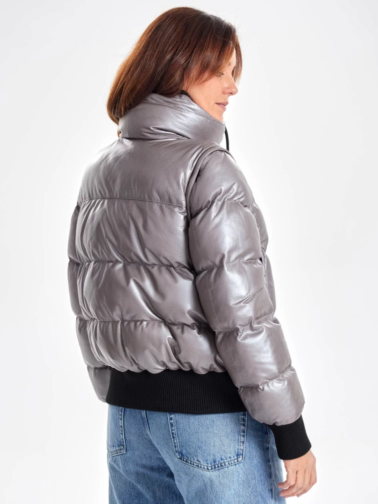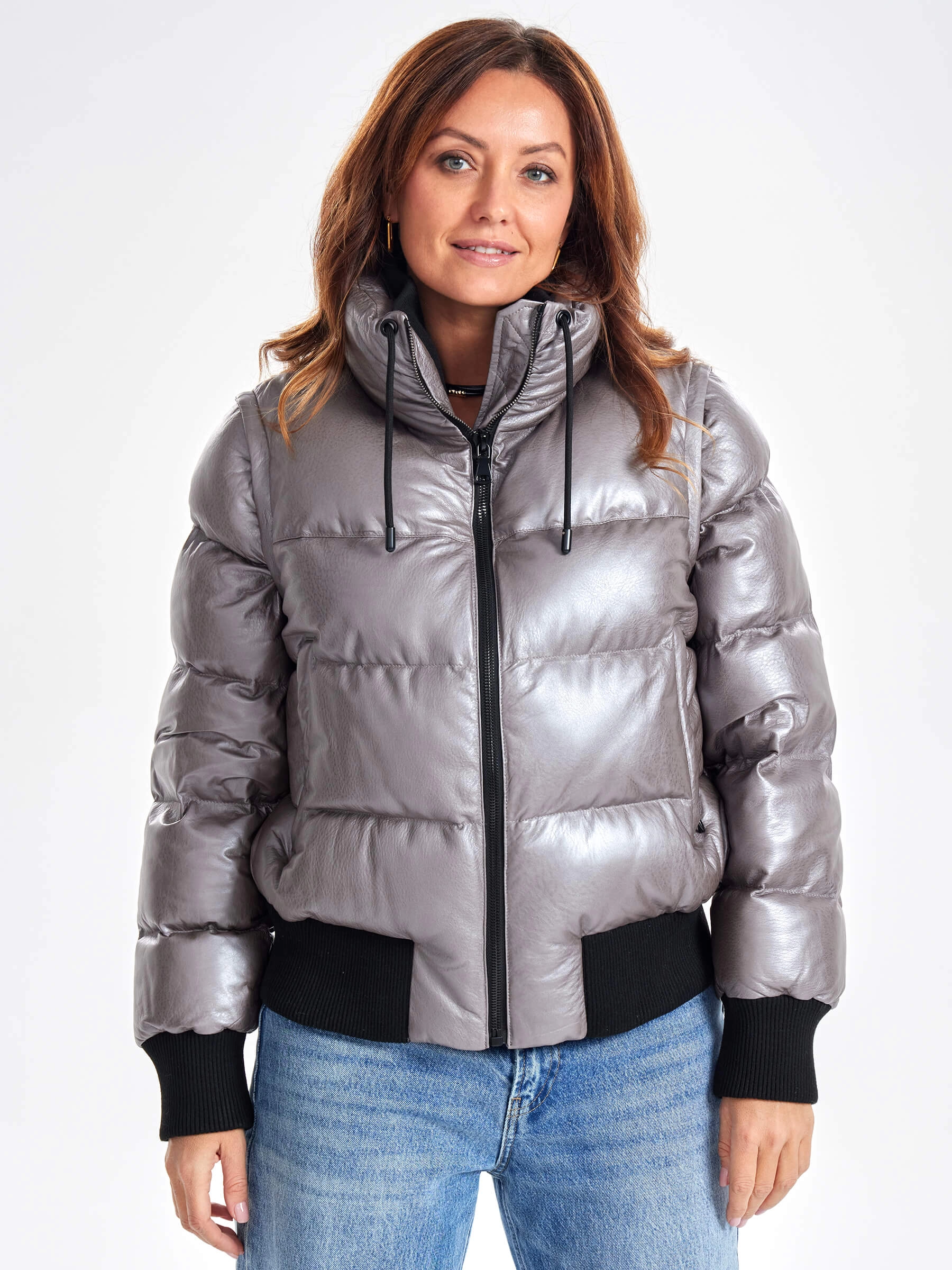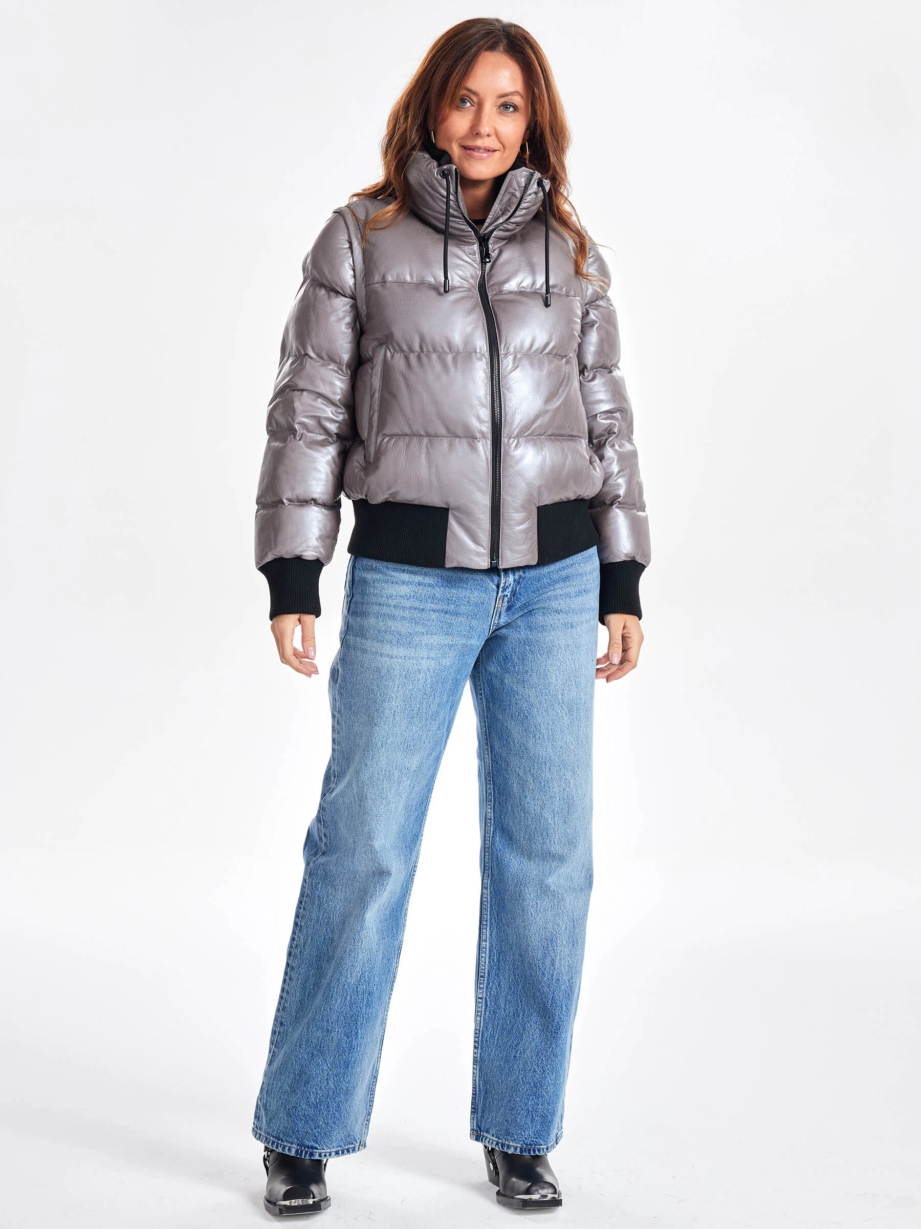 Утепленная стеганая кожаная куртка бомбер премиум класса для женщин 3074, серая, размер 46, артикул 23900