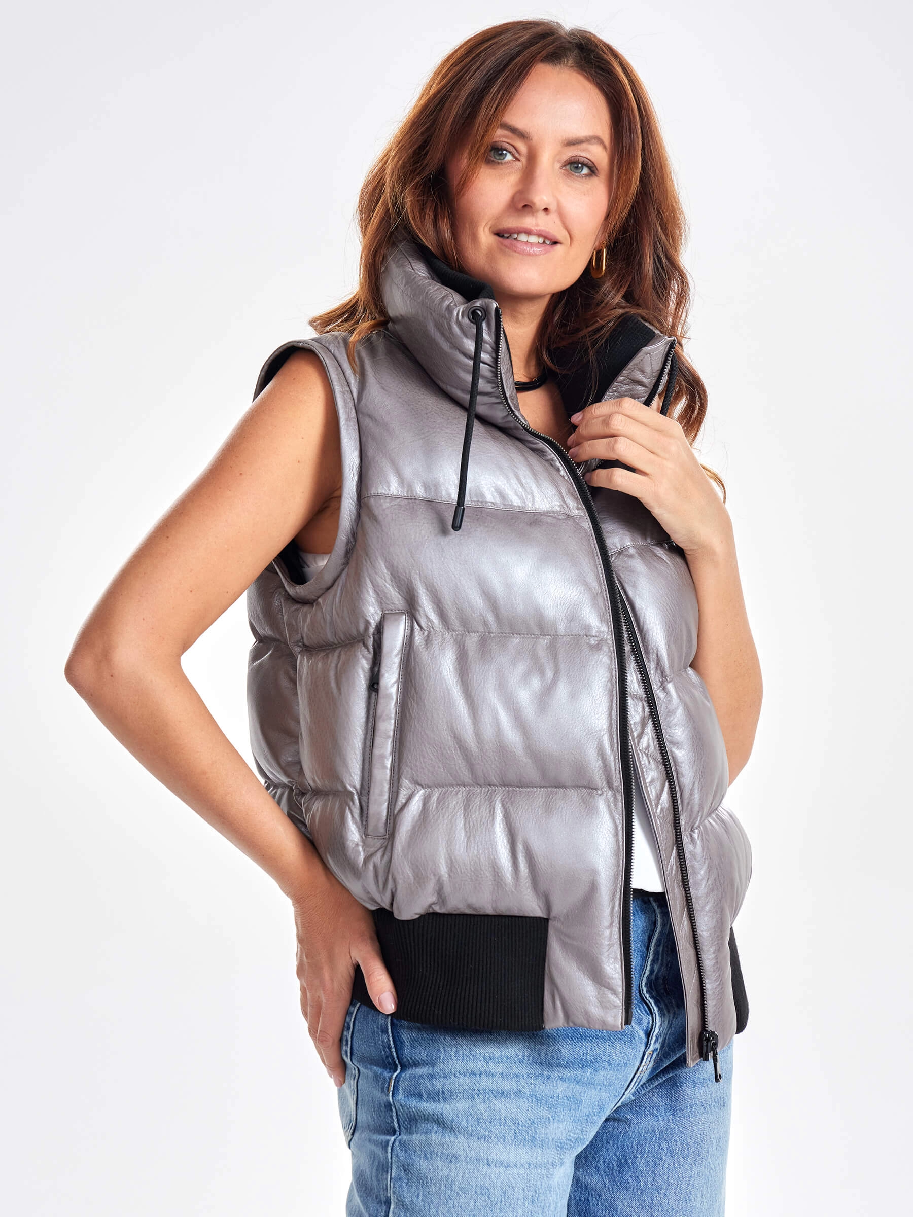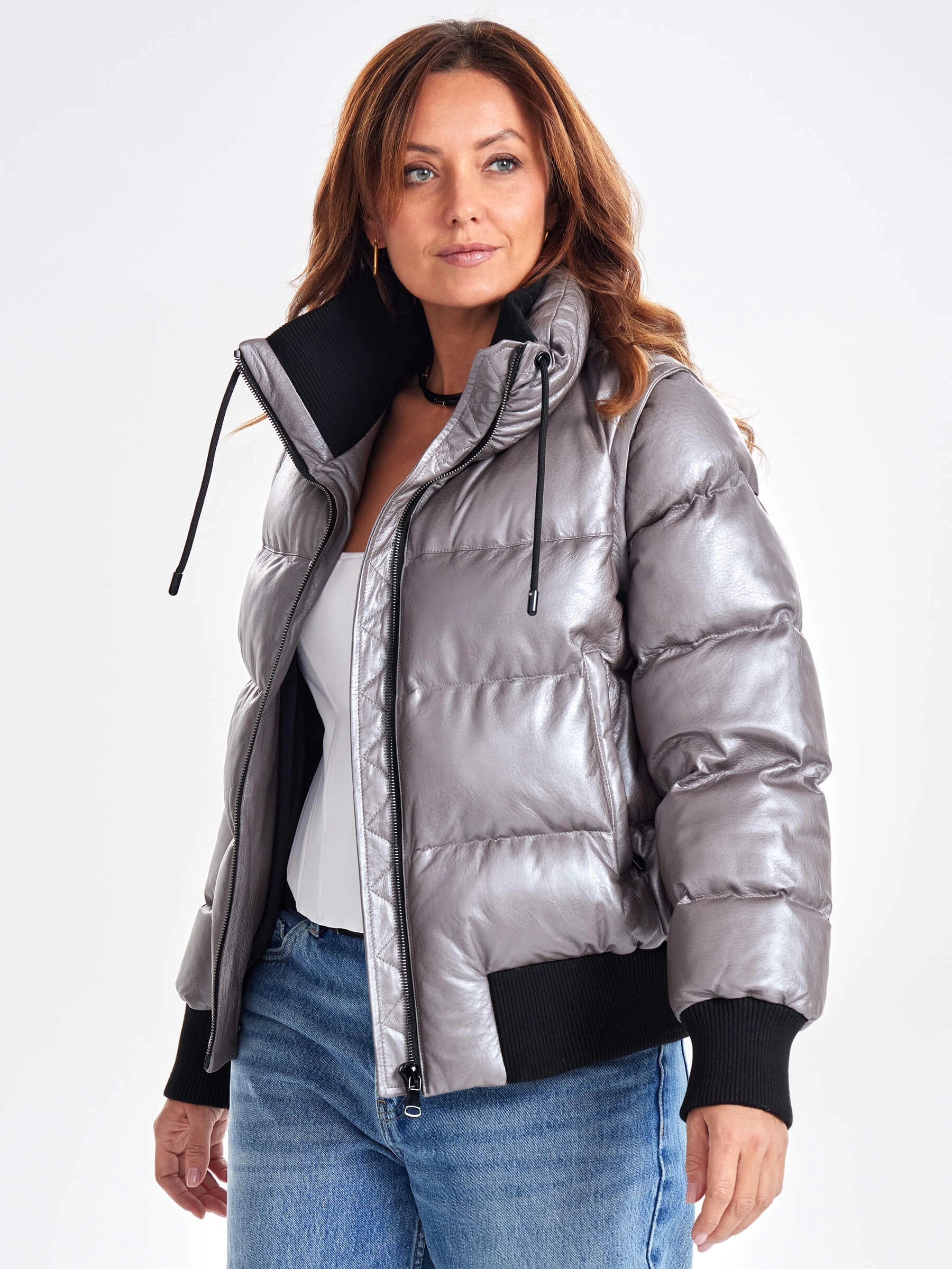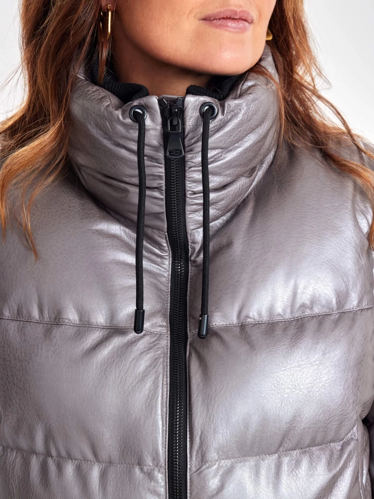 Утепленная стеганая кожаная куртка бомбер премиум класса для женщин 3074, серая, размер 46, артикул 23900