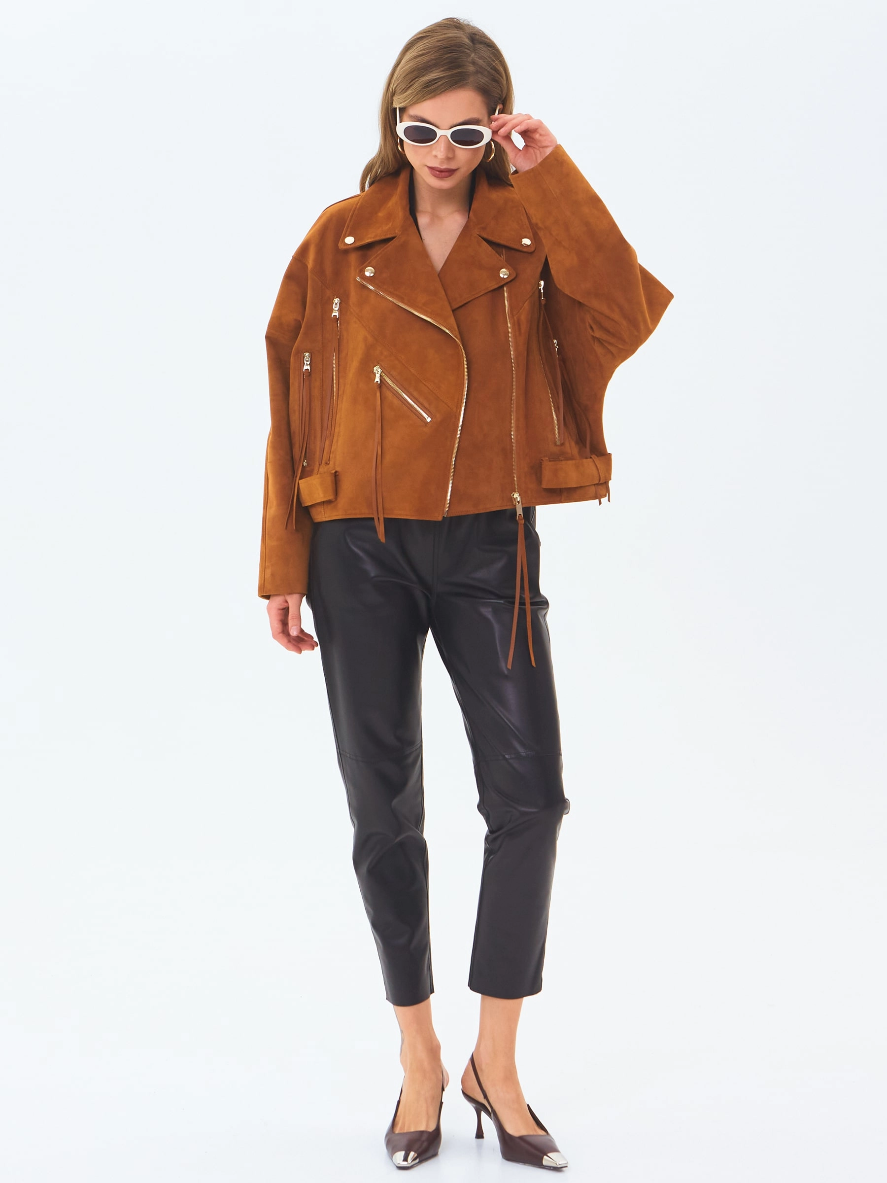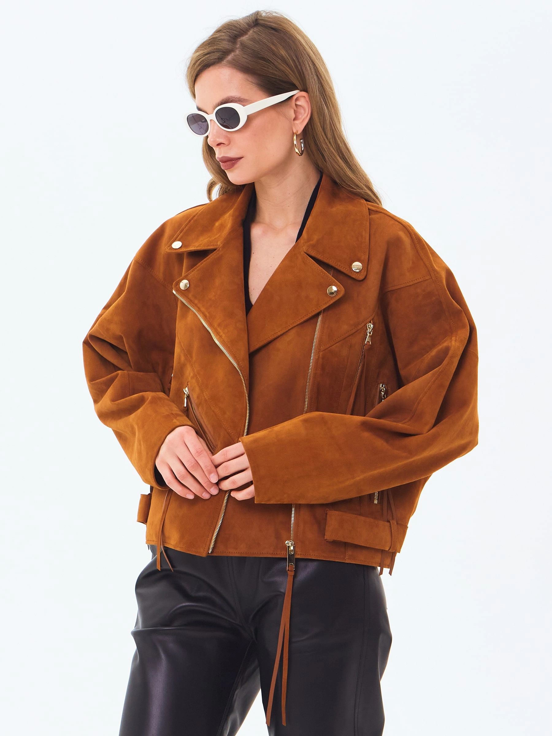 Свободную косуху со спущенной линией плеч пошили из тонкой нежной замши. Именно этот материал создал пластичность и комфорт модели. Изделие дополнили широкими регулируемыми патами множеством молний.