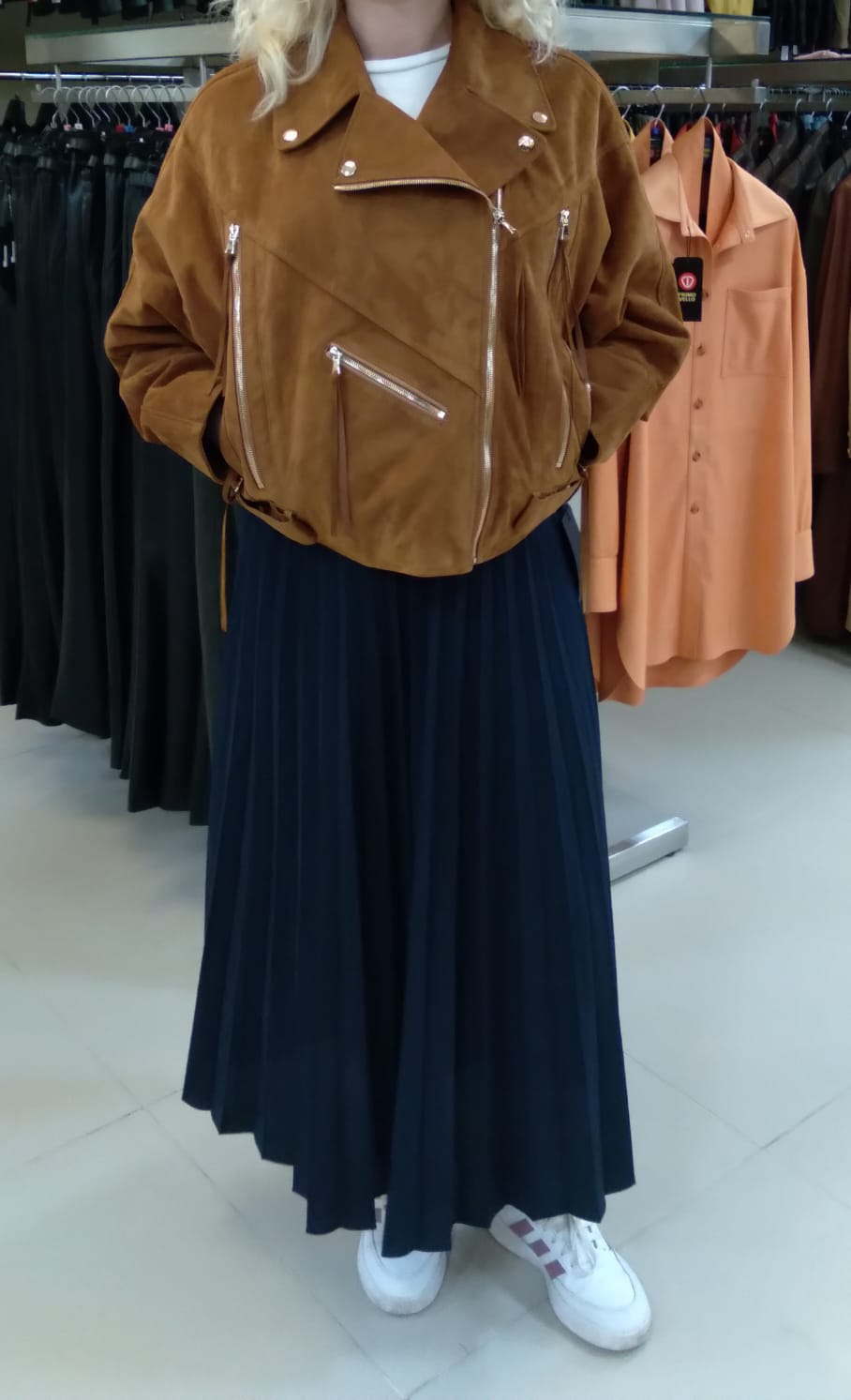 Свободную косуху со спущенной линией плеч пошили из тонкой нежной замши. Именно этот материал создал пластичность и комфорт модели. Изделие дополнили широкими регулируемыми патами множеством молний.