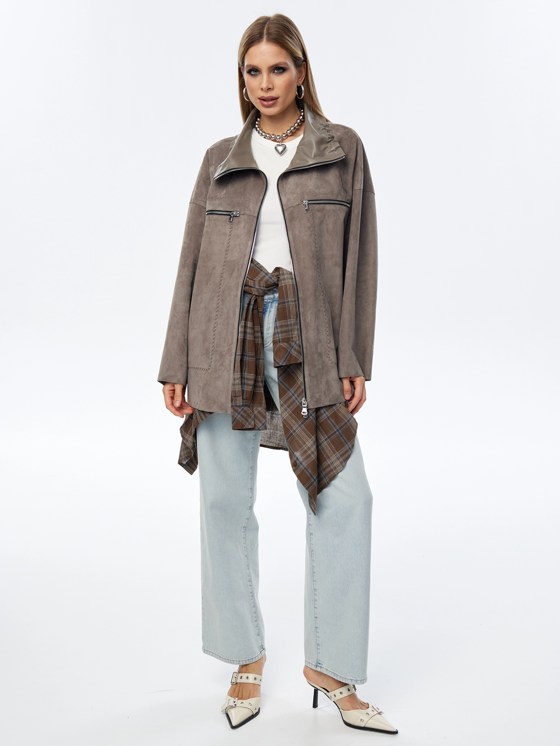 Удлиненная куртка силуэта оверсайз выполненная из тонкой замши подарит не только комфорт, но и подчеркнет женственность. Отложной воротник можно превратить в стойку, закрепив кулисками. Идеальная посадка по фигуре. Для декора использовали зигзагообразный стежок и два нагрудных кармана застегивающиеся как и само изделие крупной молнией серебристого цвета.