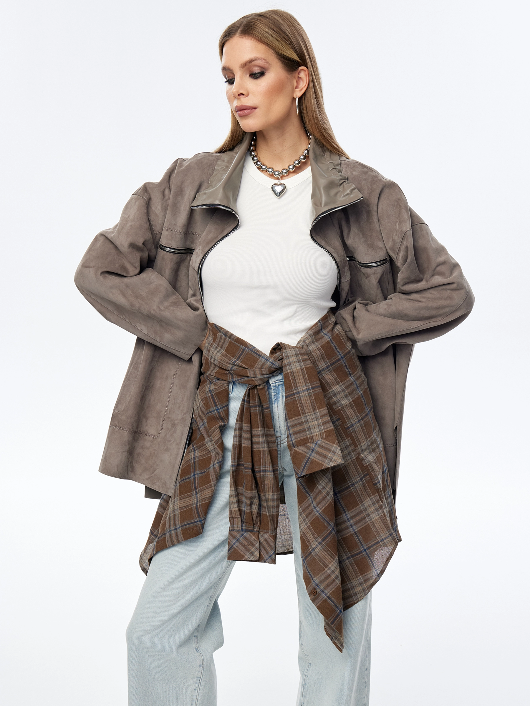 Замшевая куртка оверсайз для женщин премиум класса 3055з, серая, размер 50, артикул 24010