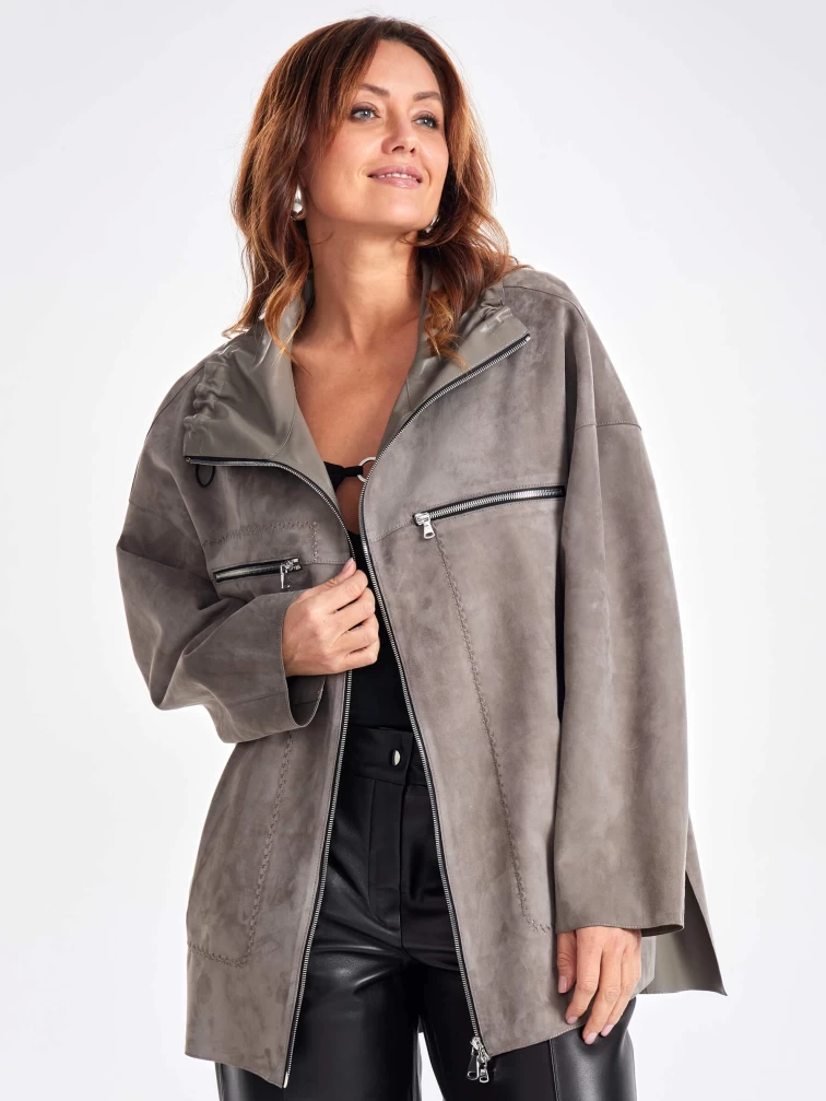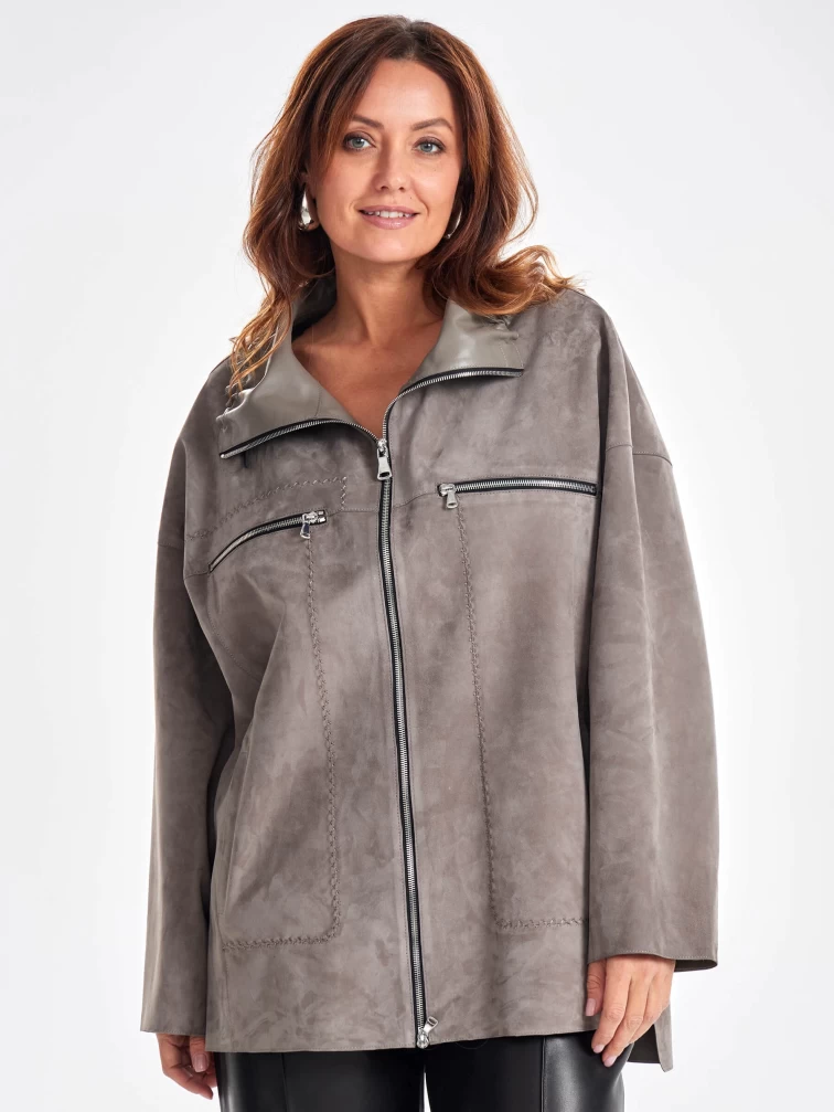 Товар замшевая женская куртка оверсайз на молнии премиум класса 3055з, серая, размер 50, артикул 23500 выполнен из натуральной замши с застежкой молния. Рассчитан на сезон: весна-осень. Длина изделия 80 см, силуэт оверсайз.