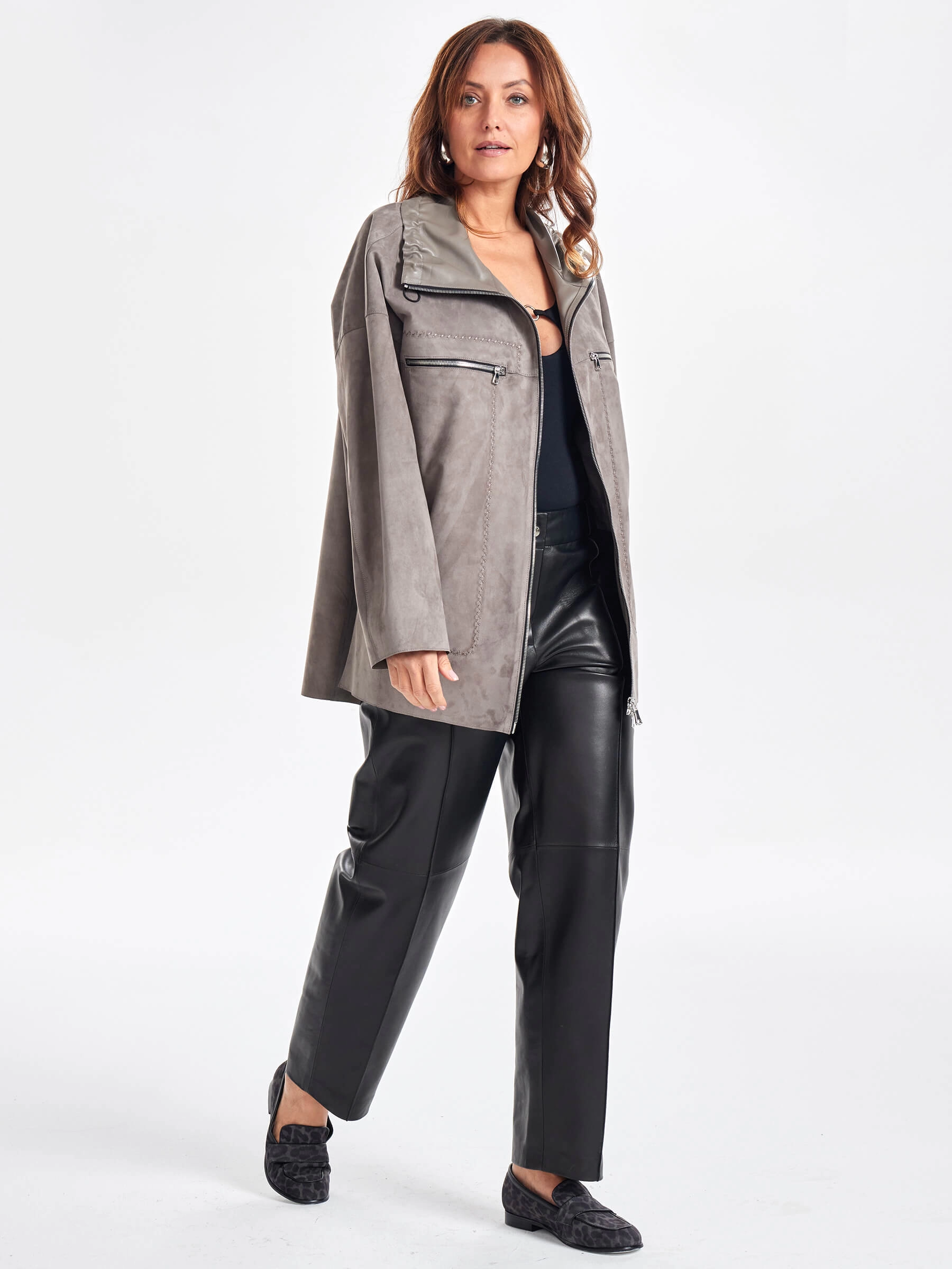 Интересным решением для весеннего гардероба станет куртка выполненная из тонкой замши премиум класса. Свободный крой, регулируемый воротник можно трансформировать в высокую стойку. Для декора использовали зигзагообразный стежок и два нагрудных кармана застегивающиеся как и само изделие крупной молнией в цвете серебро.