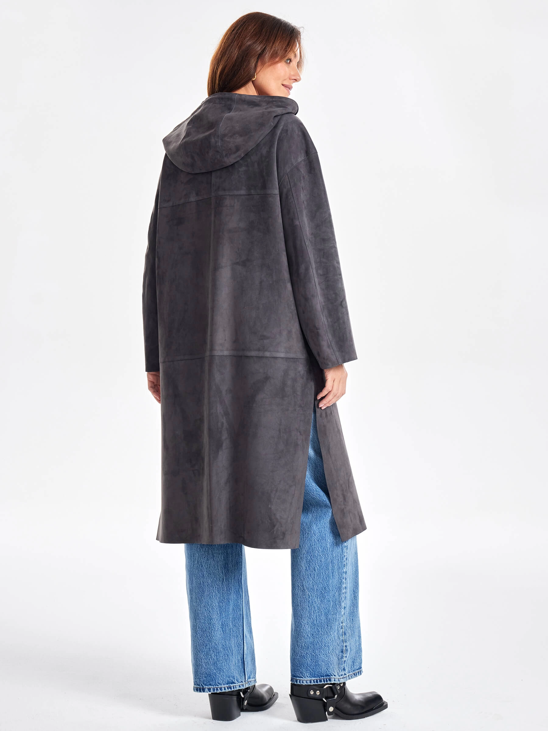 Для пальто свободного силуэта премиум класса, мастера использовали тонкую натуральную замшу. Модель комфортно садится по фигуре, не сковывает движения. За декор изделия с регулируемым капюшоном отвечают два небольших нагрудных кармана и боковые разрезы.