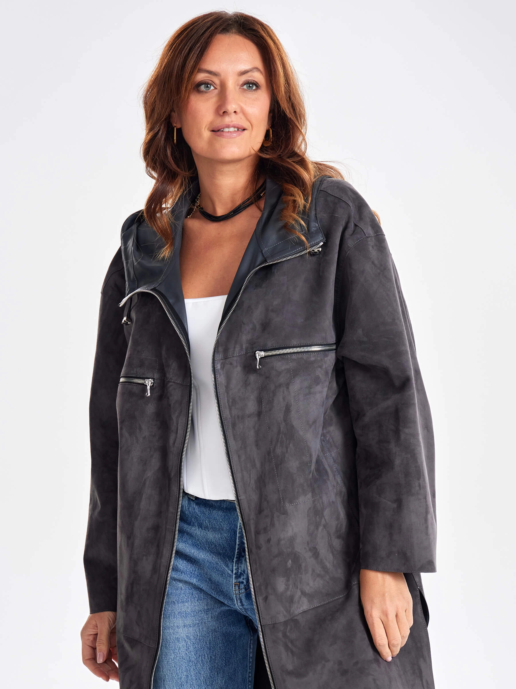 Товар замшевое женское пальто оверсайз с капюшоном на молнии премиум класса 3058з, темно-серое, размер 50, артикул 25690 выполнен из натуральной замши с застежкой молния. Рассчитан на сезон: весна-лето. Длина изделия 110 см, силуэт оверсайз.