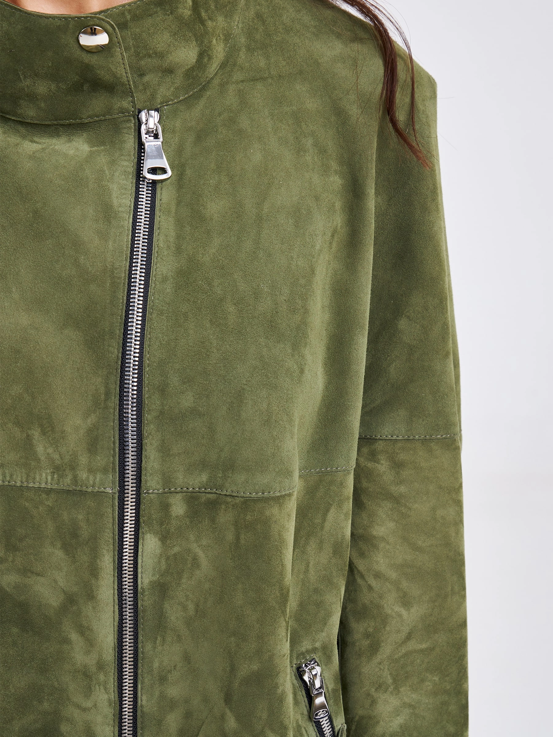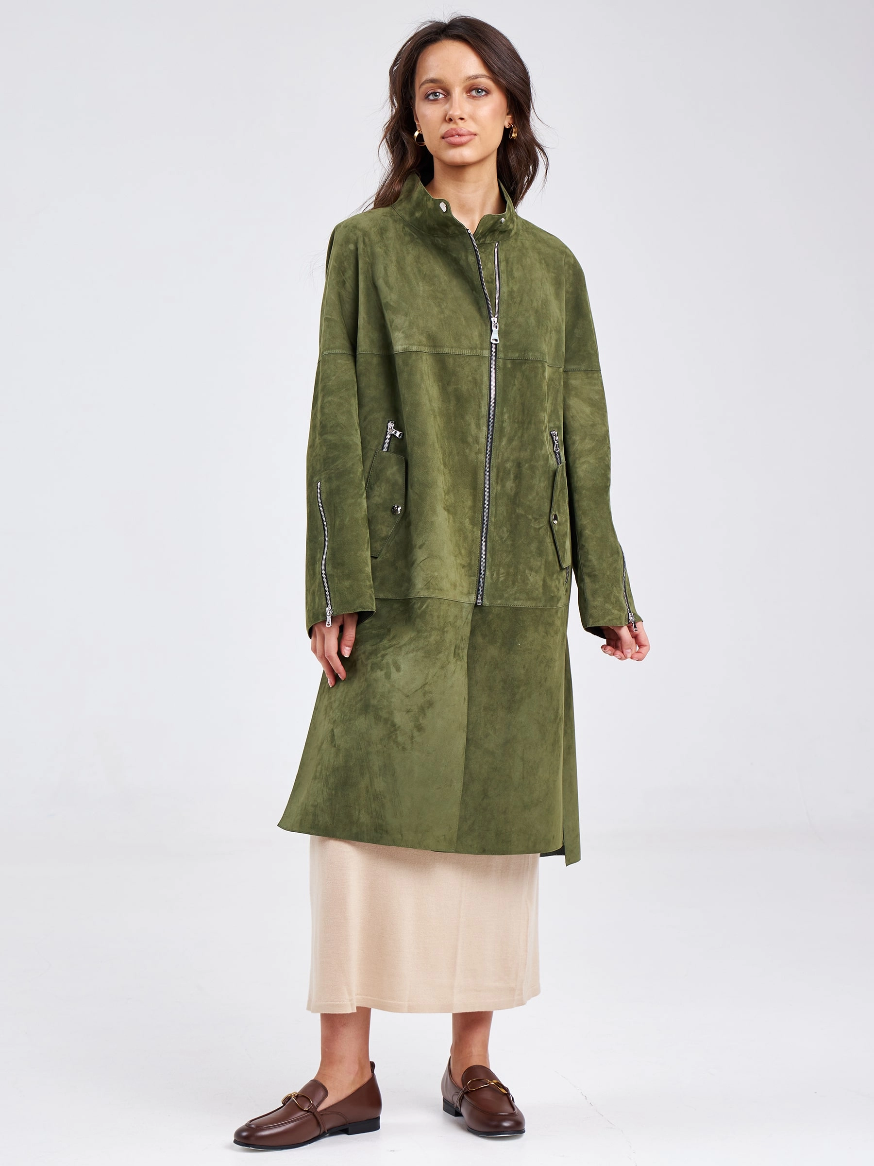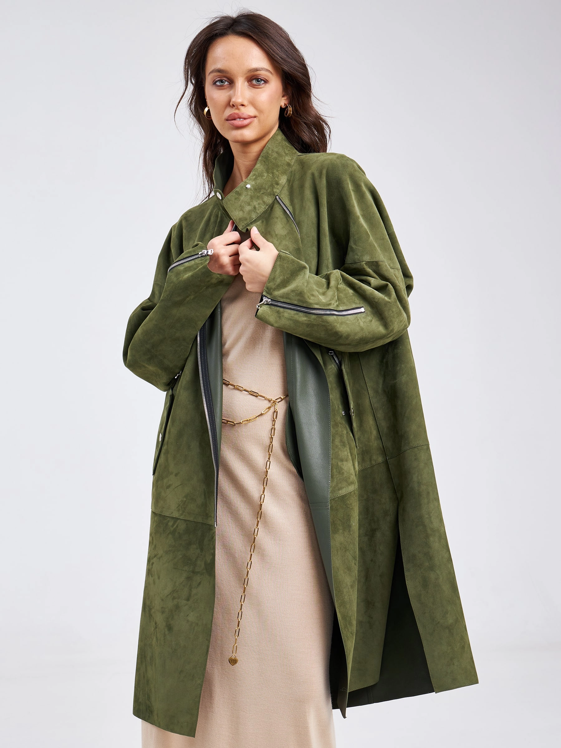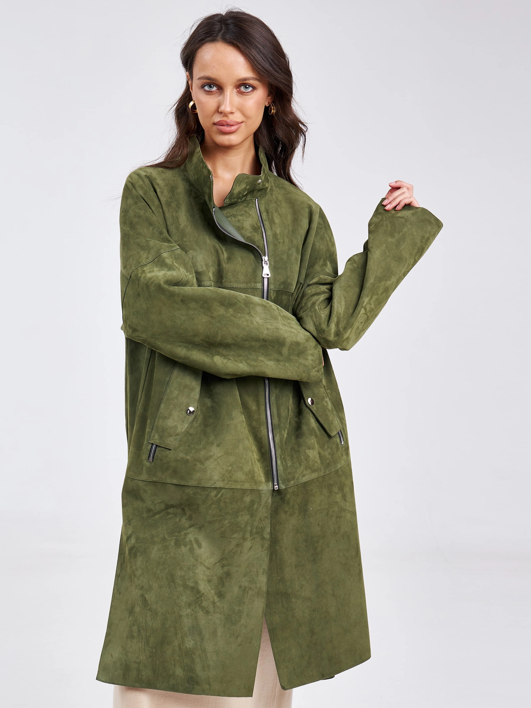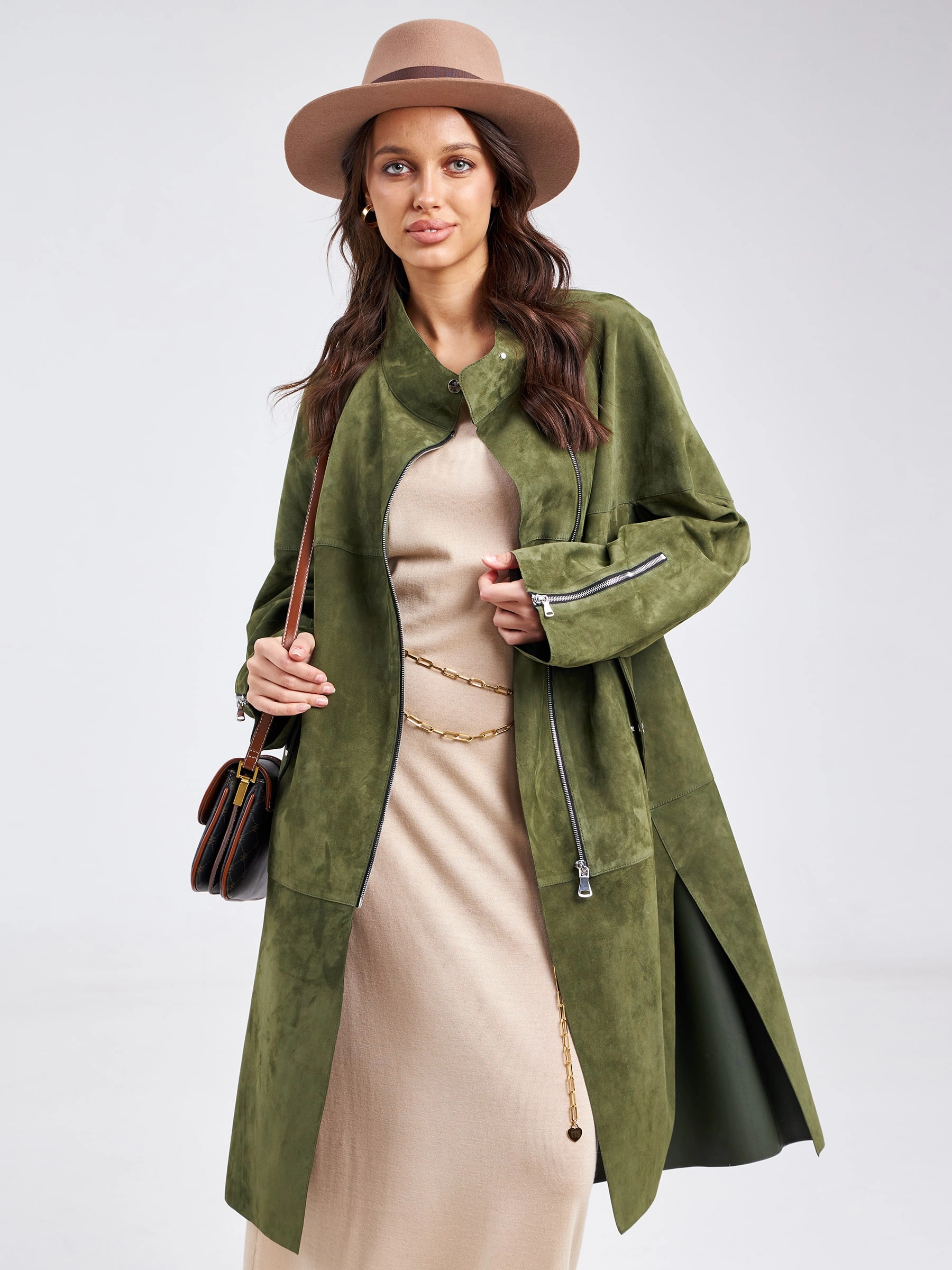 Замшевый женский плащ на молнии премиум класса 3041, хаки, размер 46, артикул 91910