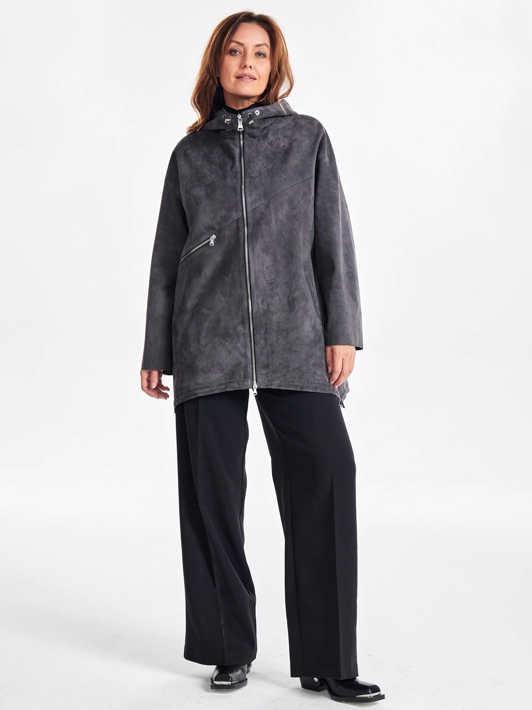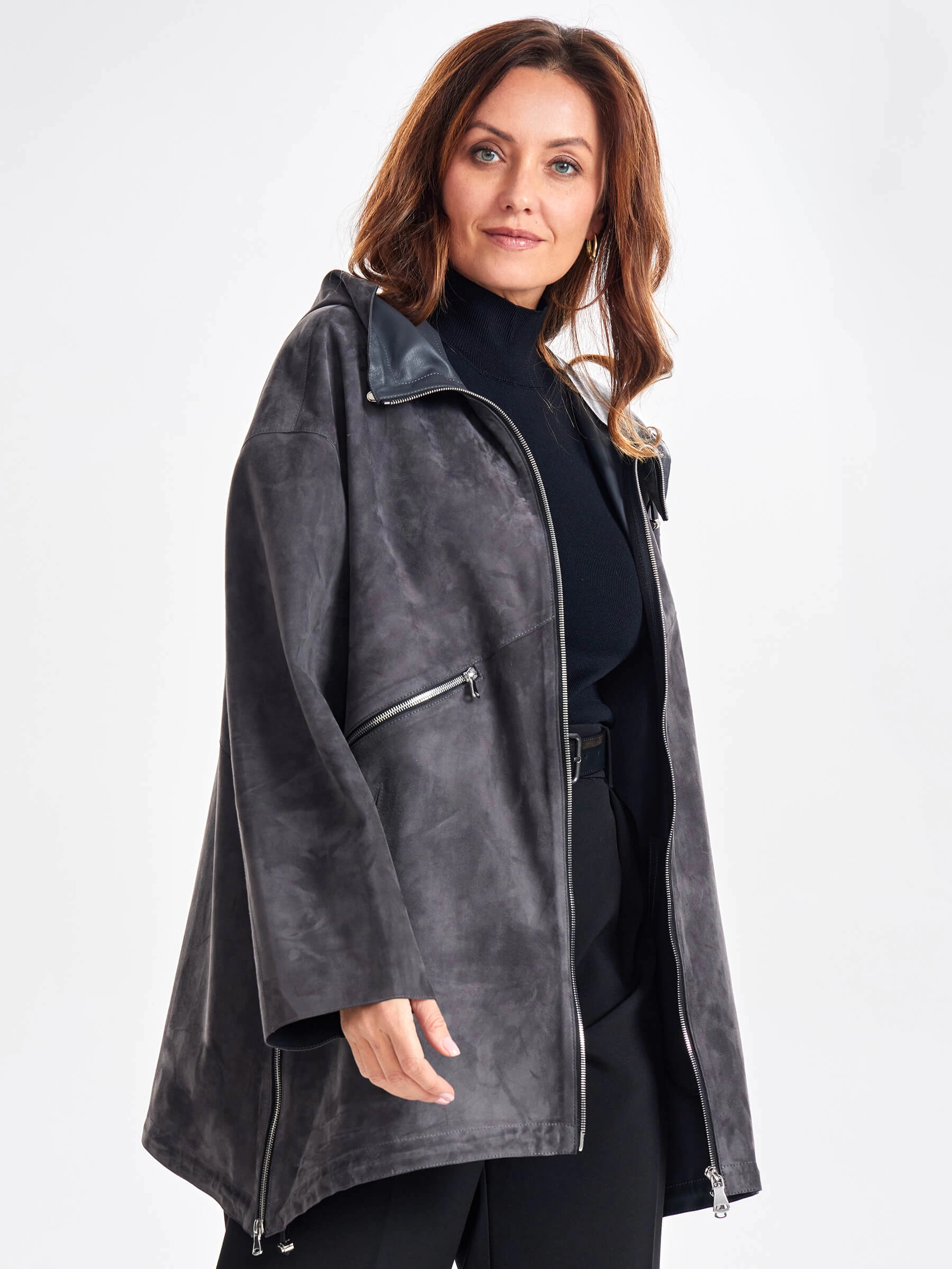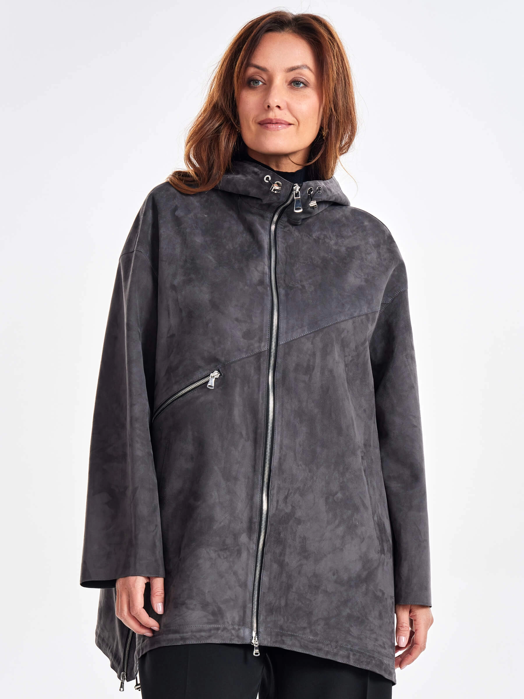 Этот стиль подойдет дамам любого возраста. Главная черта этой куртки комфорт и только комфорт! Для пошива модели с регулируемыми глубоким капюшоном и низом, мастера использовали нежную натуральную замшу премиум класса. Свободный крой, два врезных кармана, боковые разрезы как и сама модель застегиваются крупными молниями. Акцент сделали на асимметричный декоративный карман.