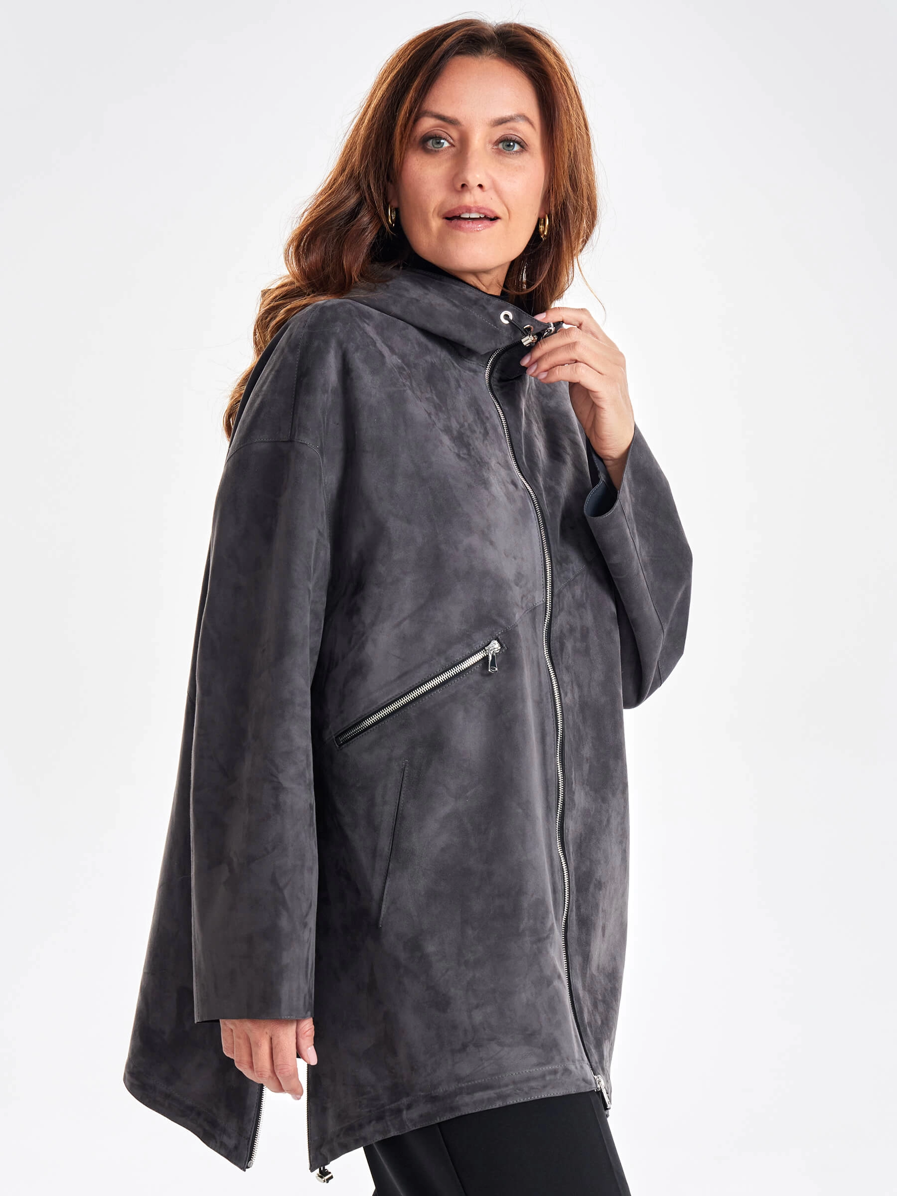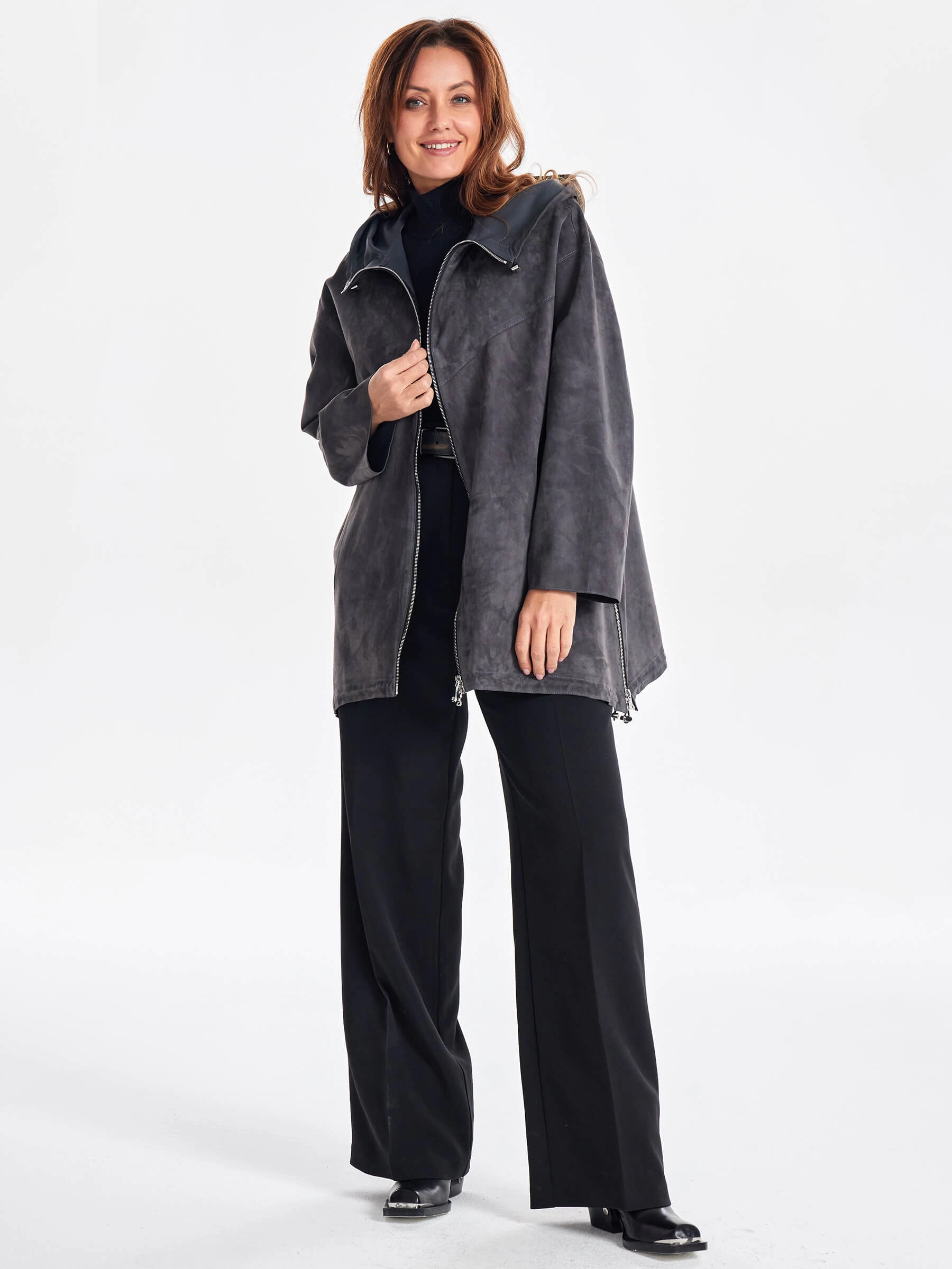 Замшевый женский плащ оверсайз на молнии с капюшоном премиум класса 3053з, темно-серый, размер 48, артикул 23480