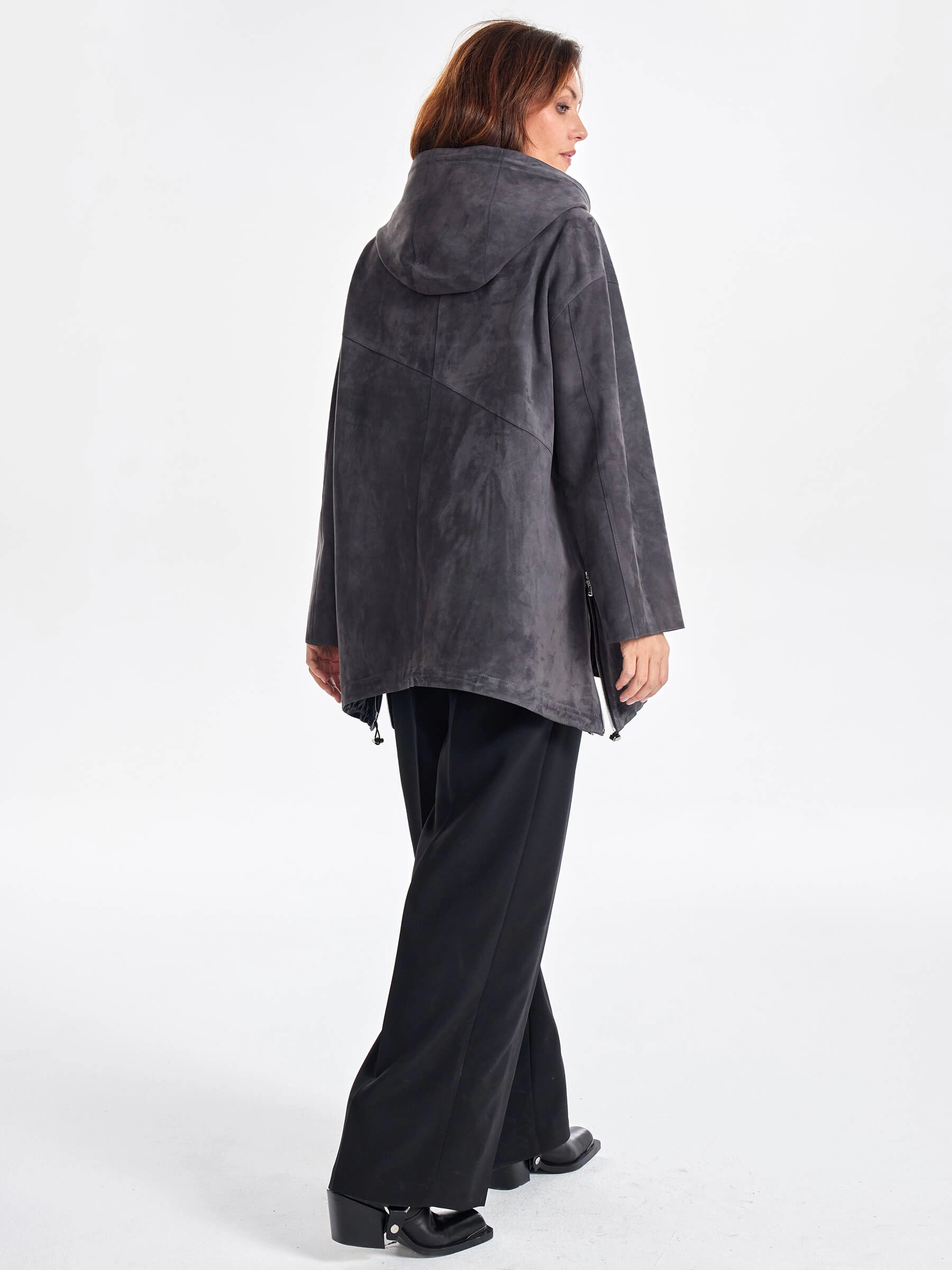 Товар замшевый женский плащ оверсайз на молнии с капюшоном премиум класса 3053з, темно-серый, размер 48, артикул 23480 выполнен из натуральной замши с застежкой молния. Рассчитан на сезон: весна-лето. Длина изделия 75 см, силуэт оверсайз.