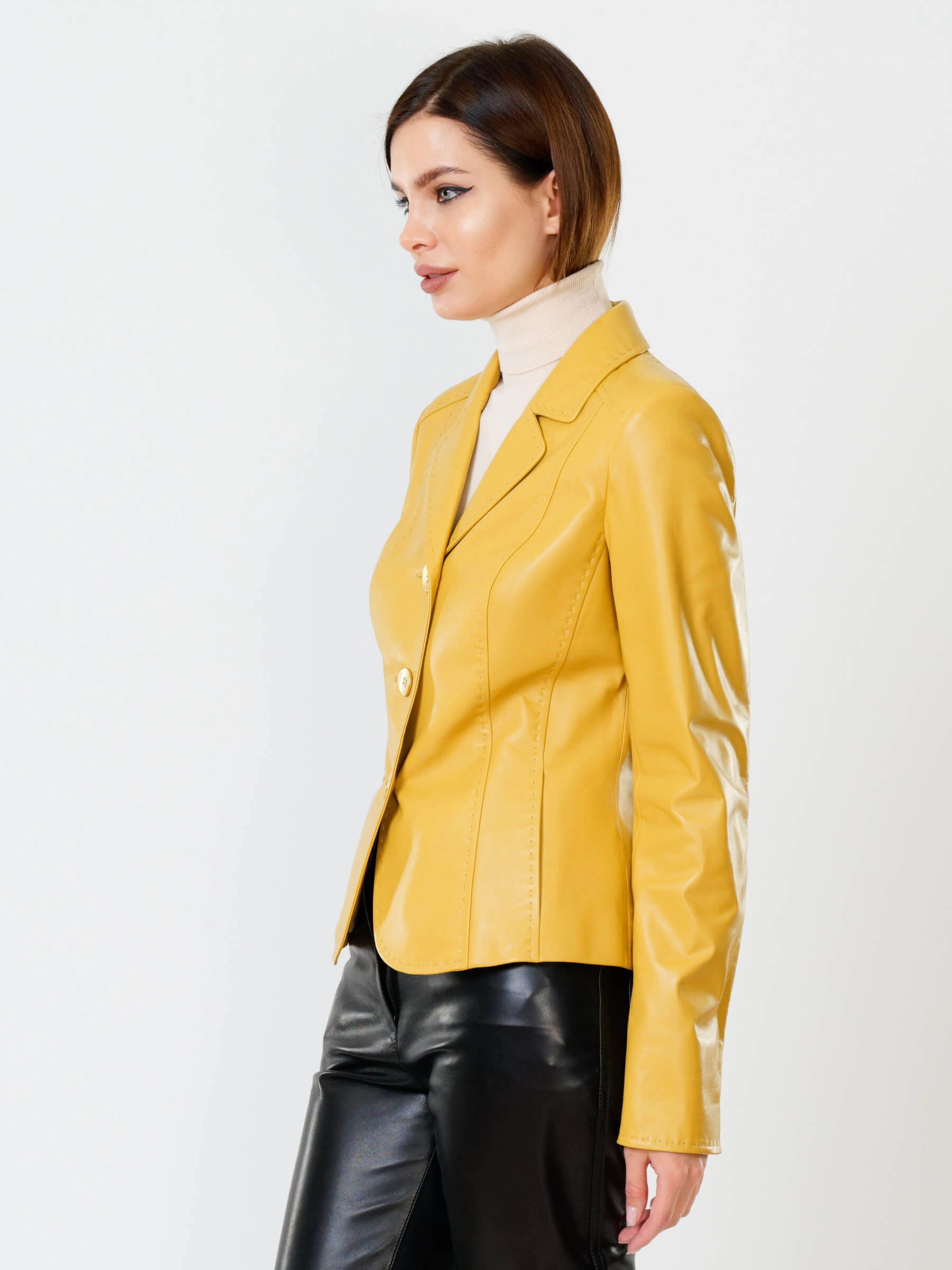 Изысканный кожаный пиджак длиной 50 см с полуприлегающим силуэтом и английским воротником: роскошная натуральная жёлтая кожа с ручной стежкой и врезными карманами создаёт безупречную посадку, а классическая застёжка на пуговицах подчёркивает элегантность. Носите с кожаными брюками для монохромного образа, с шёлковыми платьями для контраста текстур или с джинсами для смарт-кэжуал — этот пиджак станет универсальной основой вашего гардероба!