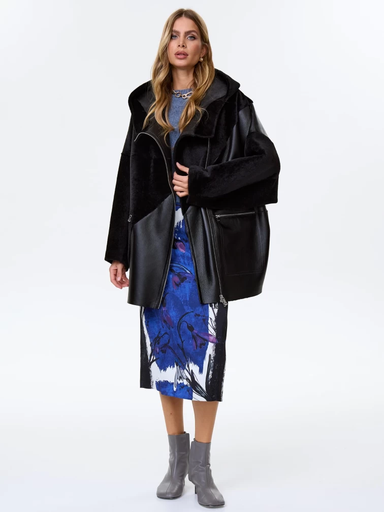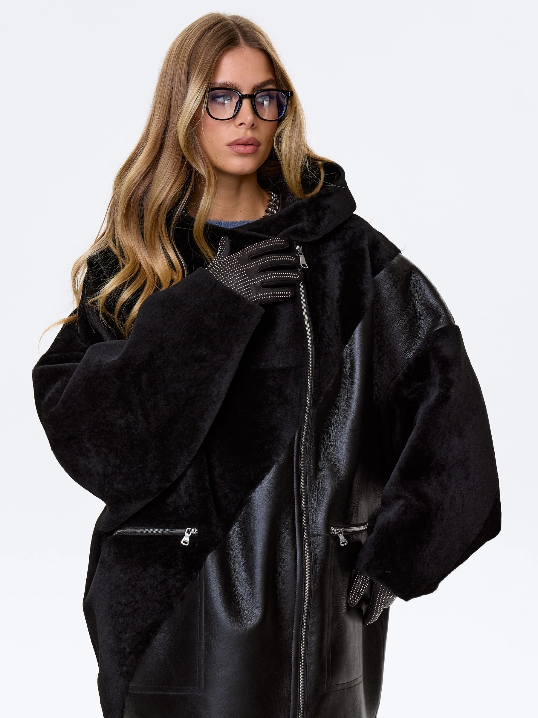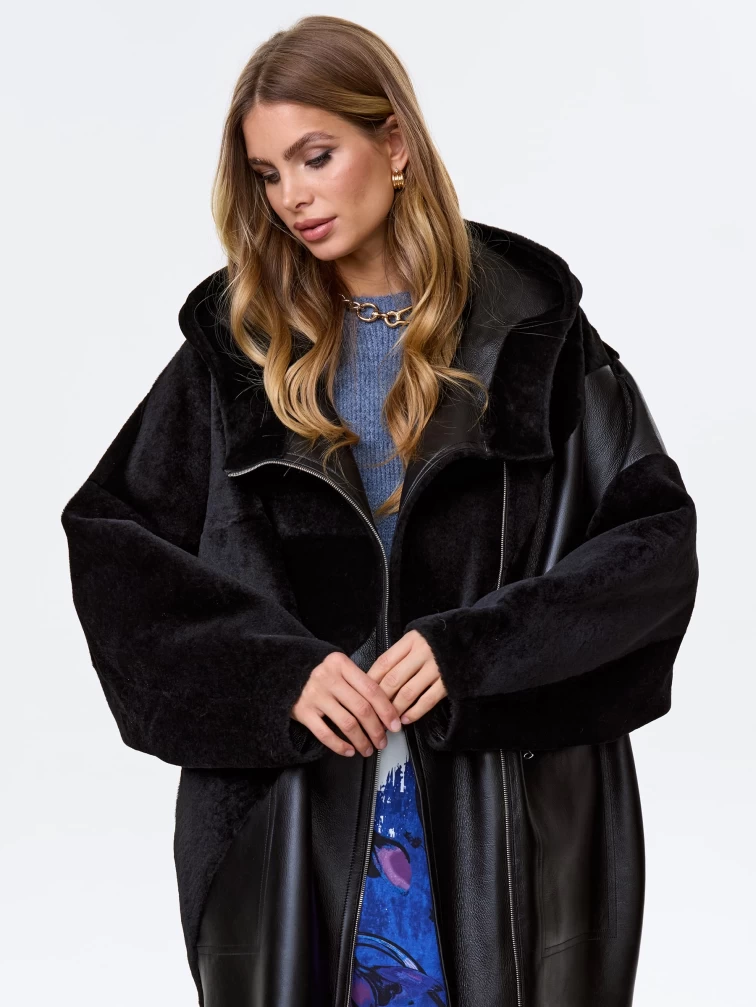 Женская дубленка оверсайз с капюшоном премиум класса 2055, черная, размер 48, артикул 62450