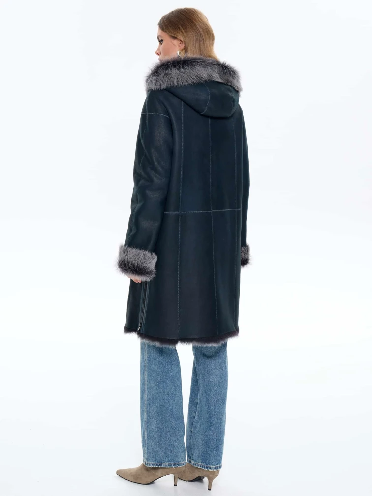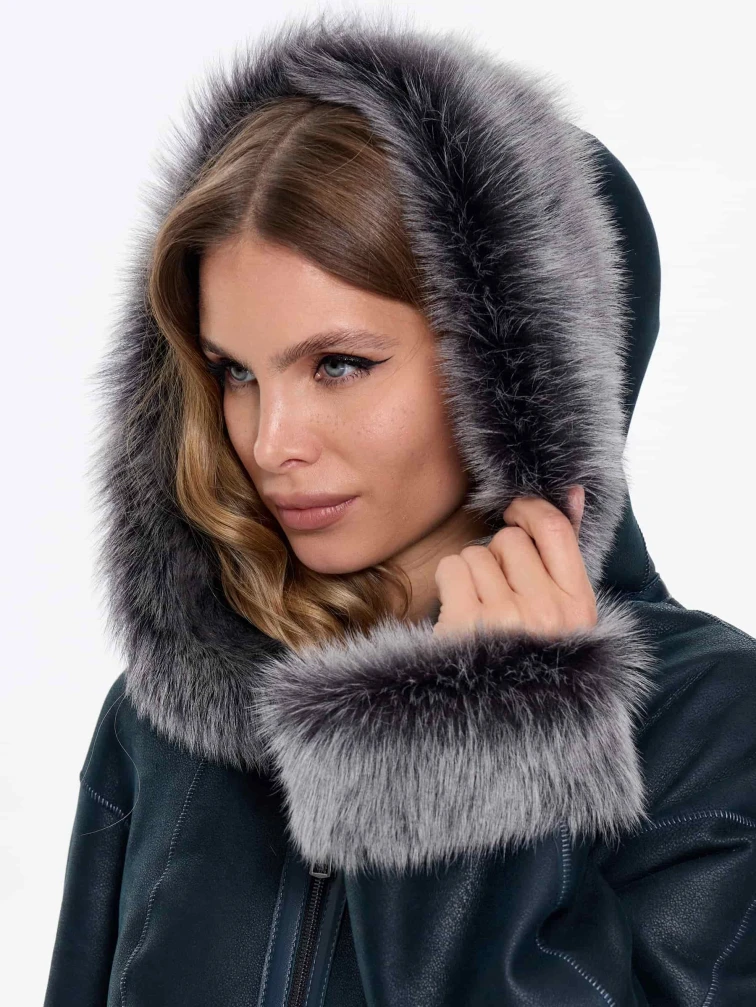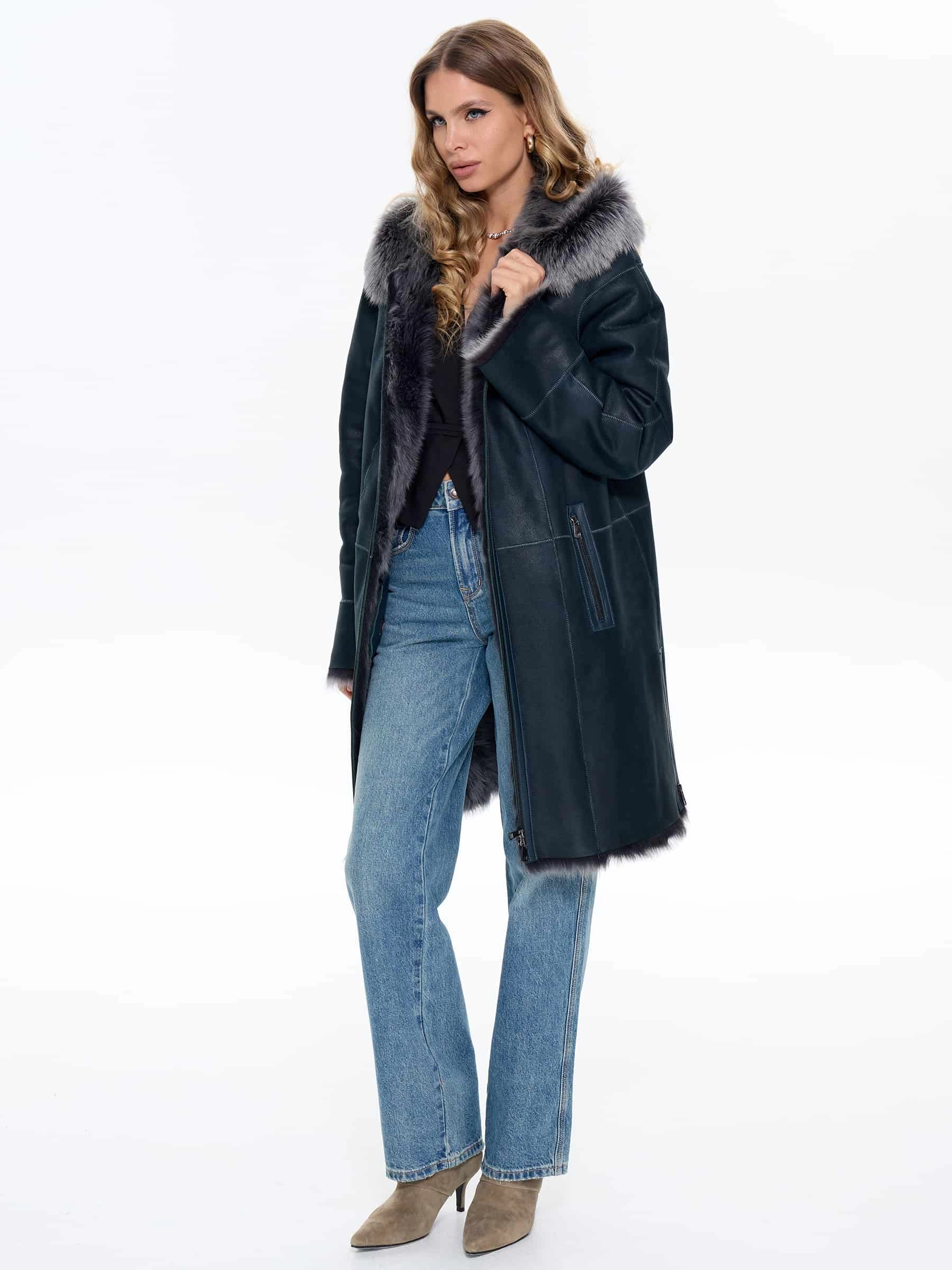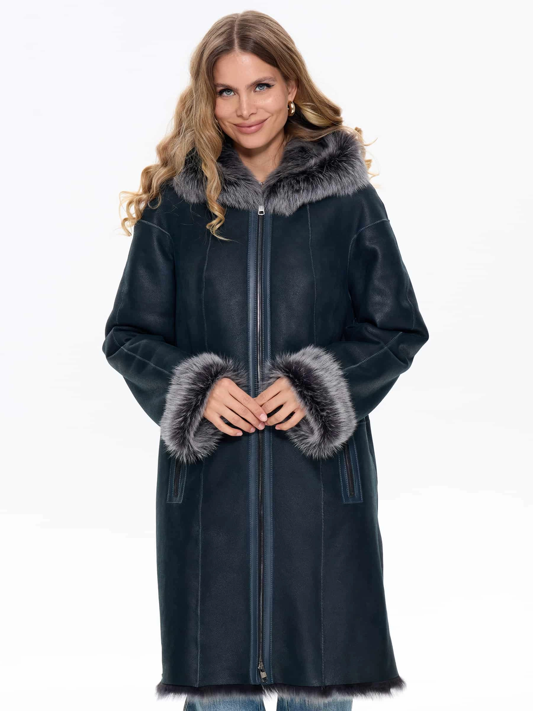 Женская дубленка с капюшоном из тосканы 2067, синяя, размер 48, артикул 64740