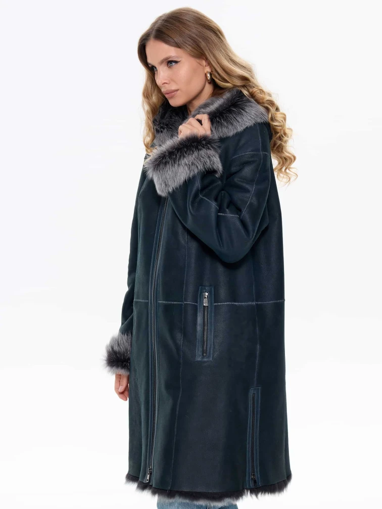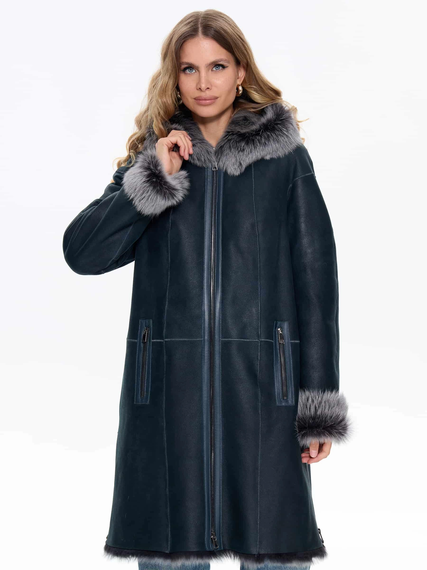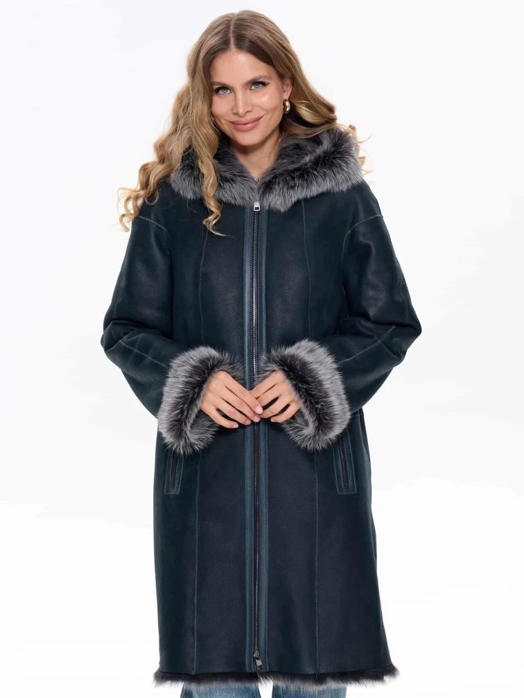 Товар женская дубленка с капюшоном из тосканы 2067, синяя, размер 48, артикул 64740 выполнен из овчина "тоскана" с застежкой молния. Рассчитан на сезон: зима. Длина изделия 95 см, силуэт полуприлегающий.