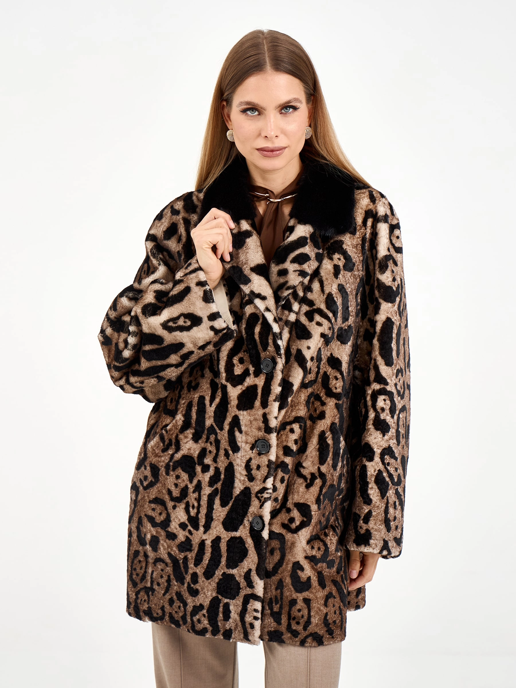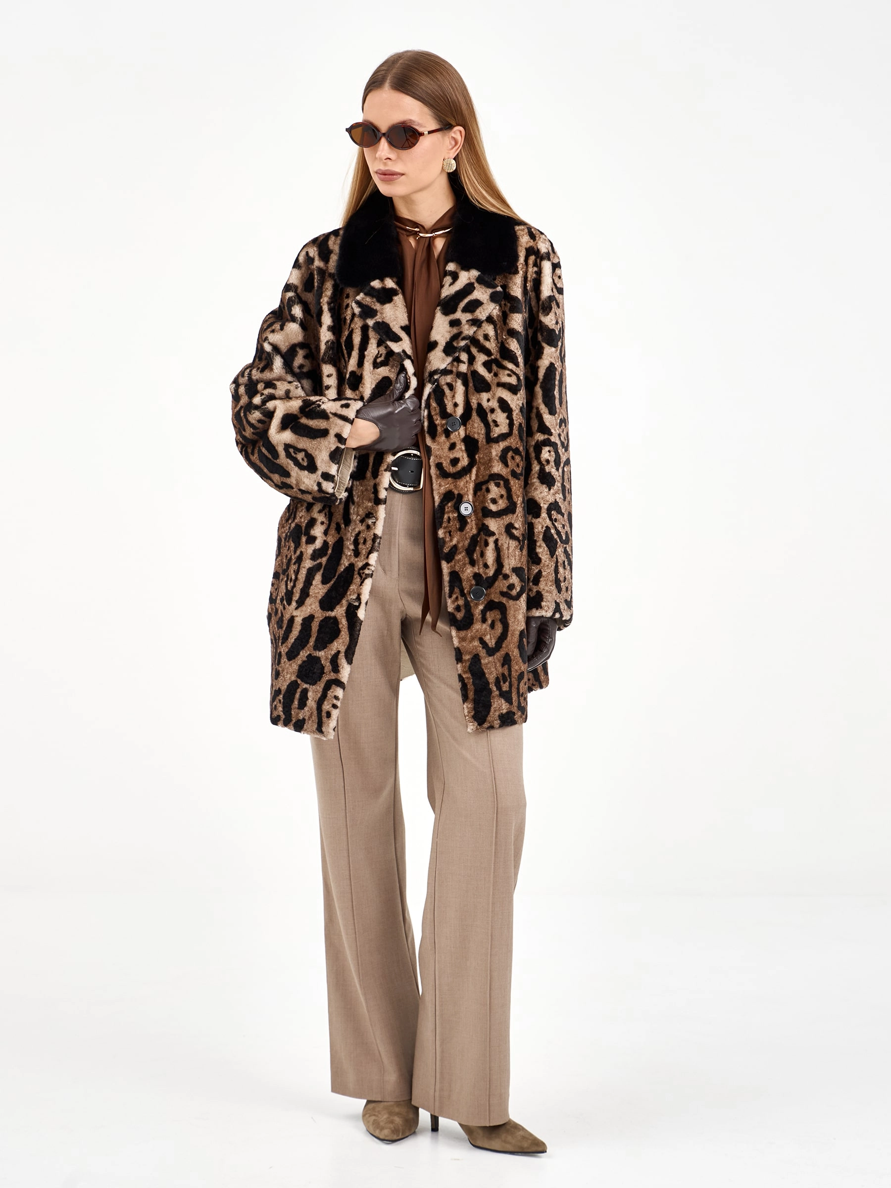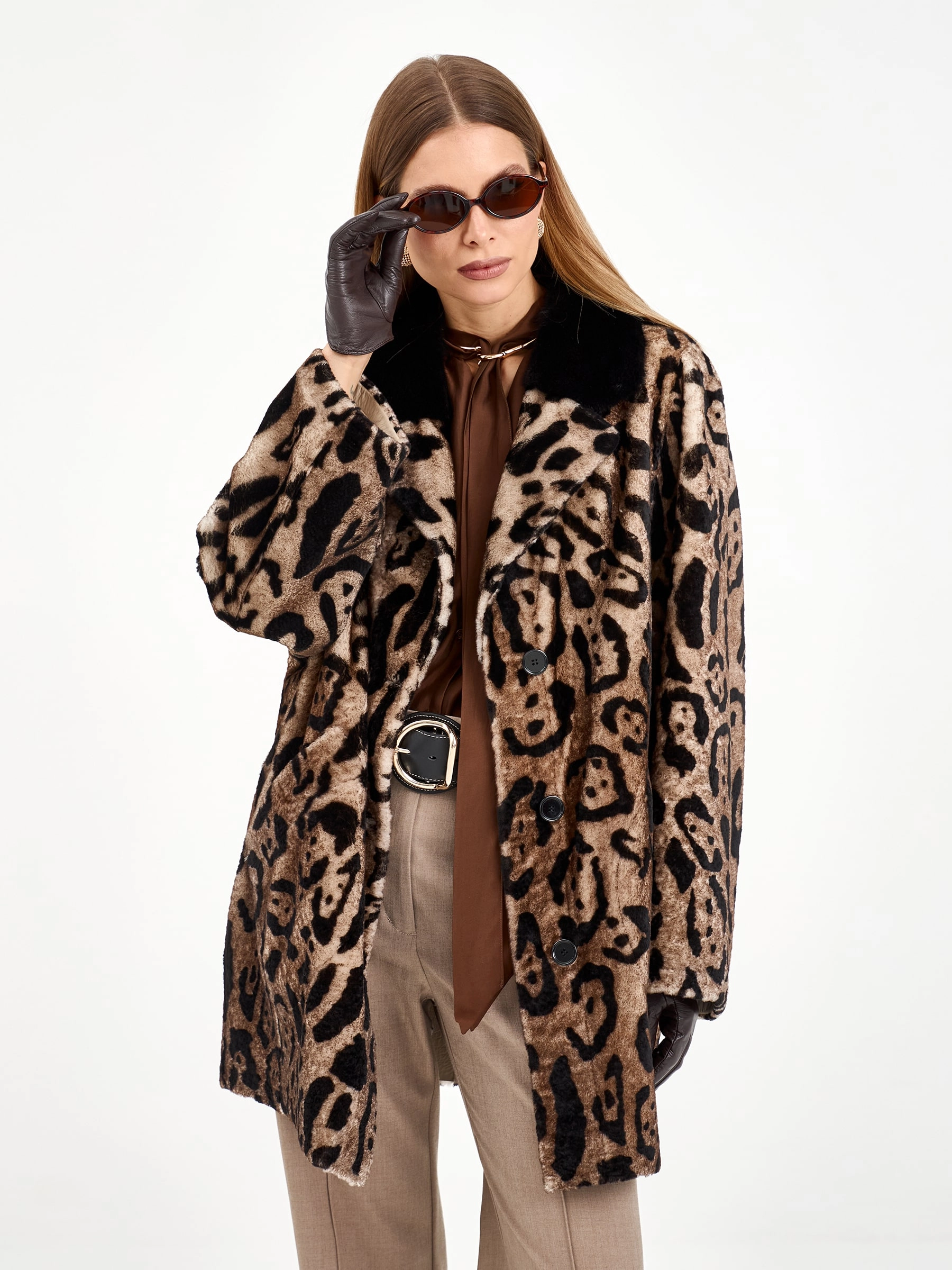 Эта удлиненная дубленка свободного кроя из натуральной овчины с леопардовым принтом сочетает в себе дерзость и элегантность. Английский воротник с отделкой из меха норки и лацканы из овчины под леопарда создают игру фактур. Рекомендация: наденьте ее с однотонной основой — темными джинсами, водолазкой и сапогами на каблуке, чтобы образ получился стильным и сбалансированным. Идеальная модель для создания модного образа с акцентом.