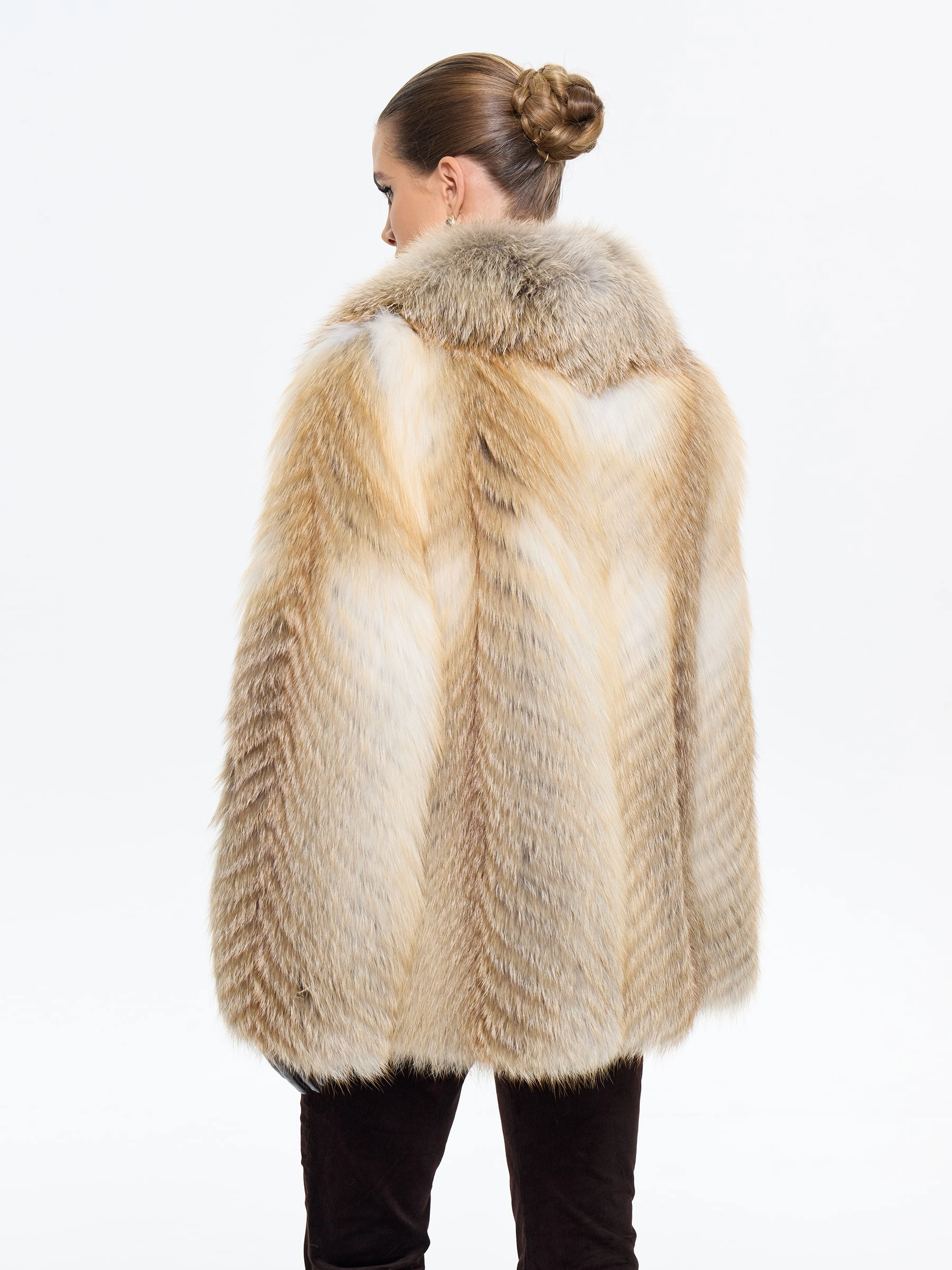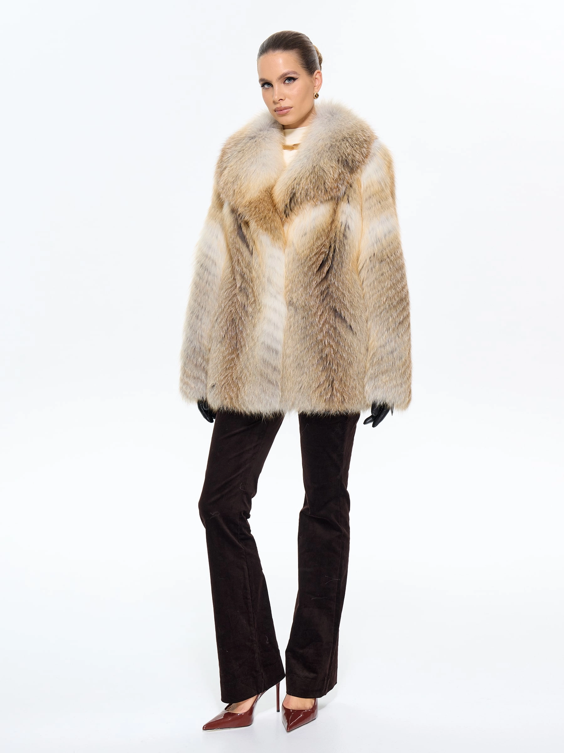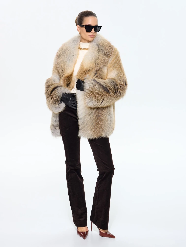 Эффектная шуба из меха лисы без капюшона с роскошным английским воротником бросает вызов обыденности! Модель свободного кроя длиной 80 см с драматичными рукавами кимано и выразительным силуэтом пончо создает образ смелой эстетики. Пояс в комплекте позволяет менять стиль от дерзкого до утонченного. Стилисты советуют носить эту модель с кожаными леггинсами и ботфортами для дерзкого вечернего образа или с объемным свитером и грубыми ботинками в стиле оверсайз — эта шуба станет главным акцентом вашего гардероба, подчеркивающим бескомпромиссный вкус и королевскую роскошь.