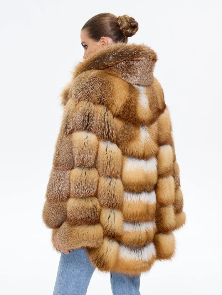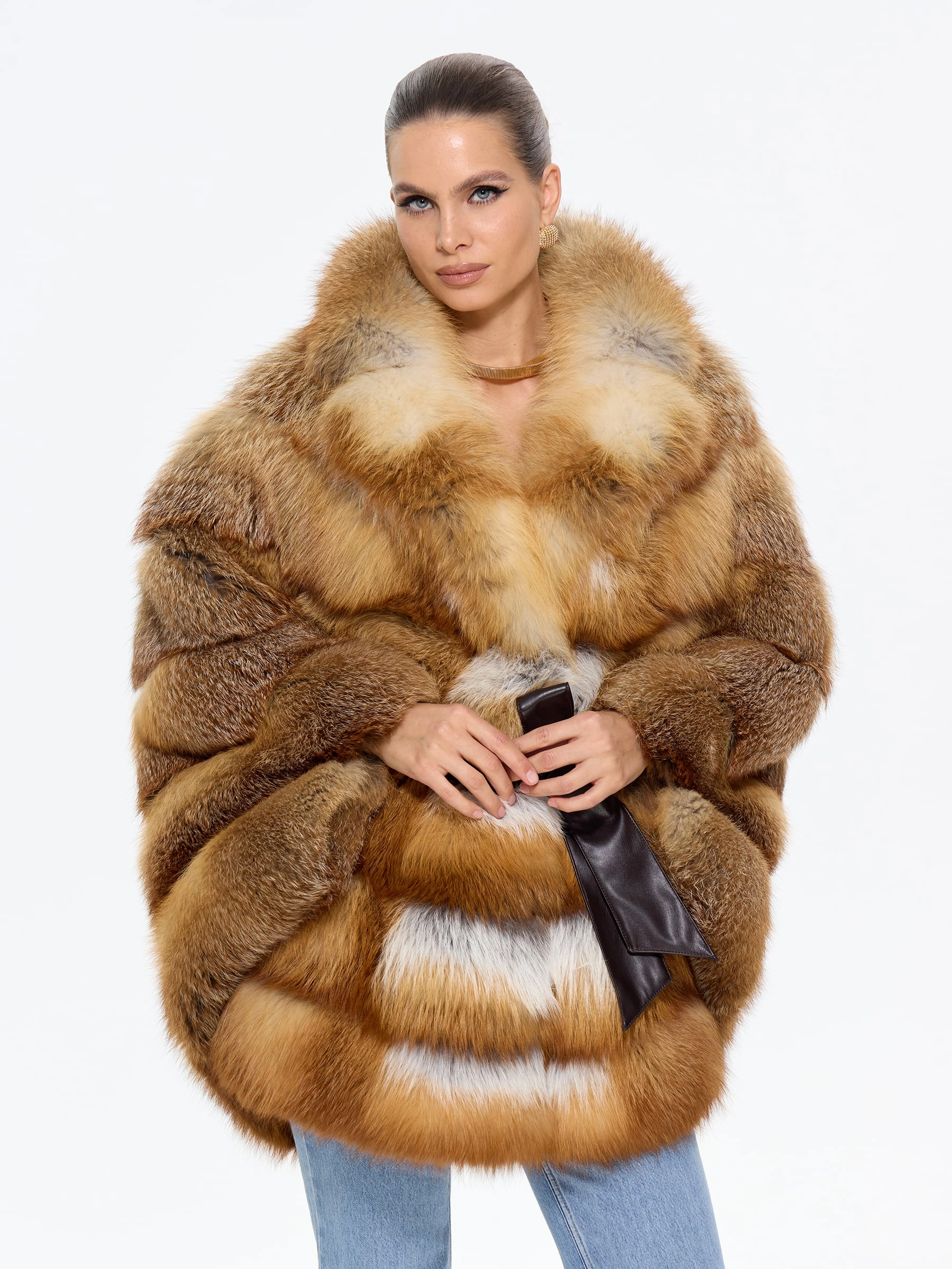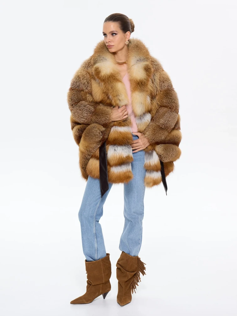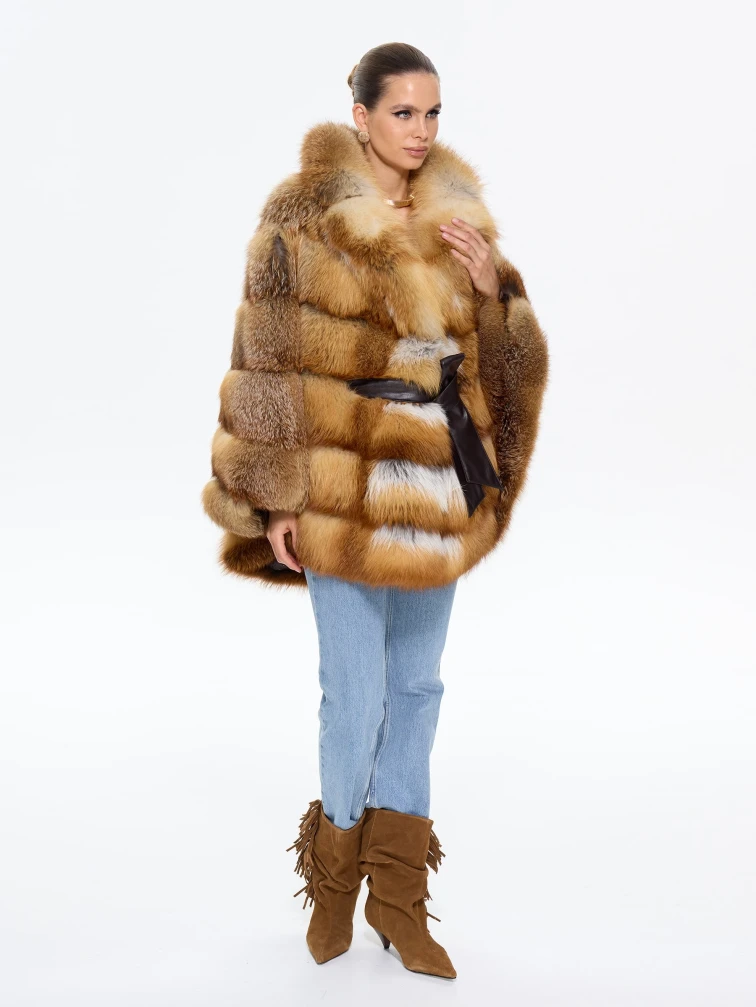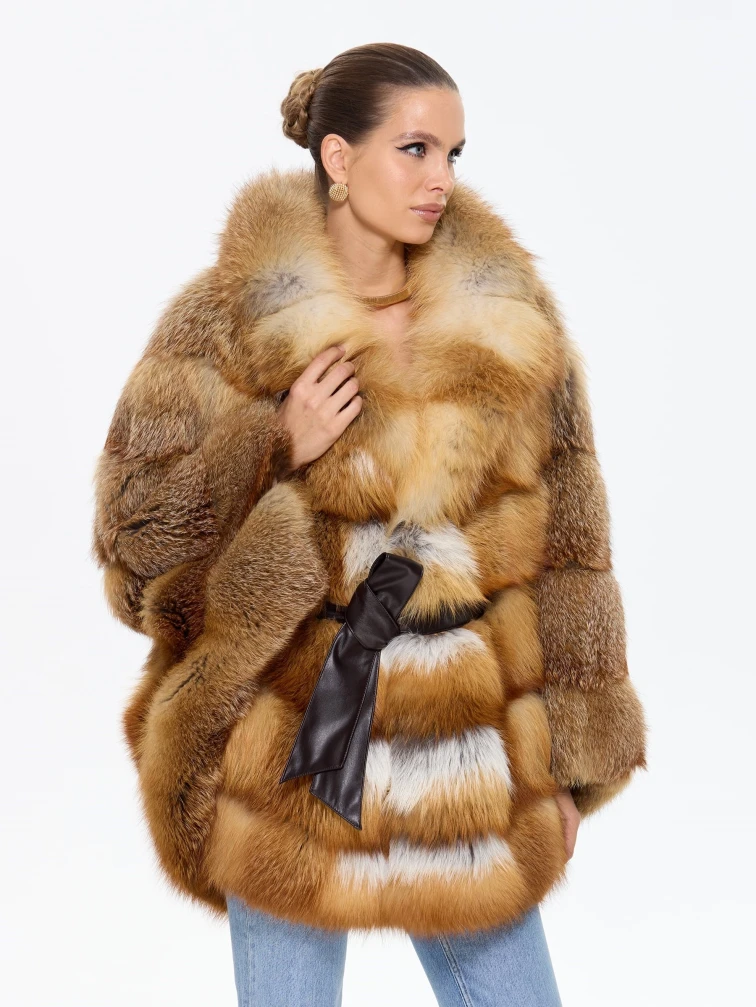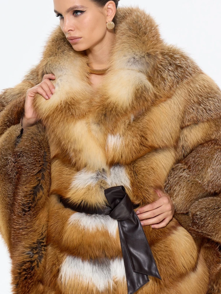 Элегантная шуба из роскошного меха лисы рыжего оттенка выполнена в свободном крое длиной 80 см с классическим английским воротником и рукавами кимано. Модель без капюшона с врезными карманами идеально сочетает в себе уют и стиль. Стилисты рекомендуют носить эту эффектную шубу с узкими джинсами и ковбойскими сапогами для повседневного образа или с однотонным платьем-миди и замшевыми ботильонами для вечернего выхода — ее яркий цвет и современный силуэт создадут запоминающийся образ.