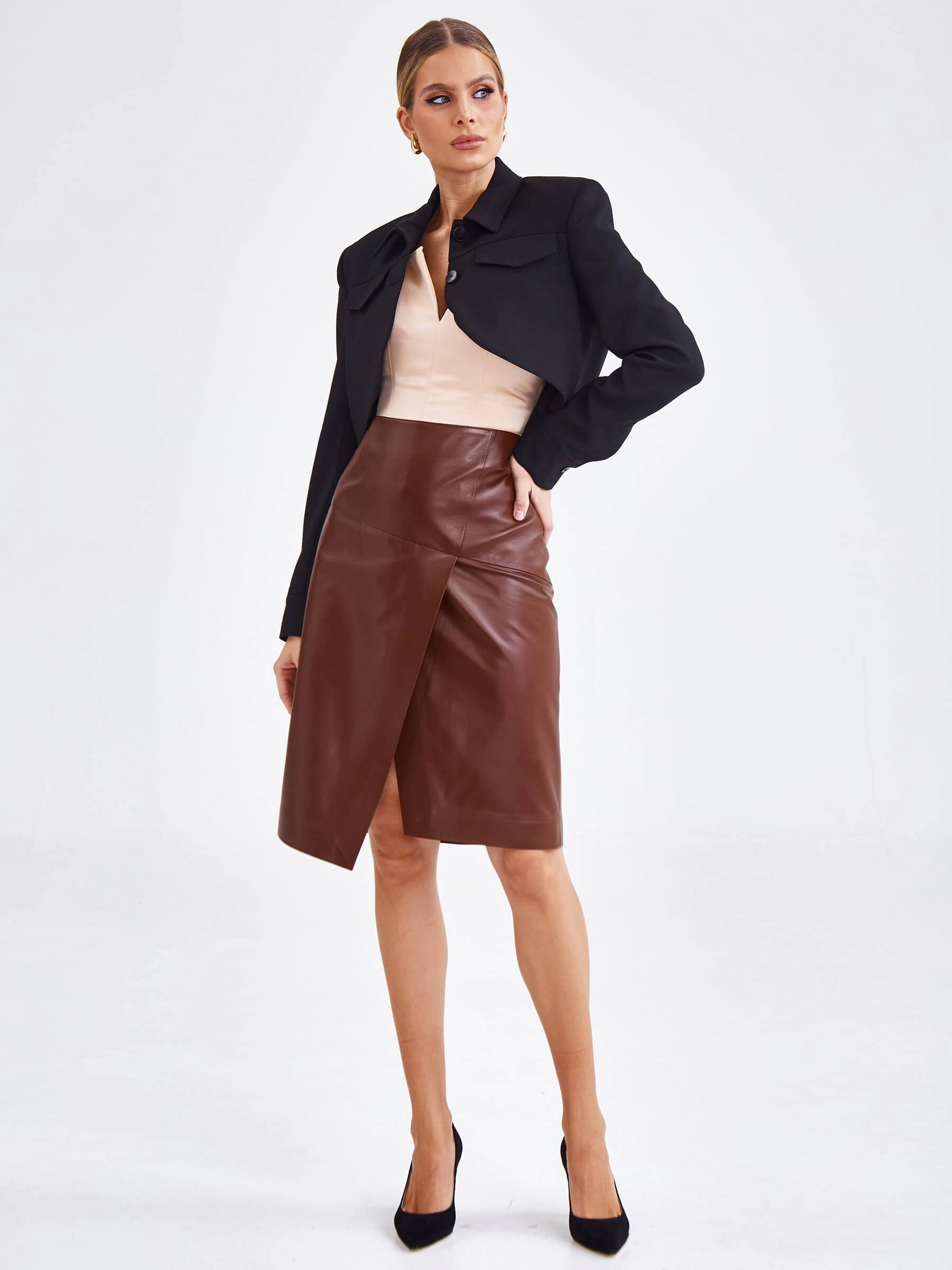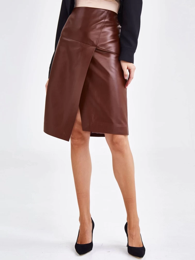 Элегантная юбка-миди из натуральной кожи табачного оттенка покоряет прямым силуэтом и дерзкой асимметрией подола. Задняя потайная молния обеспечивает чистые линии, а высокий разрез спереди добавляет динамики, заменяя традиционную шлицу. Эта универсальная и женственная вещь станет основой стильных образов: сочетайте ее с легкими блузами, массивными свитерами или кожаными жакетами для создания неповторимого лука.