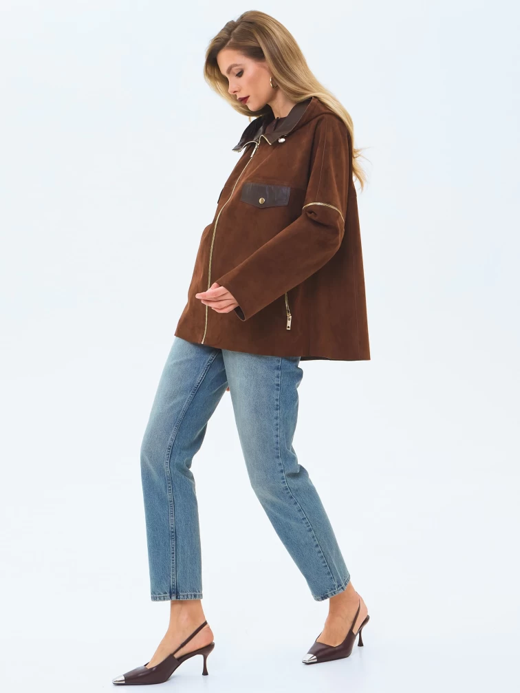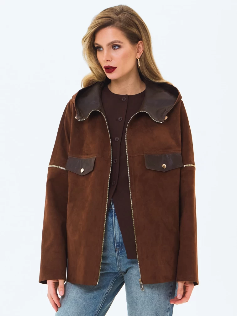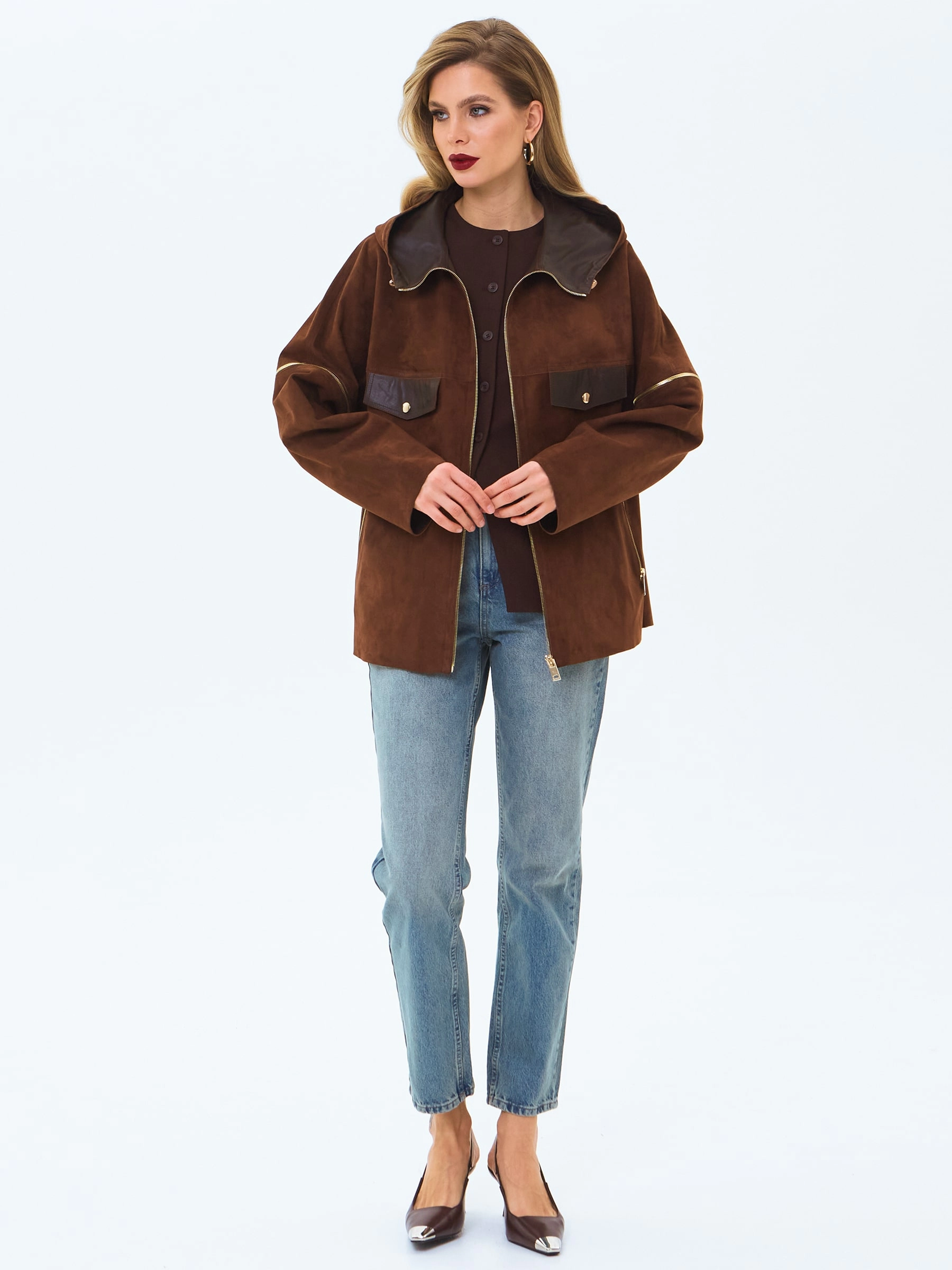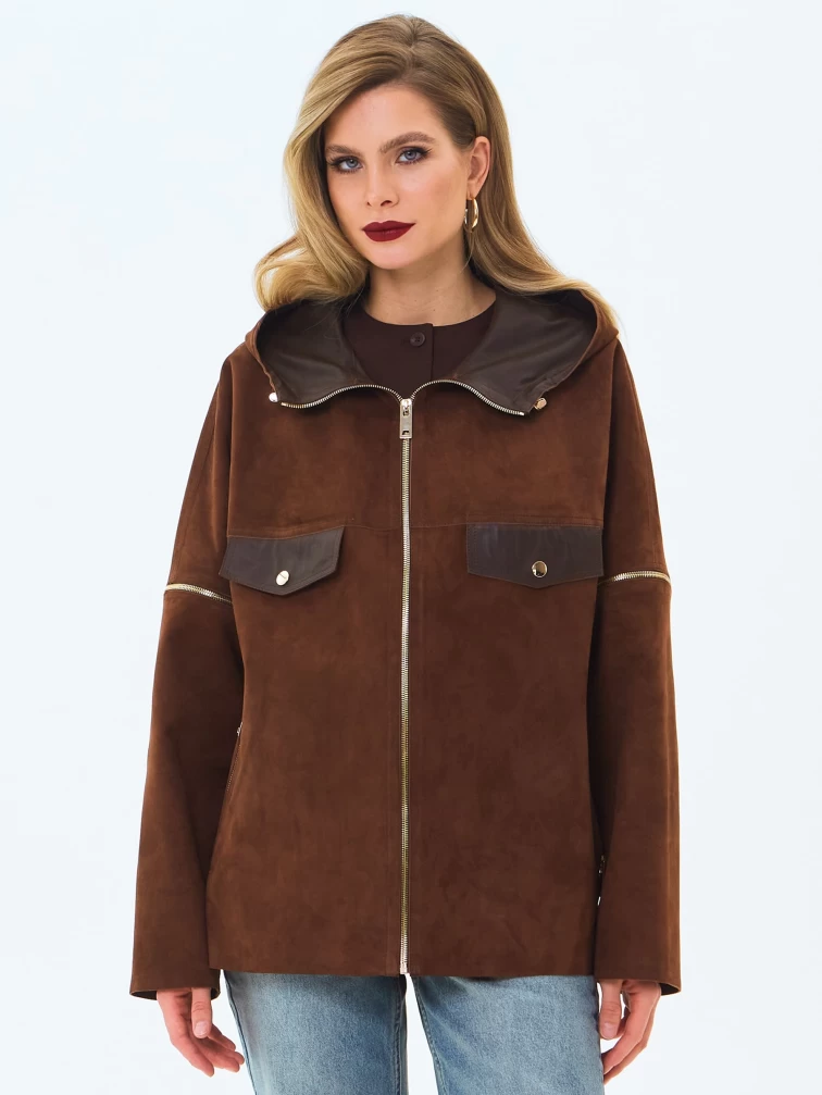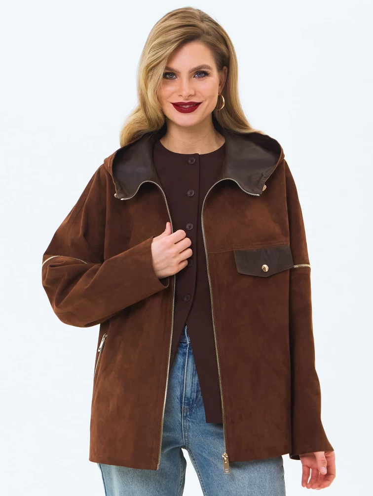 Эта модель может послужить не только как куртка, но и как отличным жакетом. Изделие выполнили из мягкой натуральной замши премиум класс. Комфортный свободный крой. Широкий рукав-трансформер. Глубокий капюшон регулируемый кулисками. Роль декора отдали нагрудным и боковым карманам. Застежка-крупная молния.