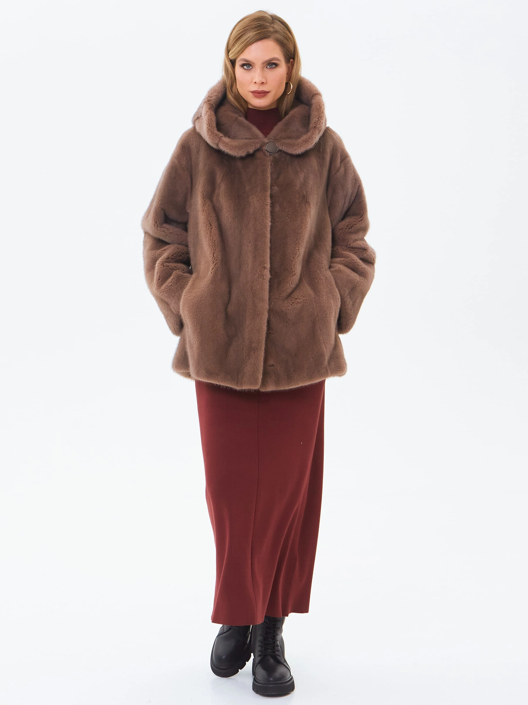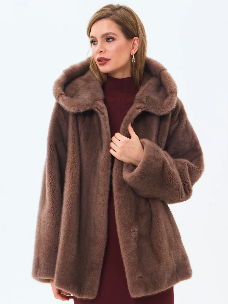 Короткую шубу с объемным капюшоном и спущенной линией плеча выполнили из густого нежного меха норки. Свободная модель с двумя врезными боковыми карманами застегивается металлическими клипсами.