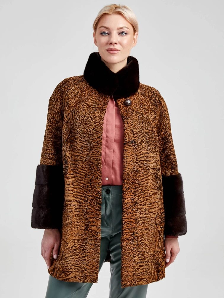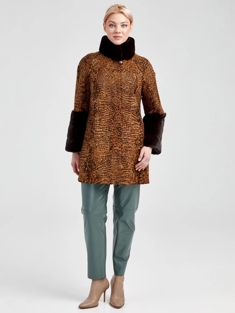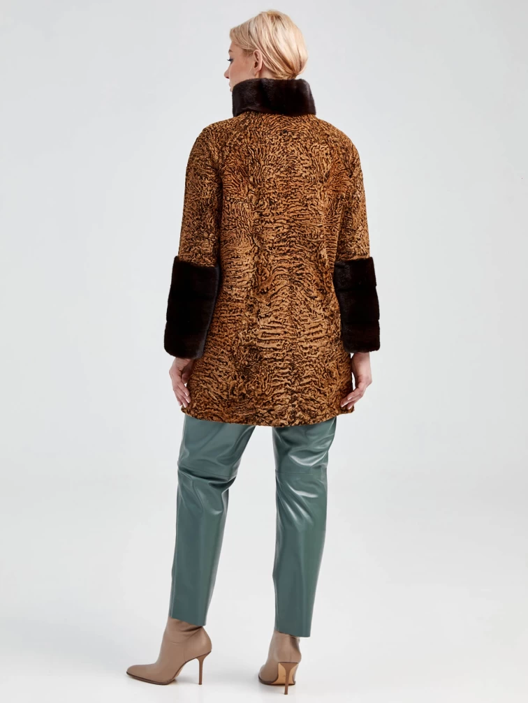 Короткая куртка из афганского каракуля с воротником и рукавами из меха норки. Ювелирный подбор шкурок по оттенку и структуре волоса. Аккуратная работа портных. Чёткая посадка по фигуре. Премиальное качество меха и кожи.