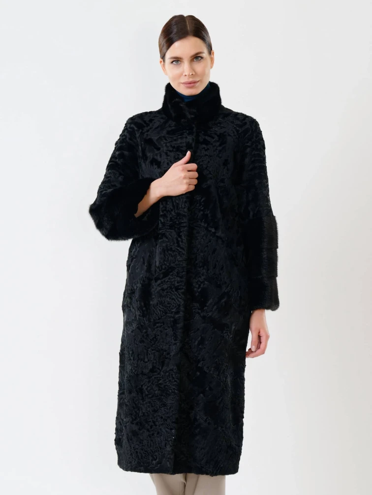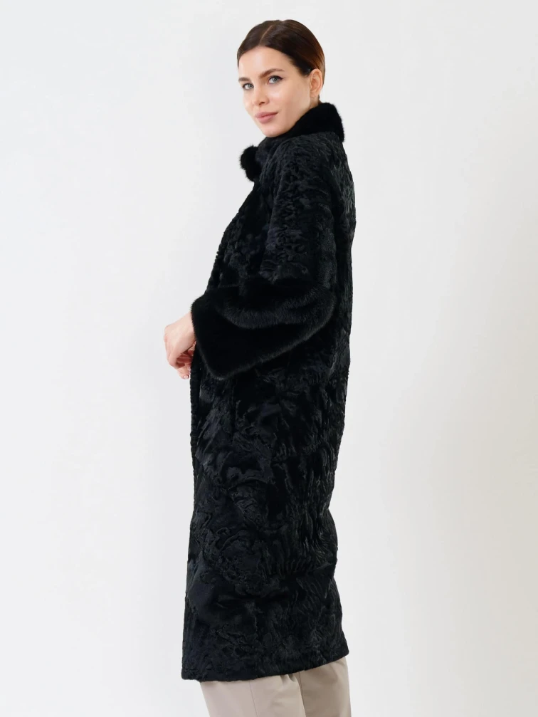 Товар женская шуба из меха каракуля с мехом норки 17101д(сн), черная, размер 44, артикул 22650 выполнен из каракуль с застежкой клипсы. Рассчитан на сезон: осень-зима. Длина изделия свыше 90 см, силуэт прямой.