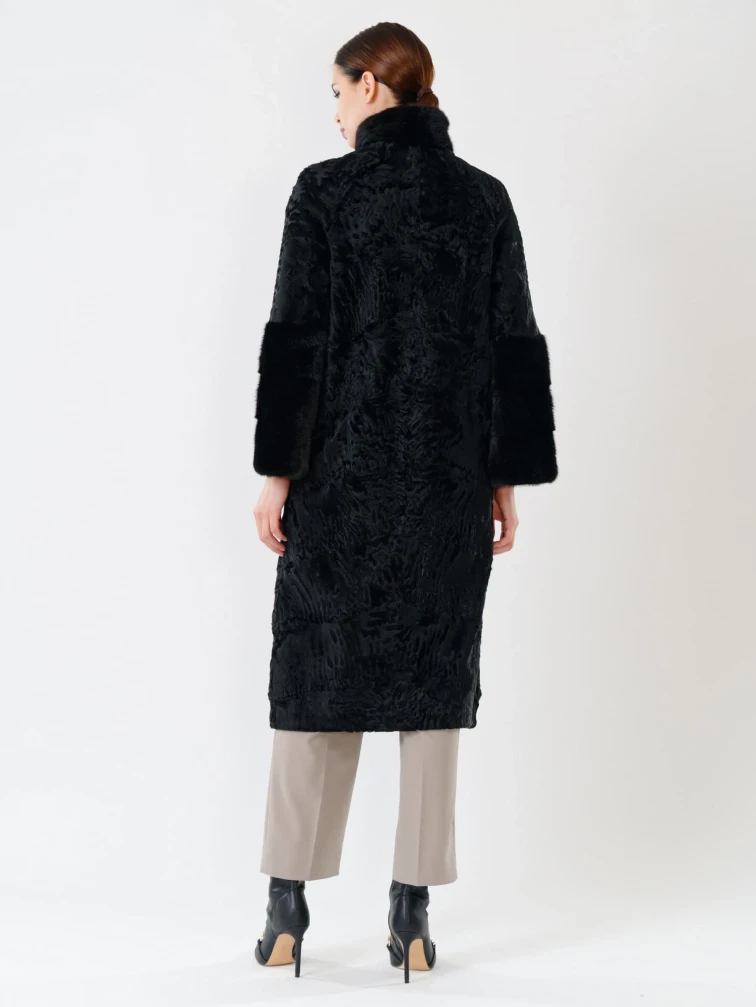 Пальто из афганского каракуля. Воротник-стойка и отделка рукавов выполнены из норки датской селекции. Удобные карманы. Ювелирный подбор шкурок по оттенку и структуре волоса. Аккуратная работа портных. Чёткая посадка по фигуре. Премиальный уровень.