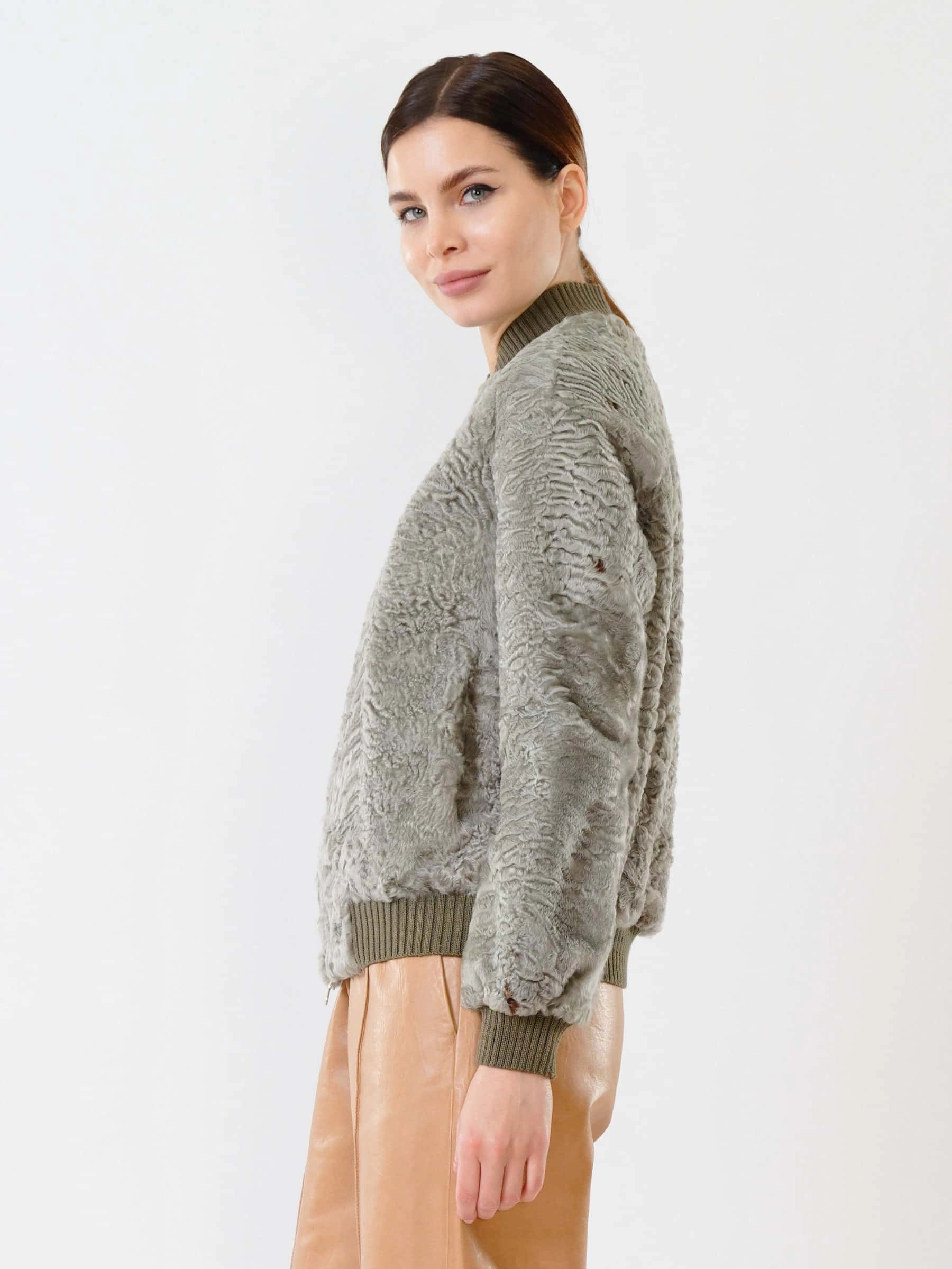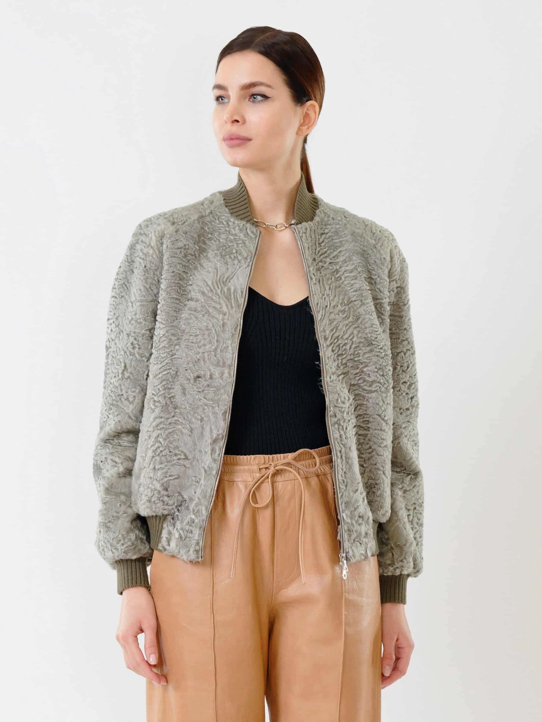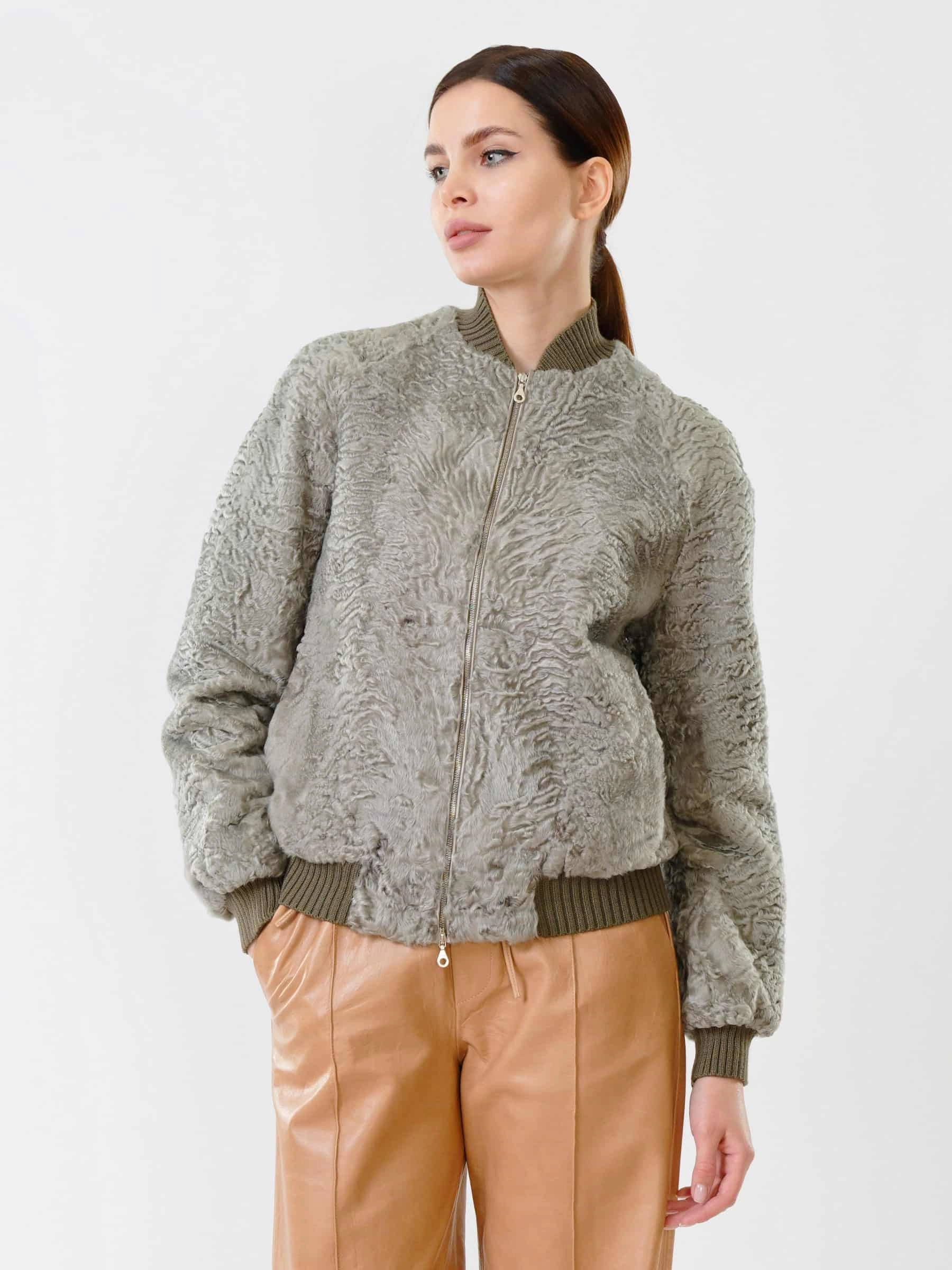 Этот бомбер из афганского каракуля олицетворяет премиальный уровень и сдержанную роскошь. Модель выделяется характерным тугим плоским завитком волоса, что говорит о великолепном качестве меха и ювелирном подборе шкурок по оттенку и структуре. Безупречная работа портных обеспечивает комфортную, идеальную посадку по фигуре. Общая концепция — выдержанно, стильно, ничего лишнего. Это современная и статусная вещь, создающая лаконичный, но впечатляющий образ.