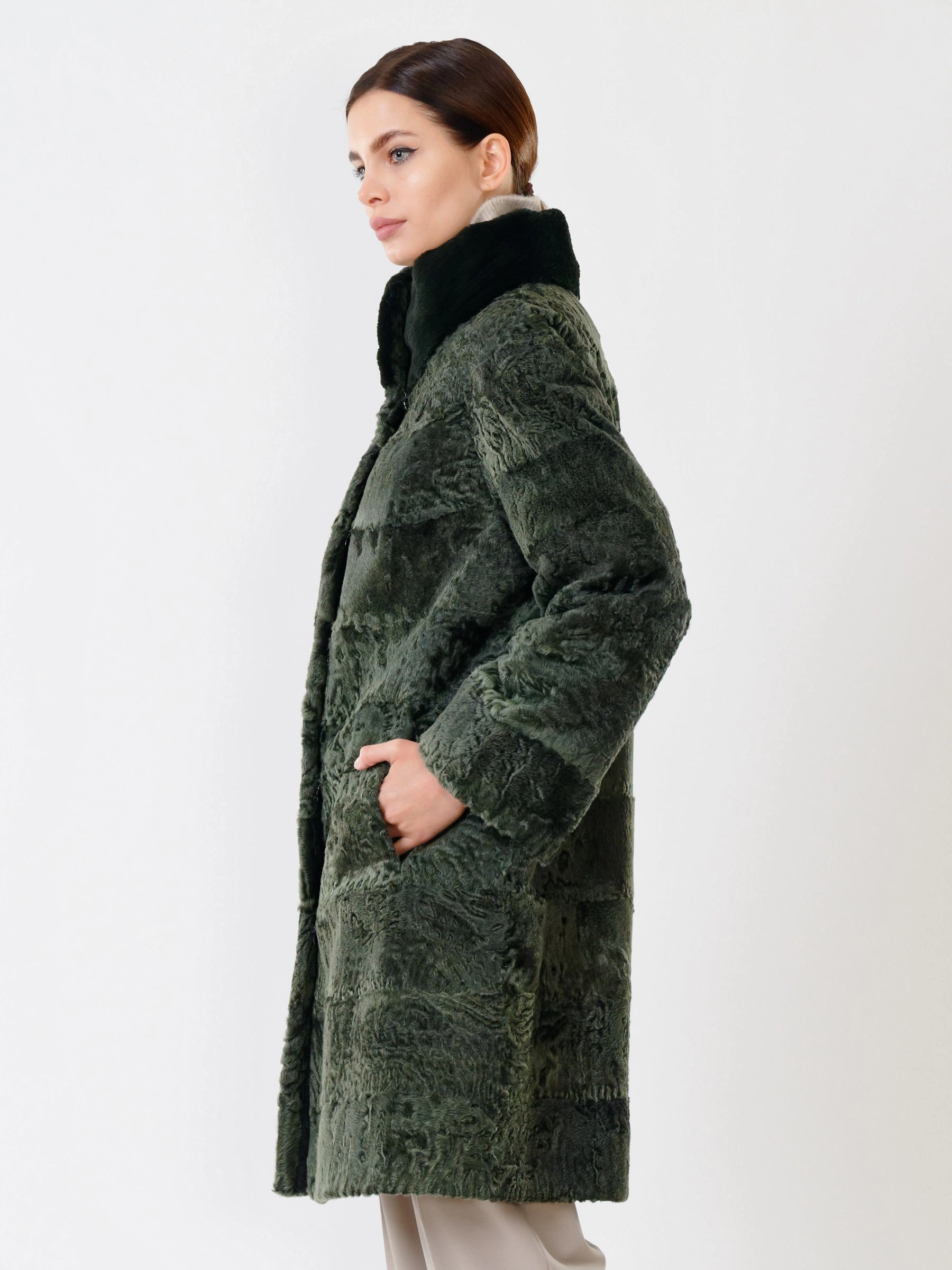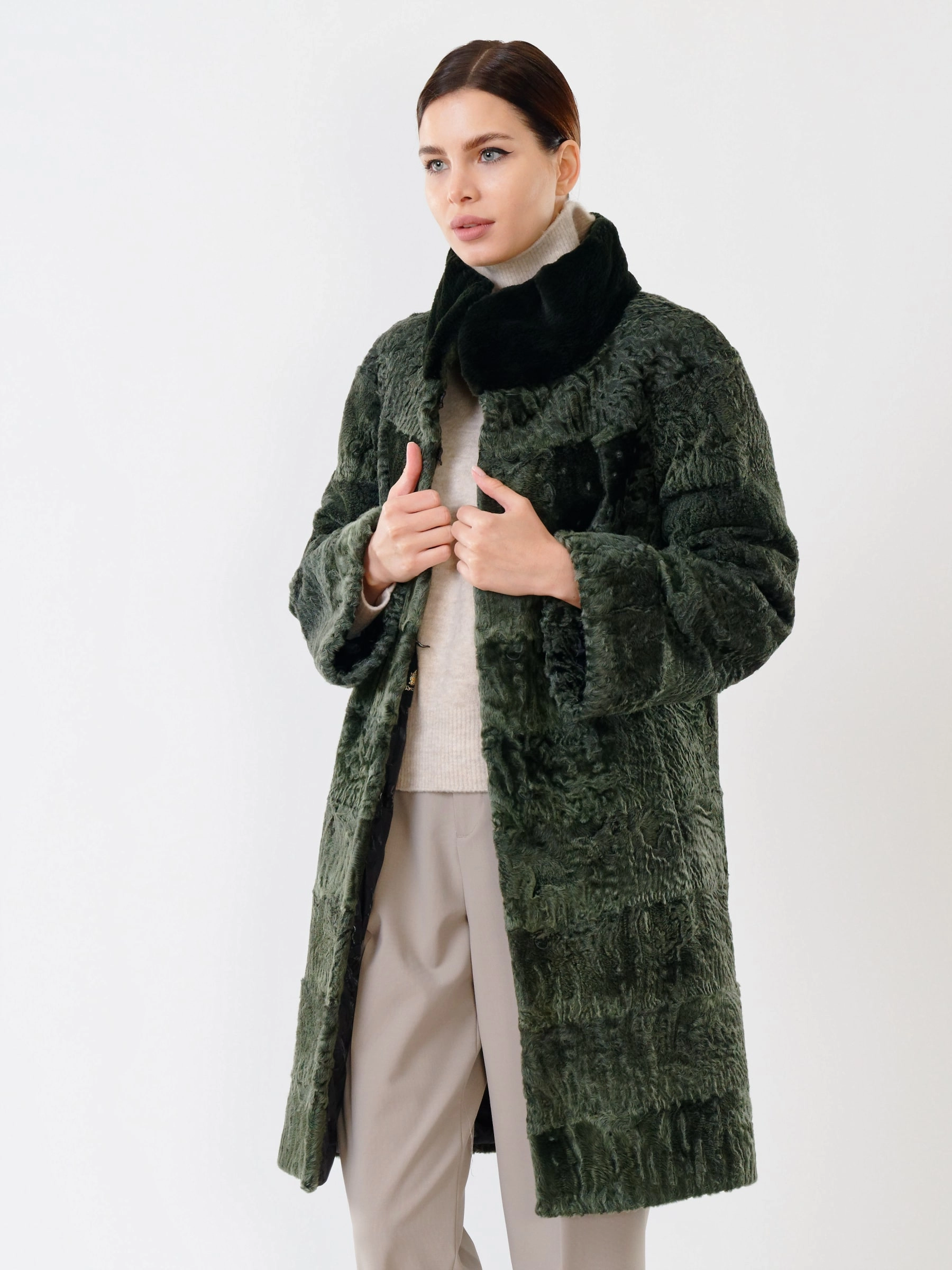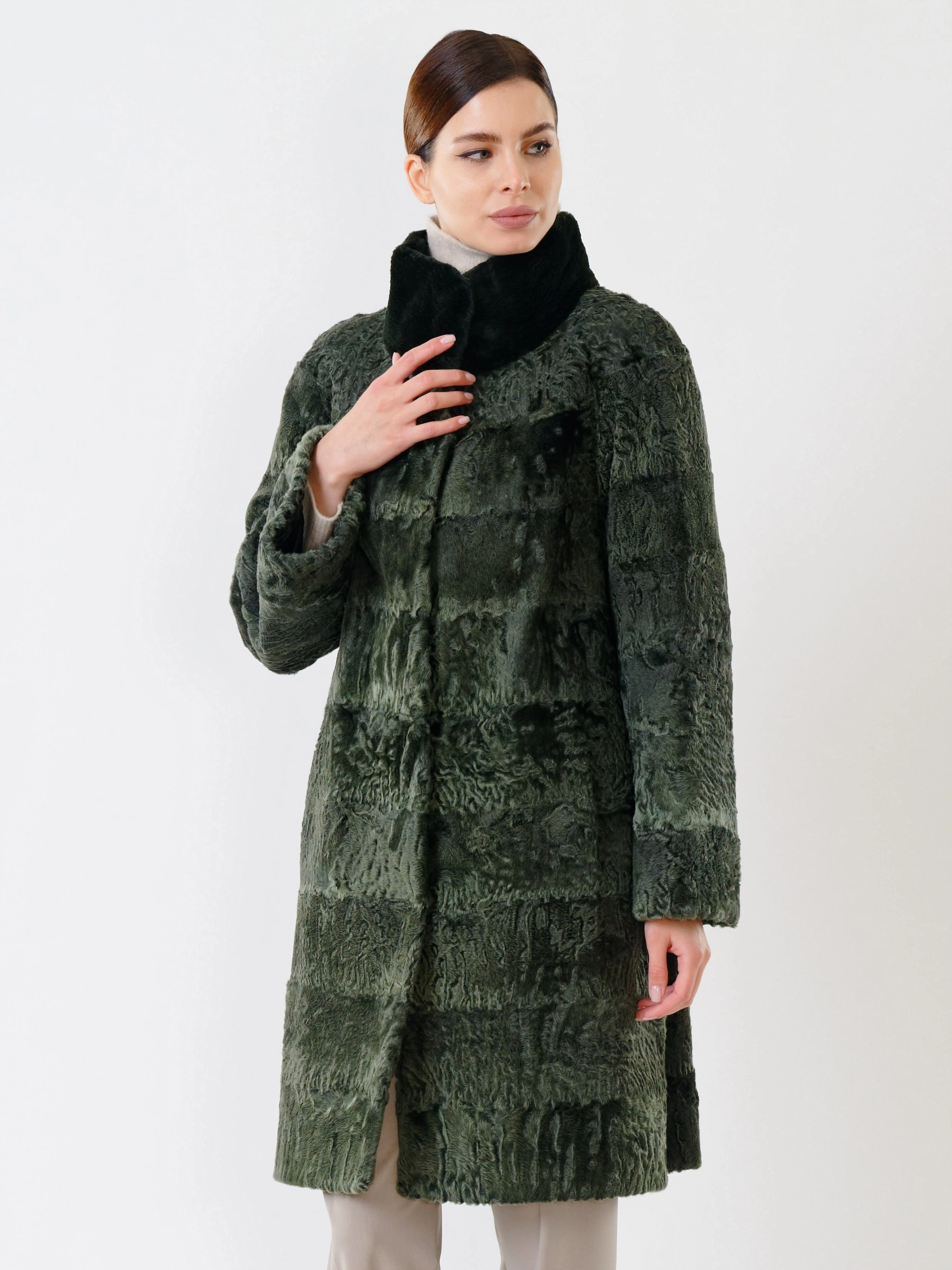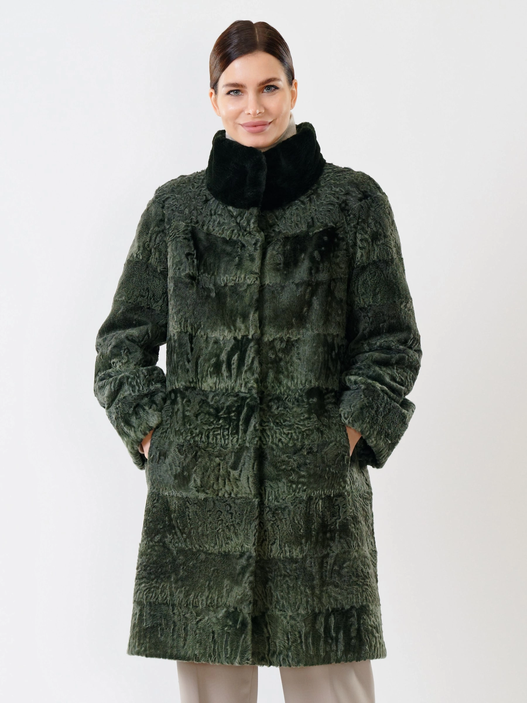 Товар женская шуба из меха каракуля с мехом бобра 325, зеленая, размер 48, артикул 22480 выполнен из каракуль с застежкой клипсы. Рассчитан на сезон: осень-зима. Длина изделия свыше 90 см, силуэт прямой.