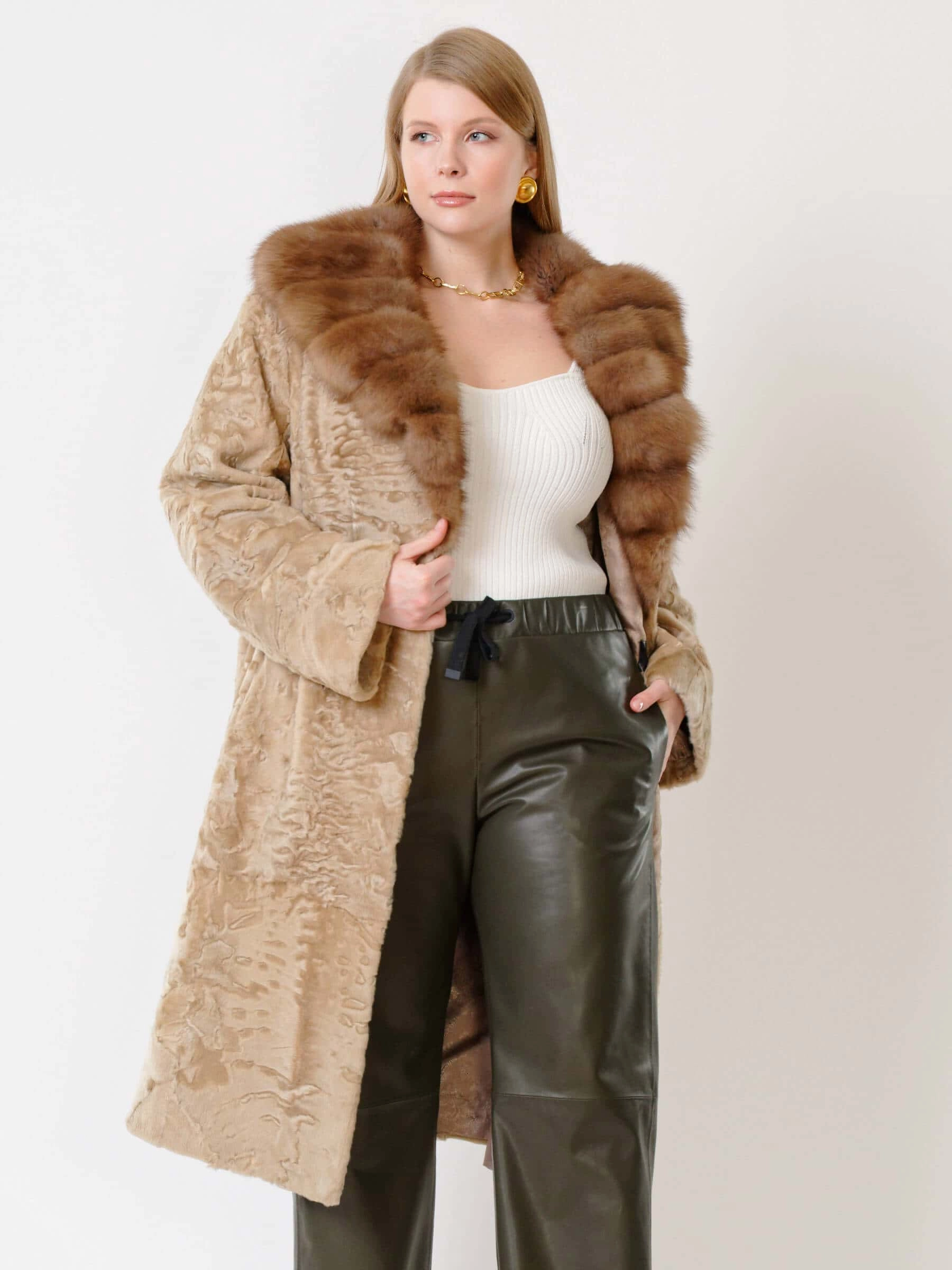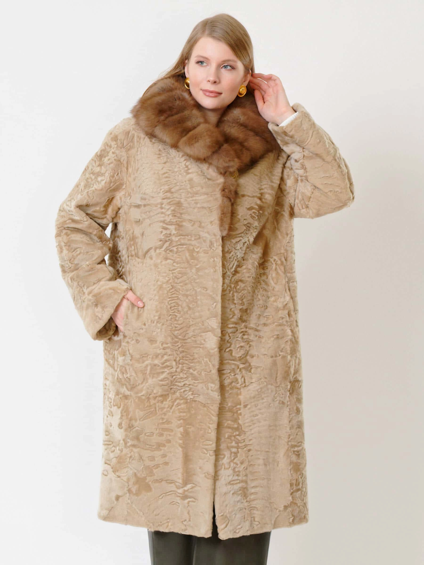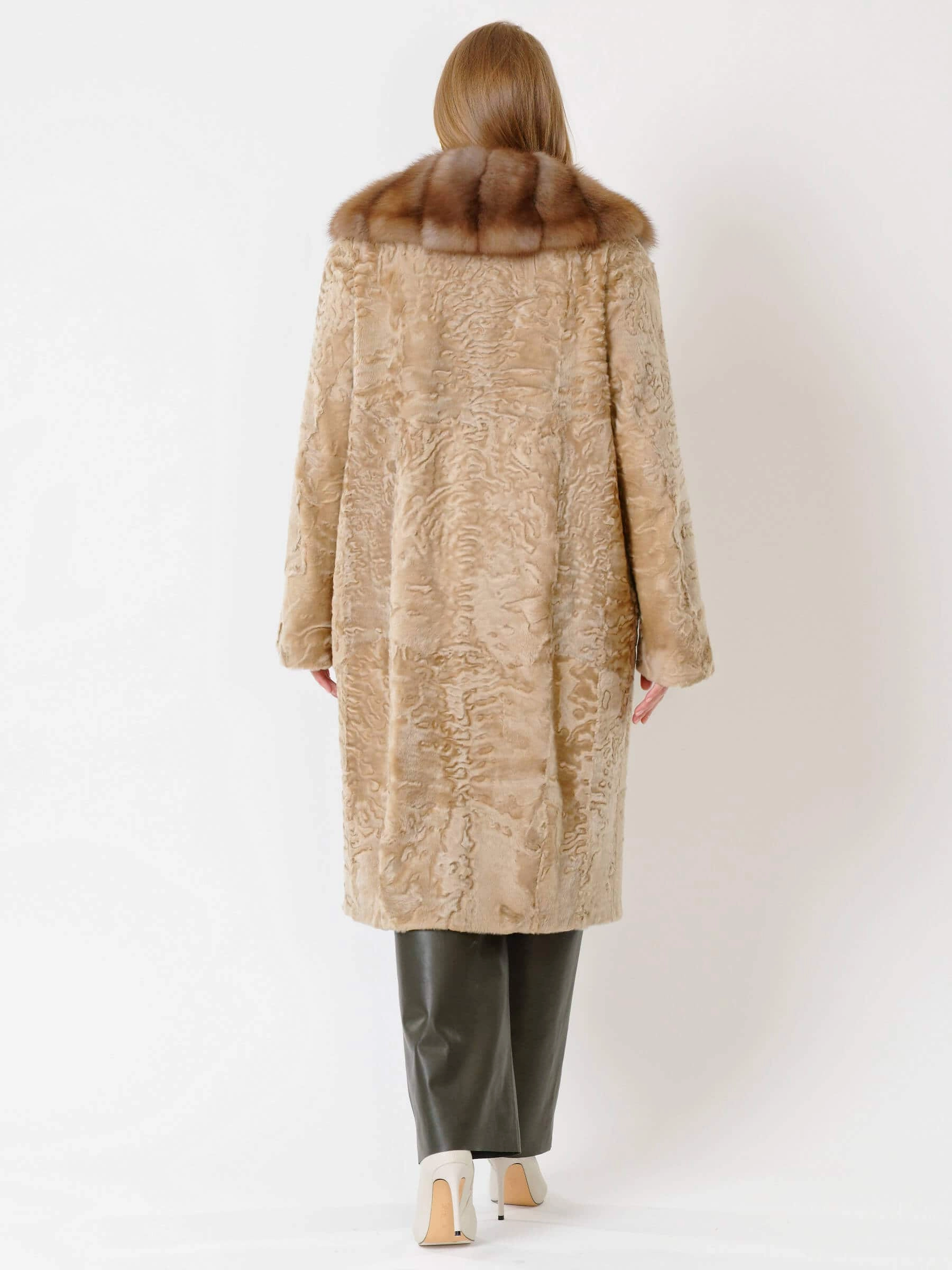 Пальто из афганской каракульчи в цвете сур. Точно подобранный рисунок. Высокое качество меха. Воротник из меха куницы. Ювелирный подбор шкурок по оттенку и структуре волоса. Аккуратная работа портных. Чёткая посадка по фигуре.
