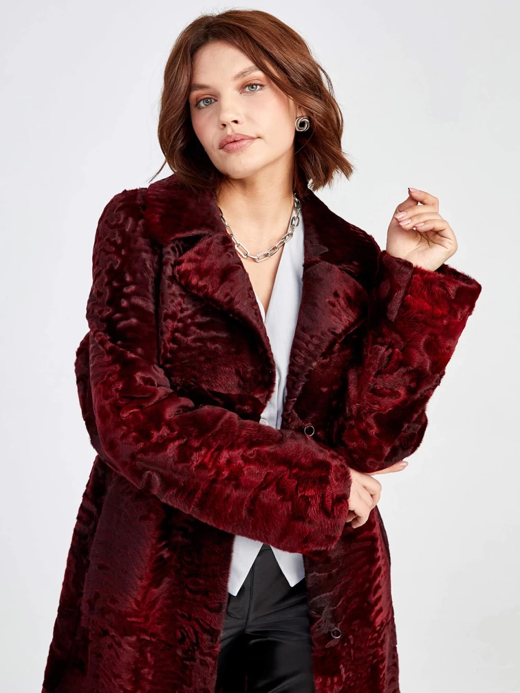 Пальто из афганской каракульчи в цвете бордо. Нежнейший мех. Идеально подобранный рисунок. Английский воротник. Премиальное качество. В таком пальто дама будет чувствовать себя уверенно и комфортно.
