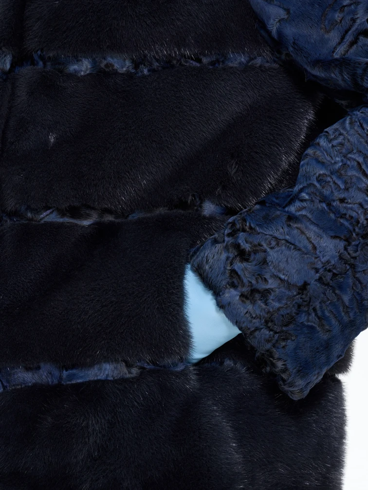 Товар женская шуба из меха норки софия, синяя, размер 50, артикул 65580 выполнен из мех каракульчи с застежкой клипсы. Рассчитан на сезон: весна-осень. Длина изделия 70 см, силуэт прямой.