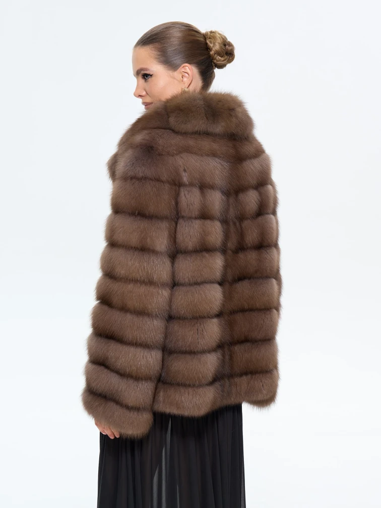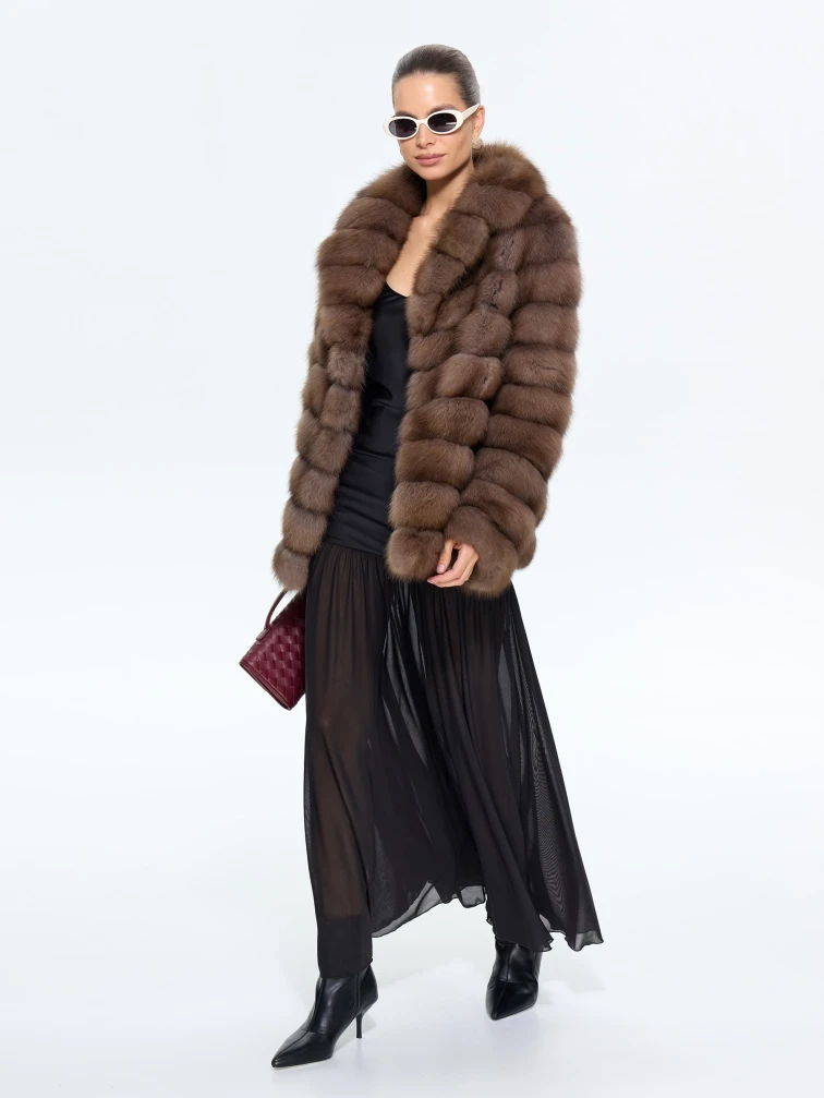 Элегантная шуба из меха куницы с изысканным английским воротником длиной 65 см воплощает утонченную классику. Прямой силуэт в дымчатом оттенке с аккуратными клипсами и втачными рукавами создает идеальные пропорции. Стилисты рекомендуют носить эту модель с водолазкой и кожаными брюками для повседневного образа или с платьем-миди и сапогами-ботфортами для вечернего выхода, подчеркивая ее универсальность и роскошную эстетику.