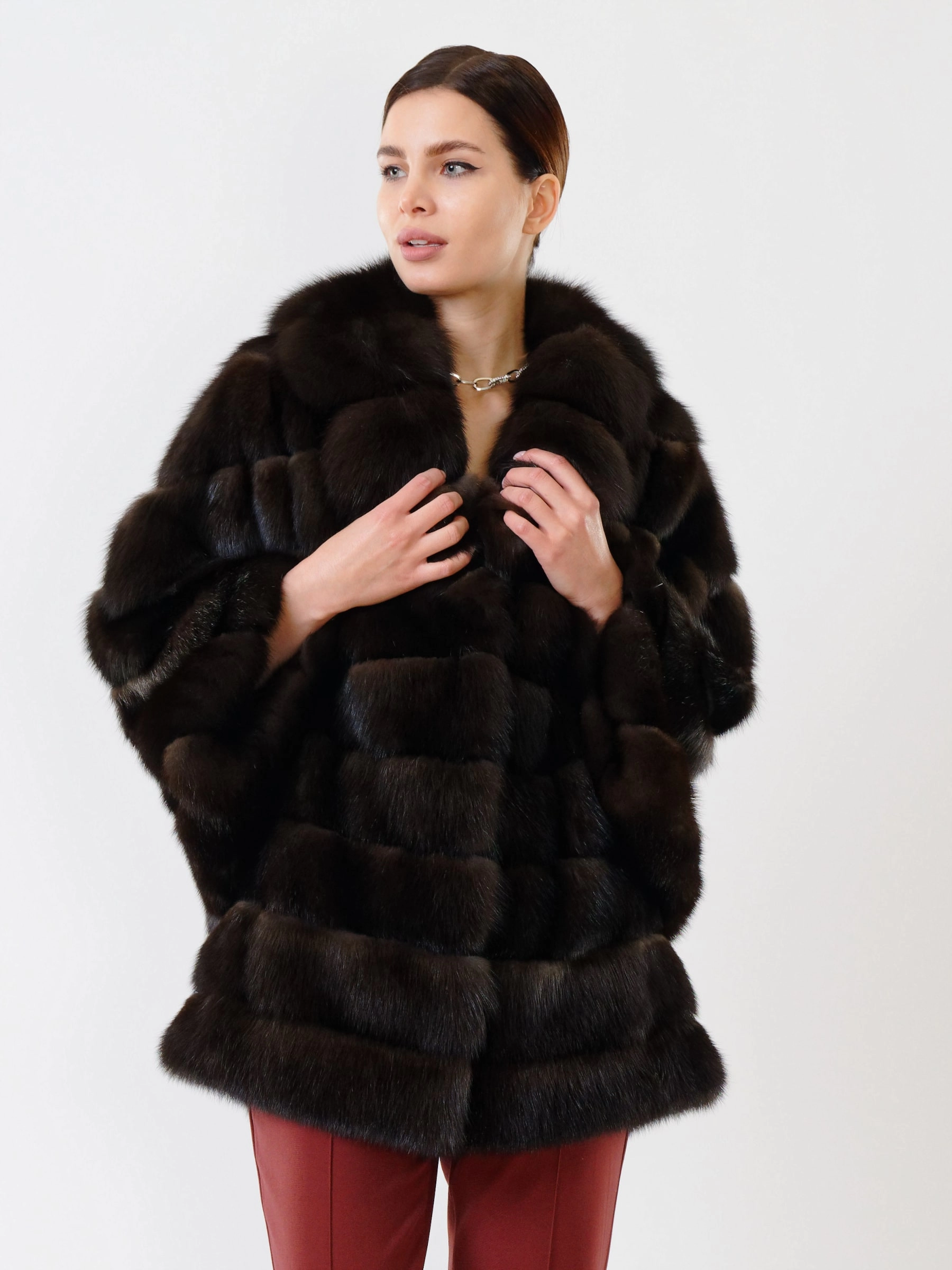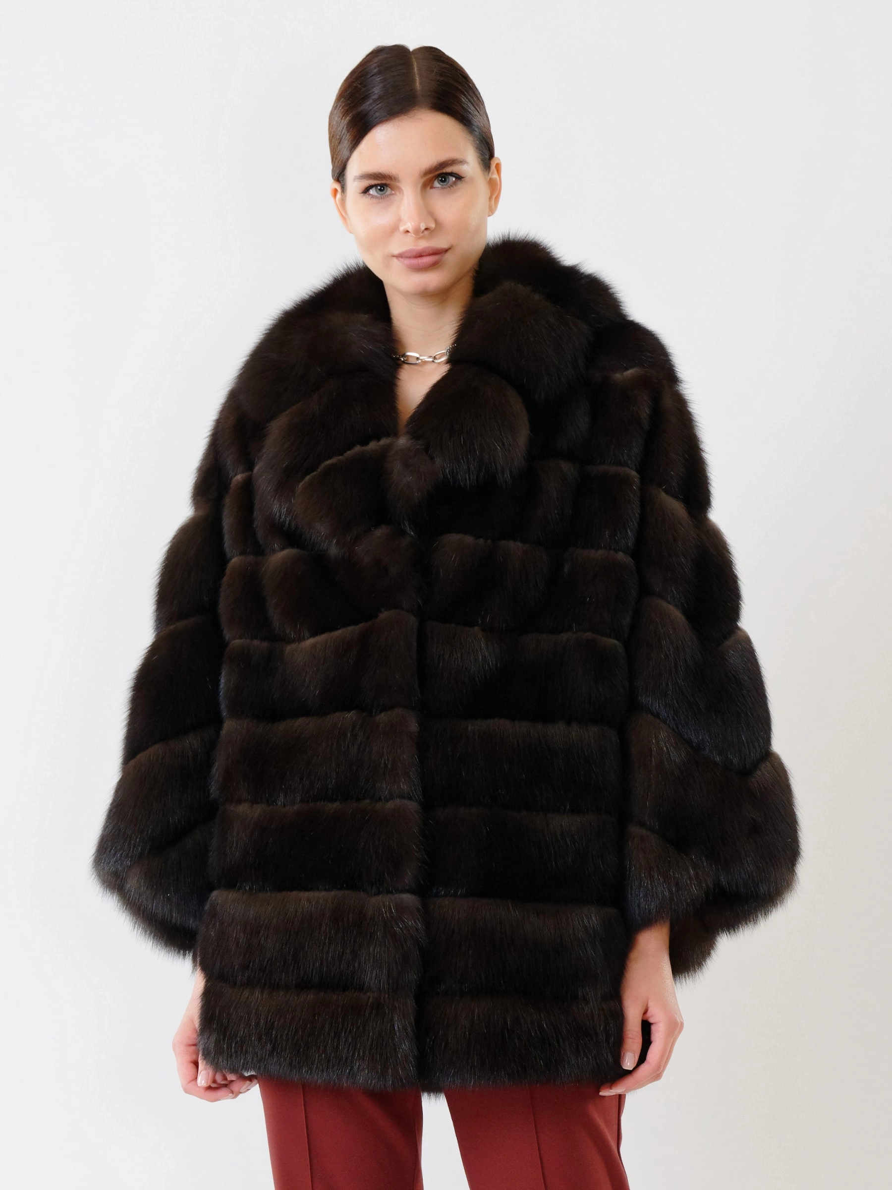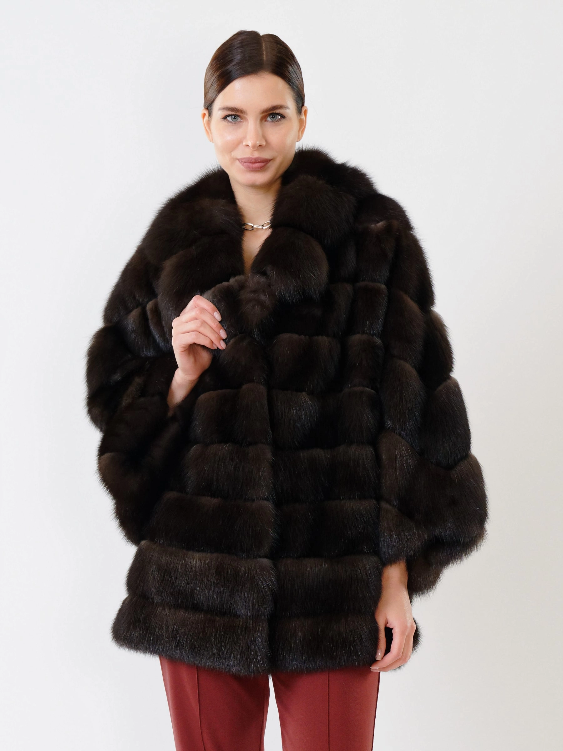 Товар шуба из меха соболя премиум класса для женщин 323, коричневая, размер 46, артикул 19110 выполнен из мех соболя с застежкой клипсы. Рассчитан на сезон: осень-зима. Длина изделия 75-90 см, силуэт свободный.