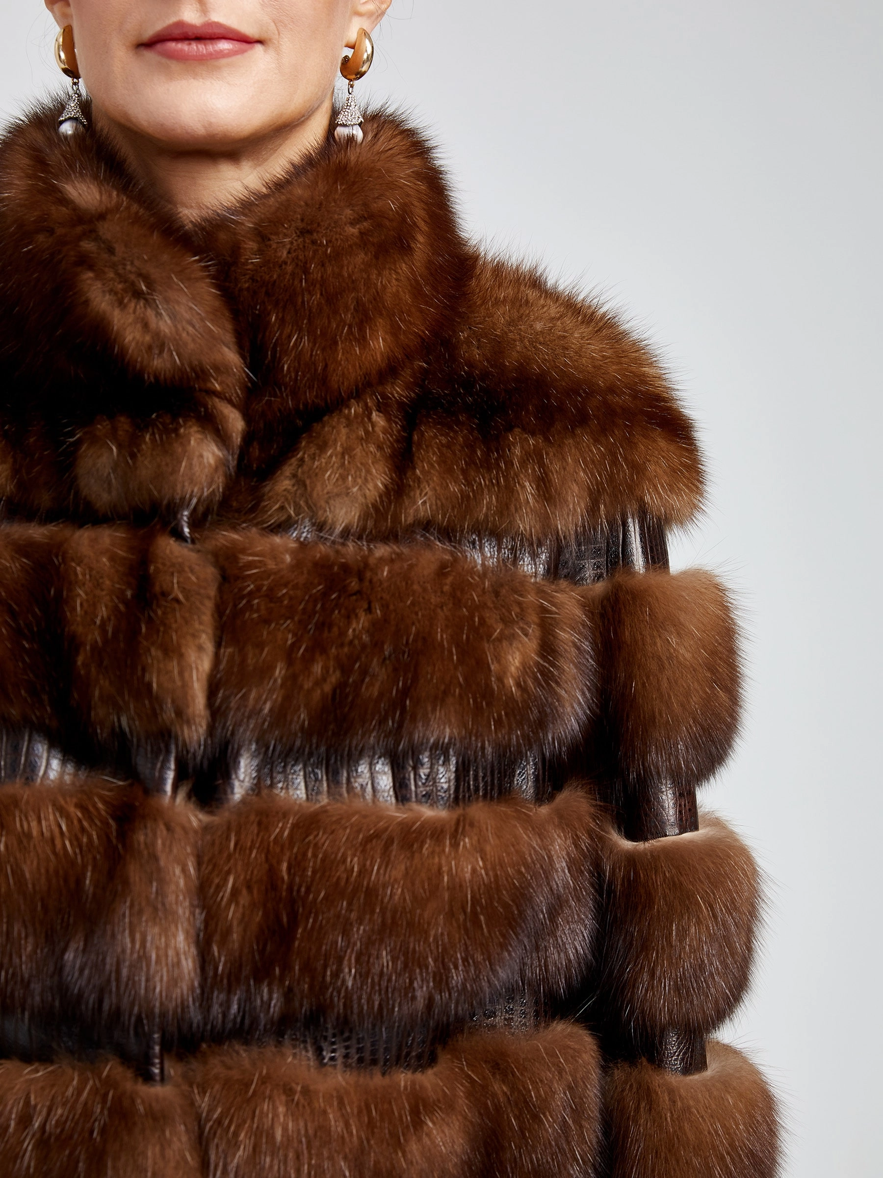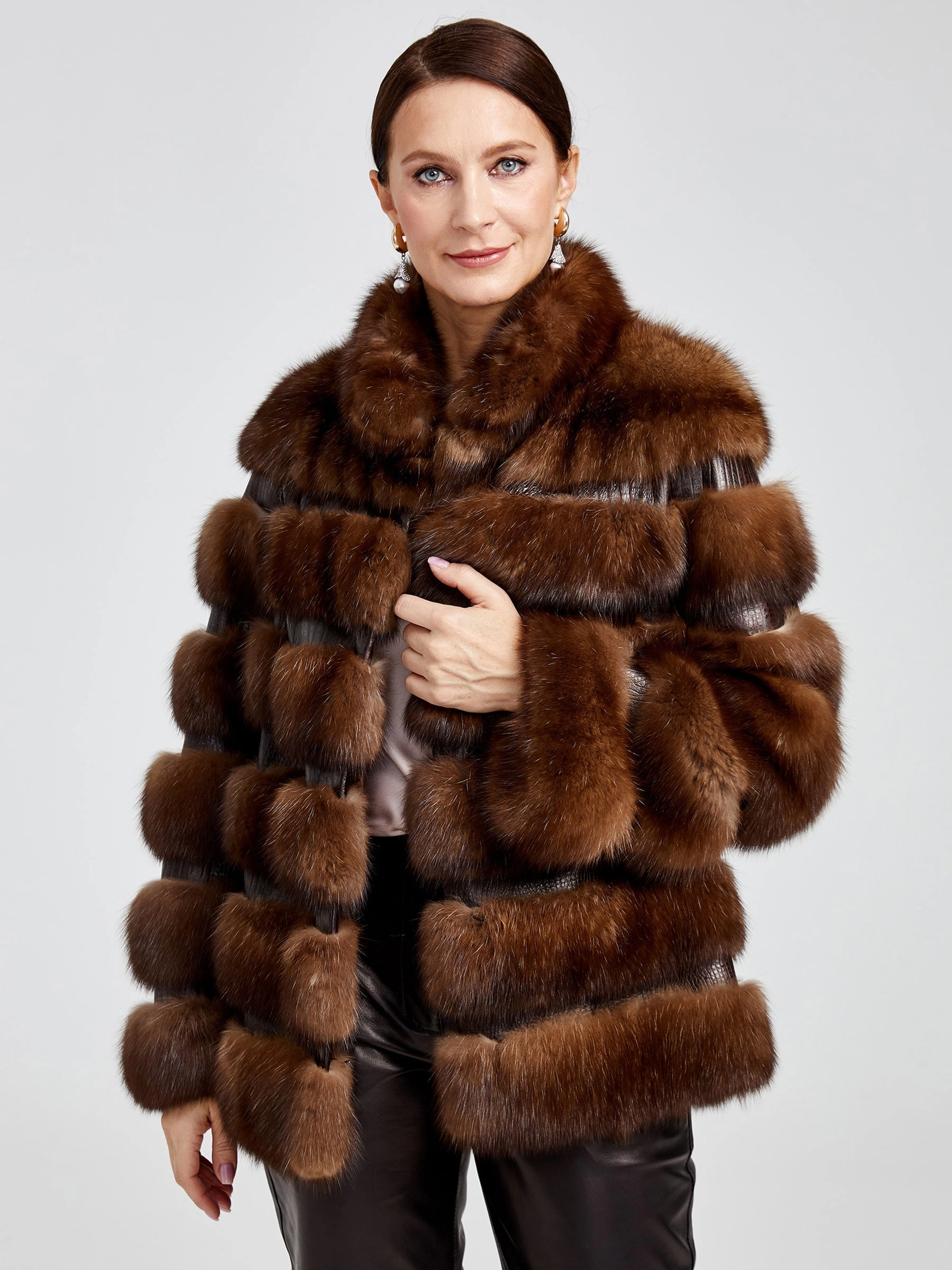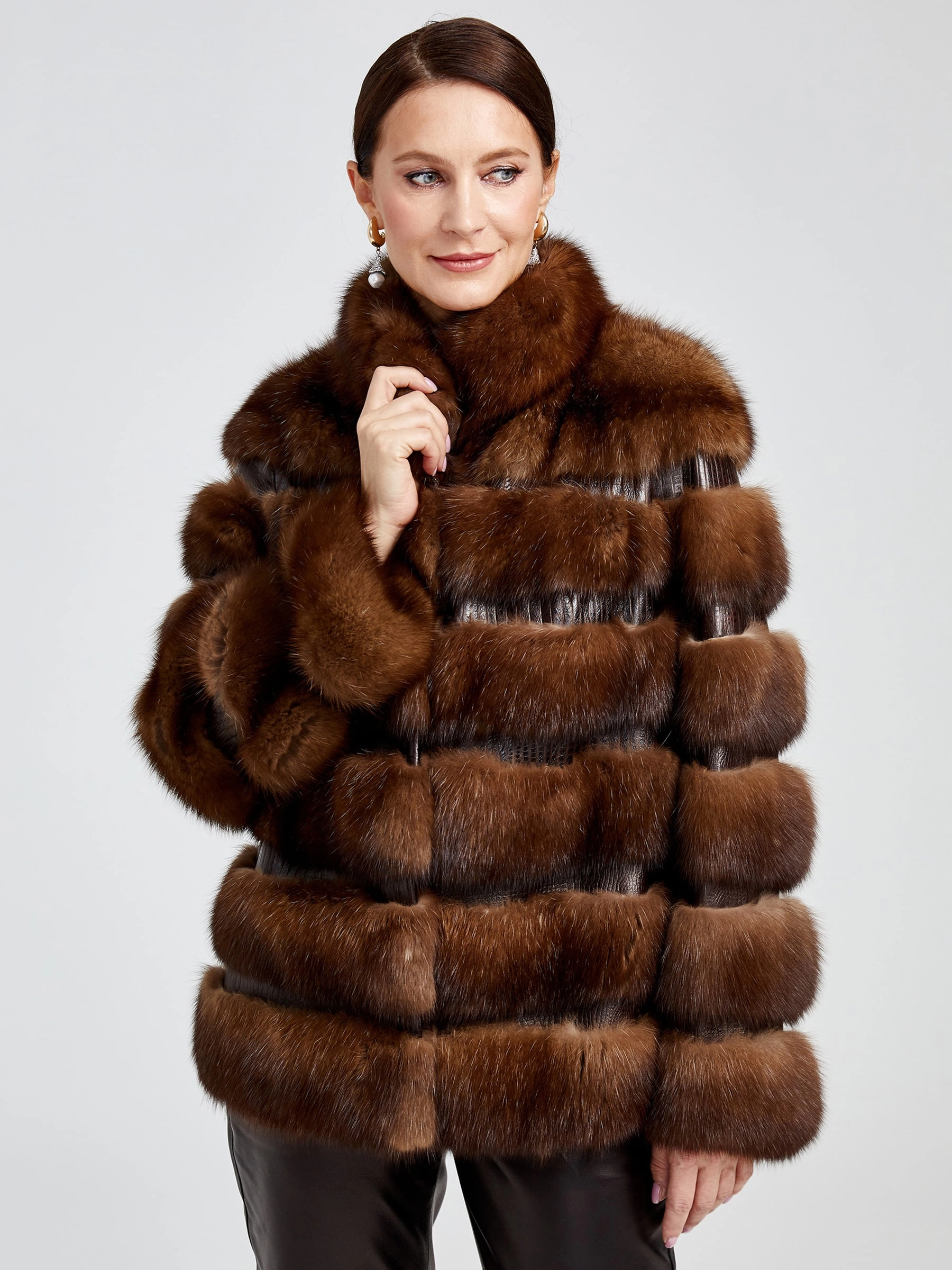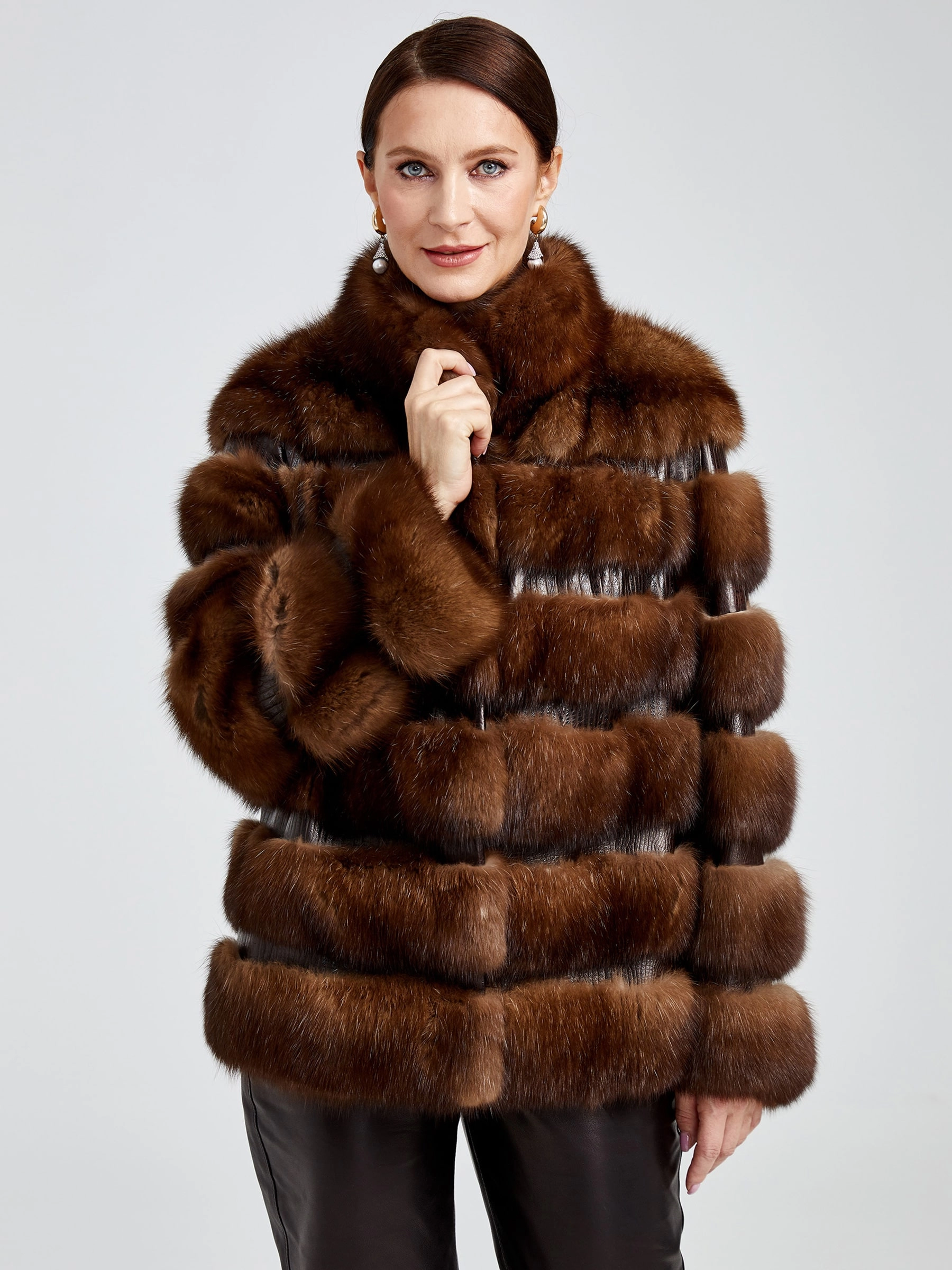 Куртка из меха соболя с изысканной вышивкой из кожи, выполненная в технике горизонтальной раскладки, сочетает в себе классический стиль и безупречную функциональность. Прямой силуэт длиной от 51 до 74 см, втачной рукав и стойка с застёжкой-клипсой создают элегантный образ, а драгоценный соболь с шелковистым остевым волосом и плотным подшёрстком надёжно согреет в осенне-зимний сезон. Модель дополнена подкладом из 100% вискозы и представлена в лаконичном дизайне без декоративных элементов и капюшона, подчёркивая аристократическую простоту линий и роскошь натурального меха.