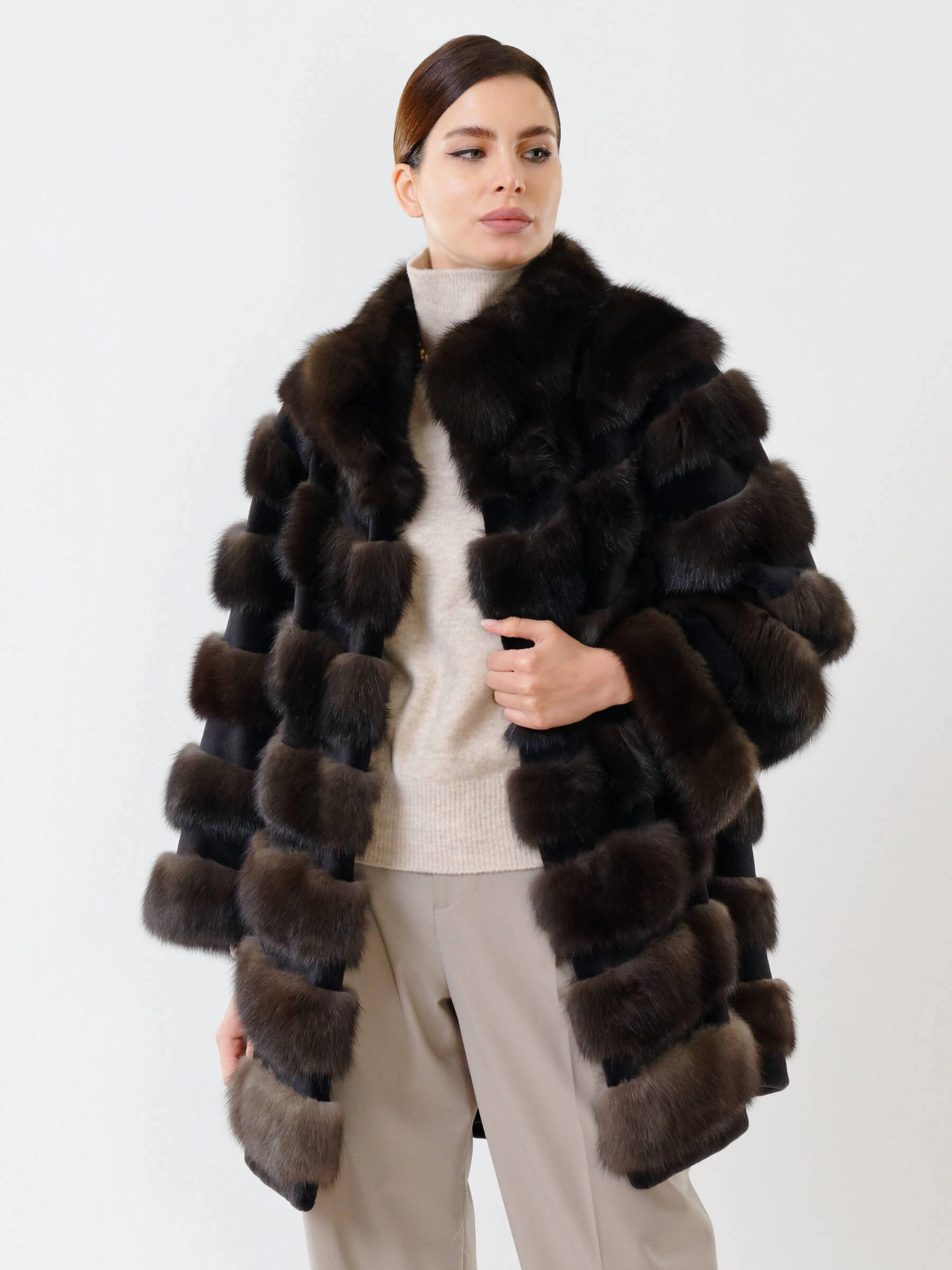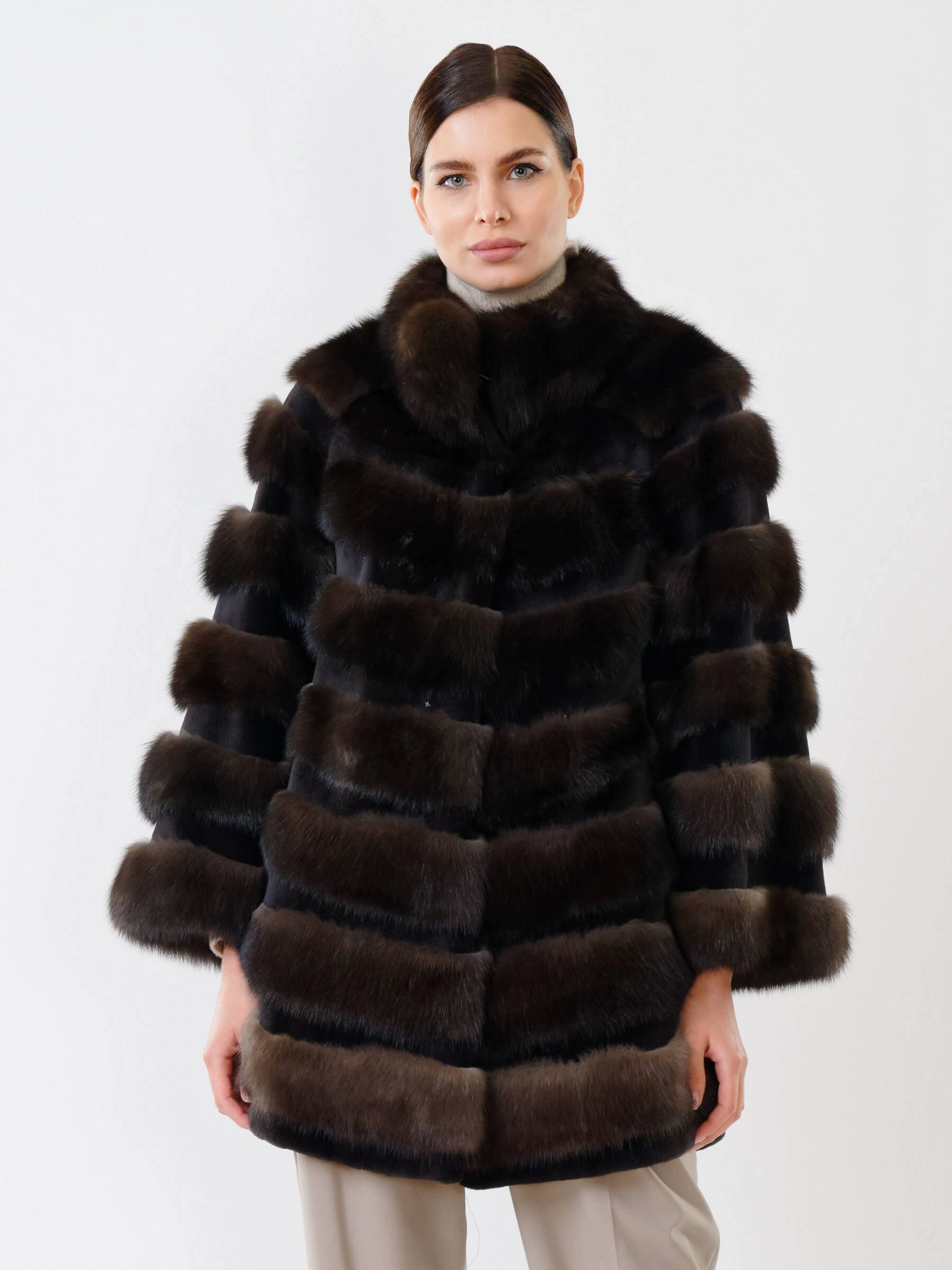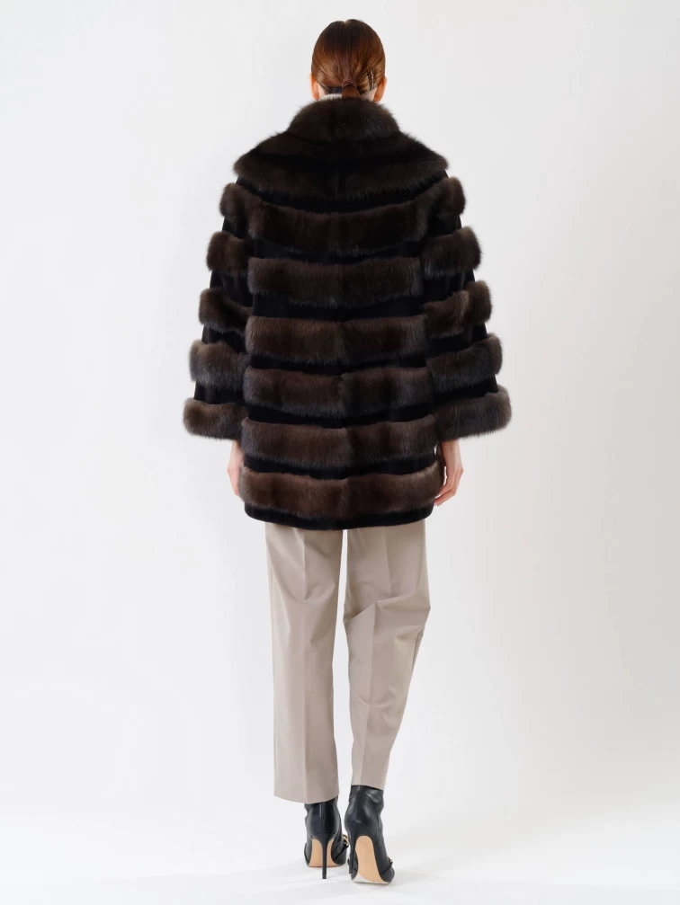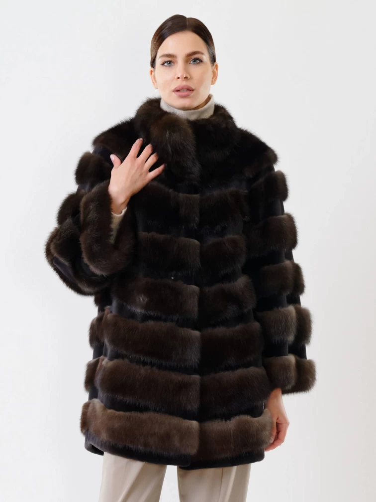 Шуба из меха соболя. Мех соболя расшит мехом американской норки с удаленными остевыми волосками. Безупречная работа наших мастеров. Длина по спинке 82 см. Шуба изготовлена из шкурок соболя высшего качества, приобретенных на аукционе «СОЮЗПУШНИНА». Шкурки выделаны на фабрике Мета-Сибирь. Все наши шубы сертифицированы.