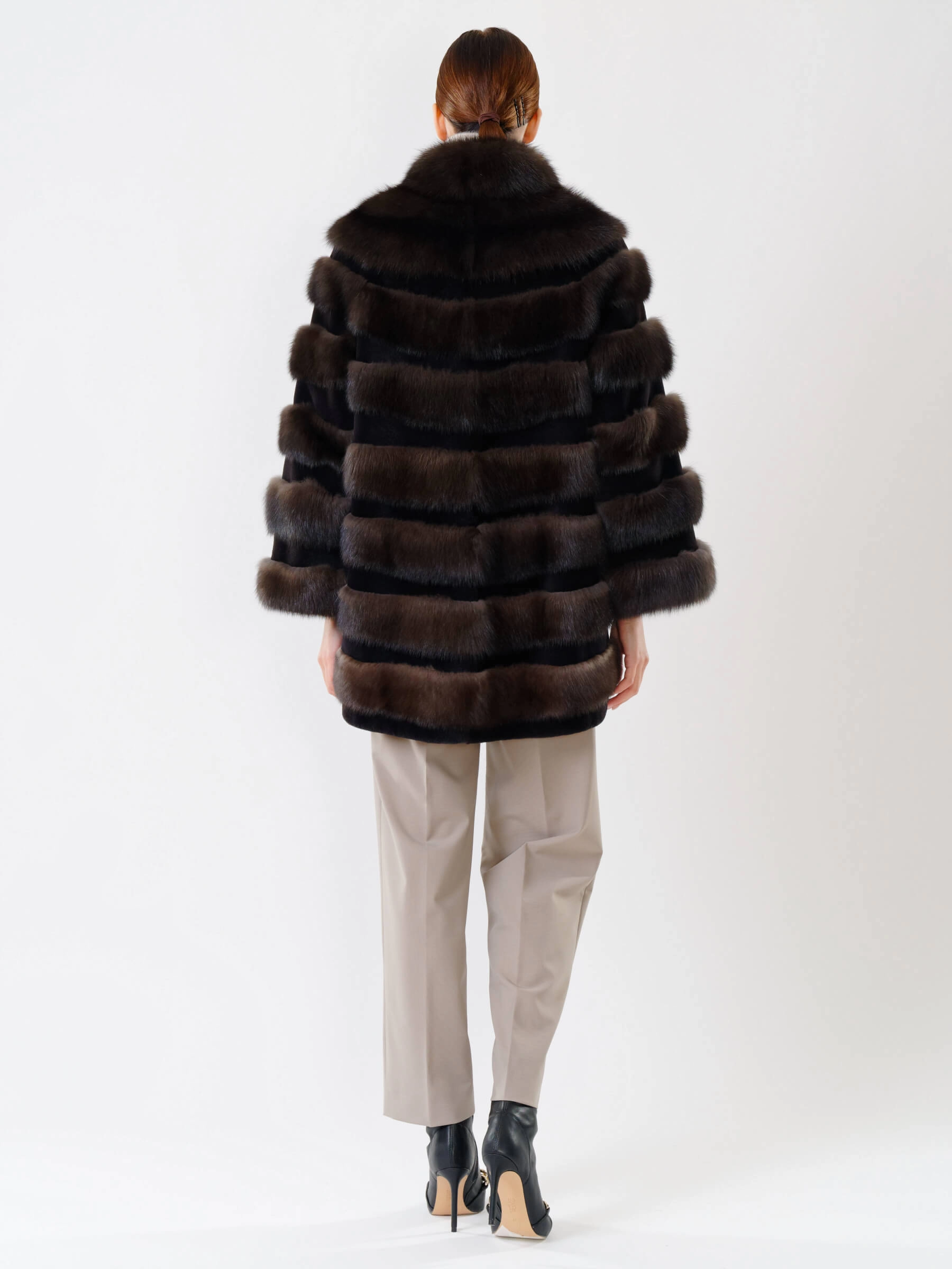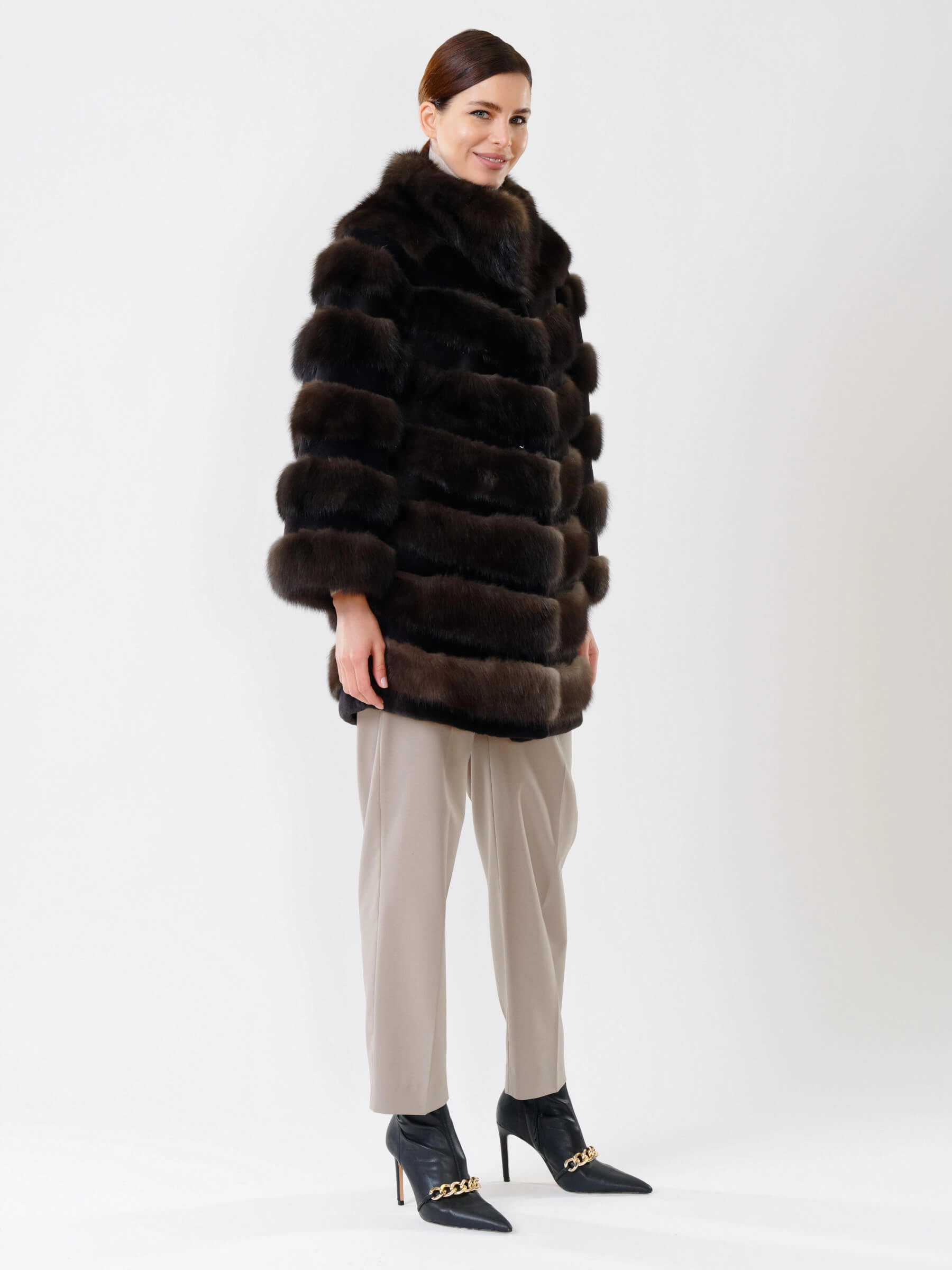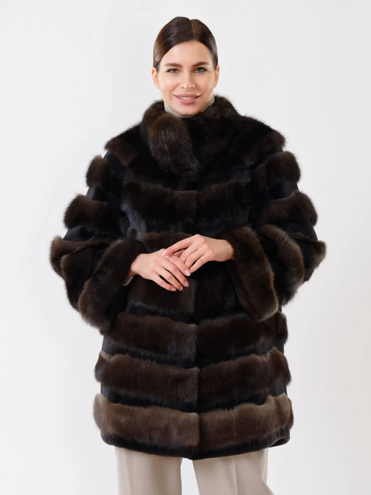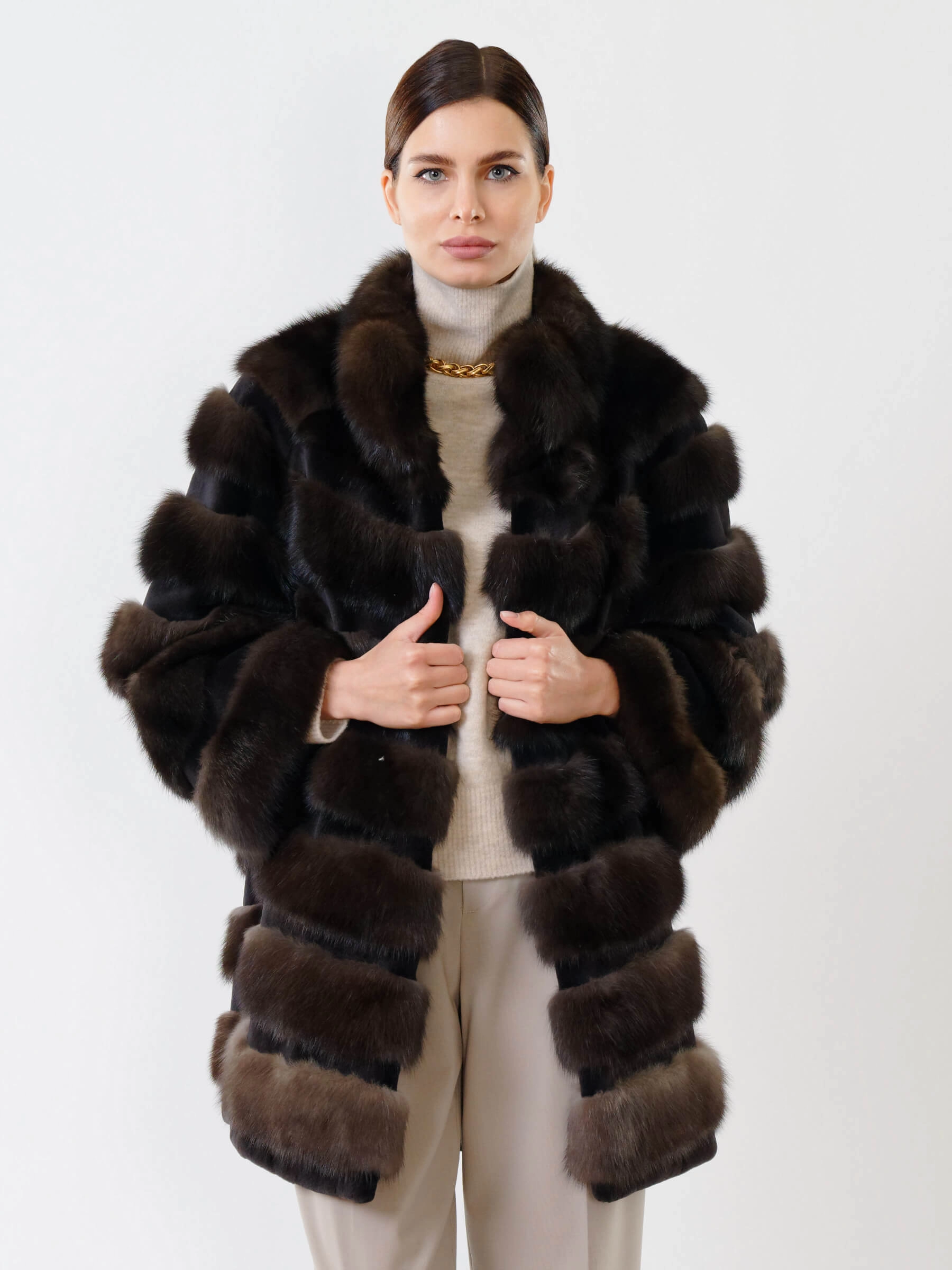 Шуба из меха соболя. Мех соболя расшит мехом американской норки с удаленными остевыми волосками. Безупречная работа наших мастеров. Длина по спинке 82 см. Шуба изготовлена из шкурок соболя высшего качества, приобретенных на аукционе «СОЮЗПУШНИНА». Шкурки выделаны на фабрике Мета-Сибирь. Все наши шубы сертифицированы.
