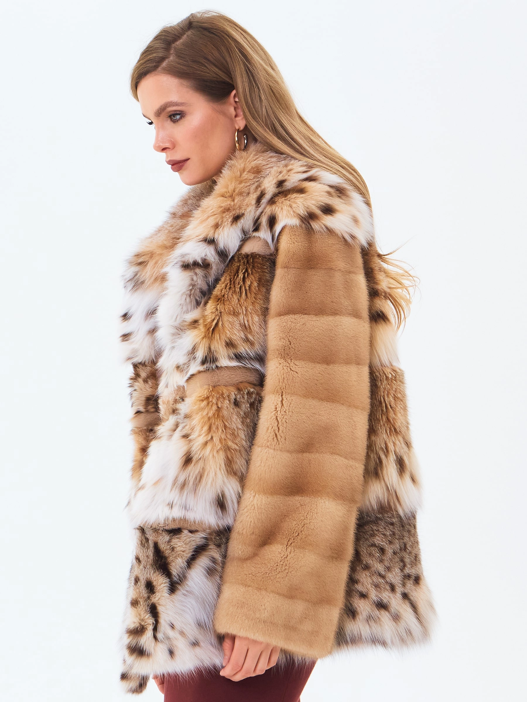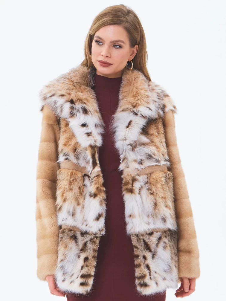 Короткую шубу с глубоким объемным капюшоном выполнили из нежного меха норки в комбинации с мехом рысевидной кошки. Изделие прямого кроя с втачным рукавом и двумя врезными боковыми карманами застегивается металлическими клипсами.
