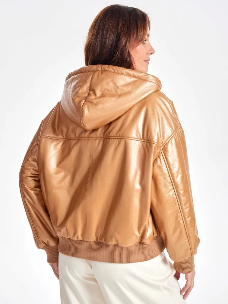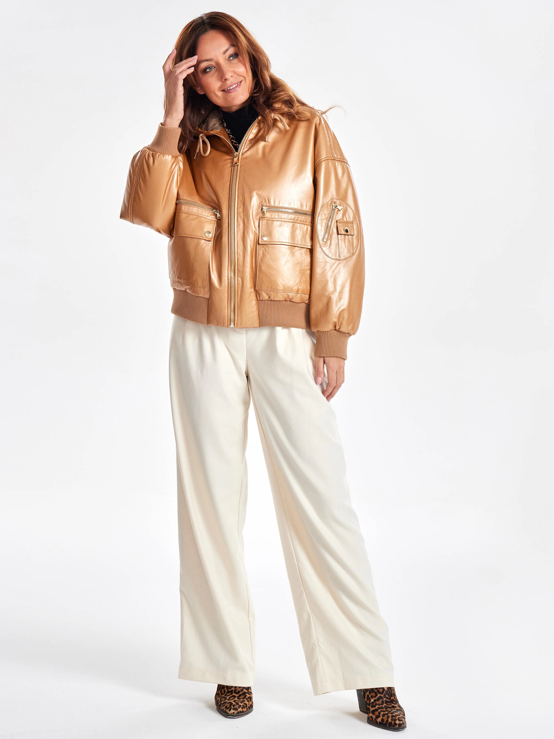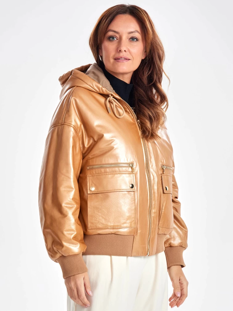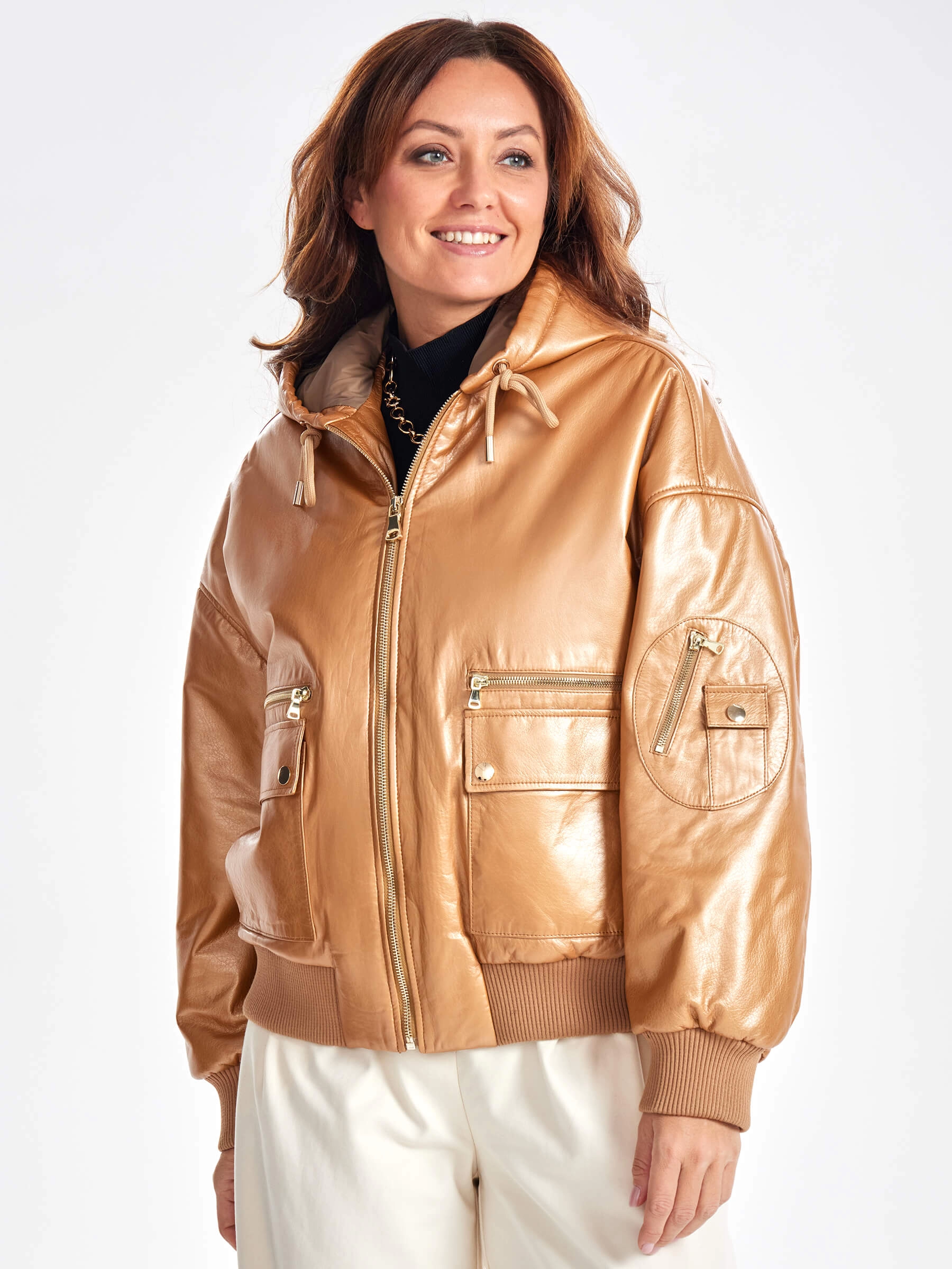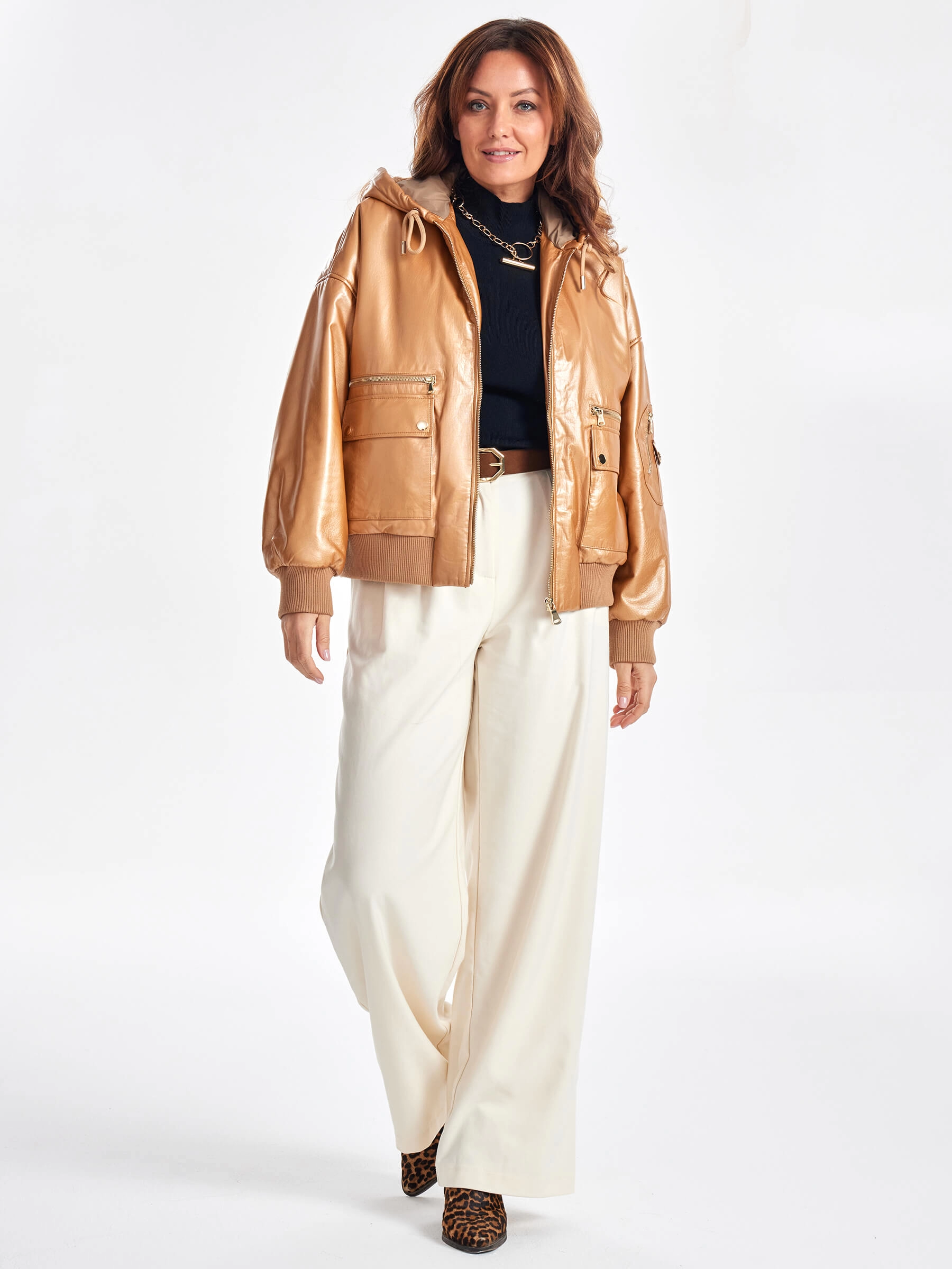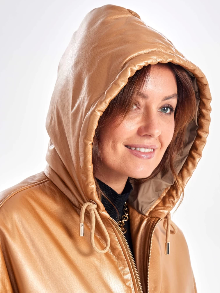 Товар женская утепленная куртка бомбер с капюшоном премиум класса 3075, бежевая, размер 46, артикул 25550 выполнен из натуральной кожи с застежкой молния. Рассчитан на сезон: осень-зима. Длина изделия 62 см, силуэт свободный.