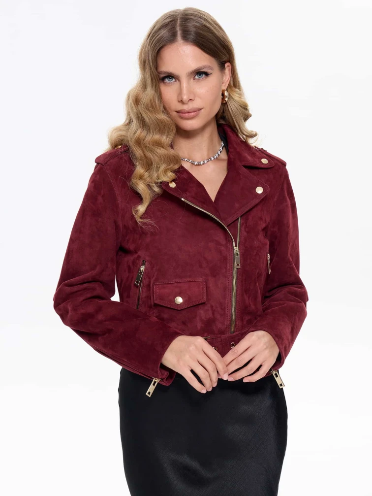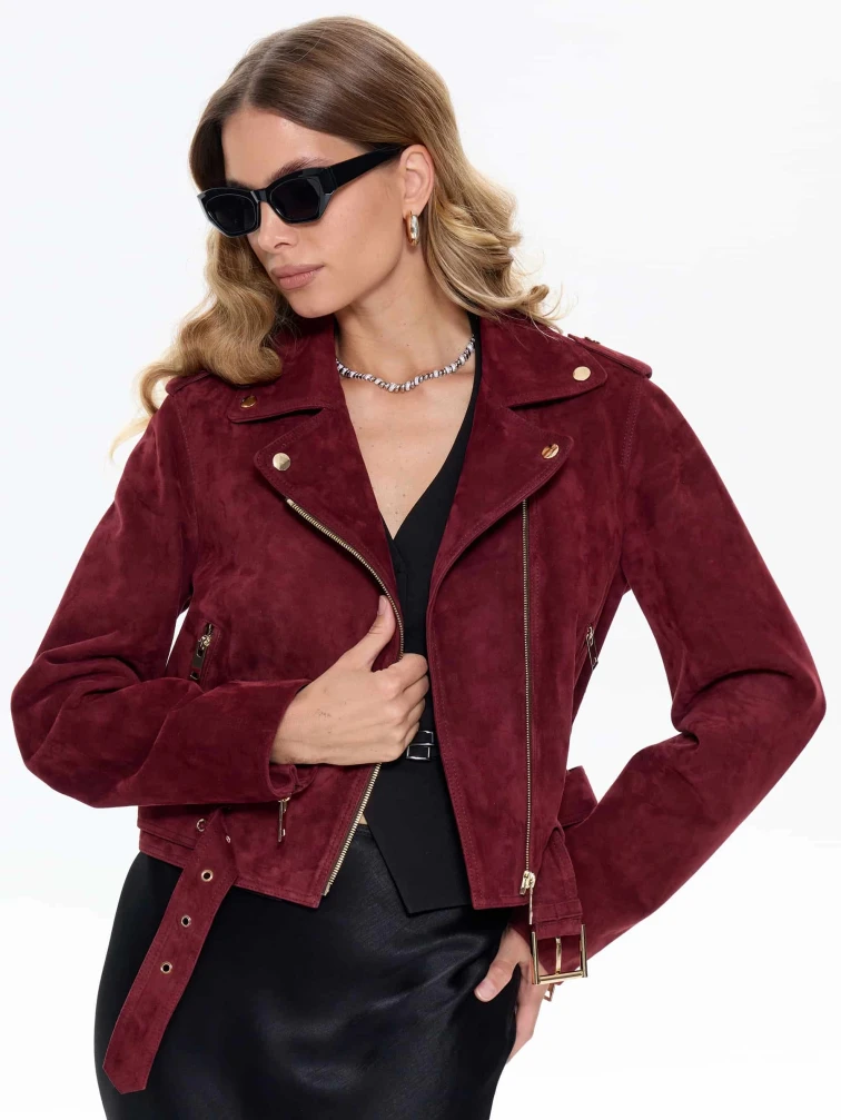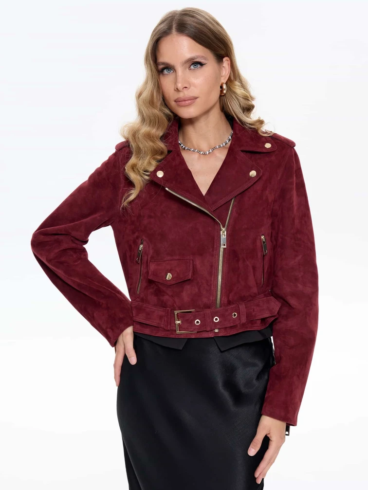 Женская замшевая куртка косуха с поясом премиум класса 3080з, бордовая, размер 42, артикул 24740