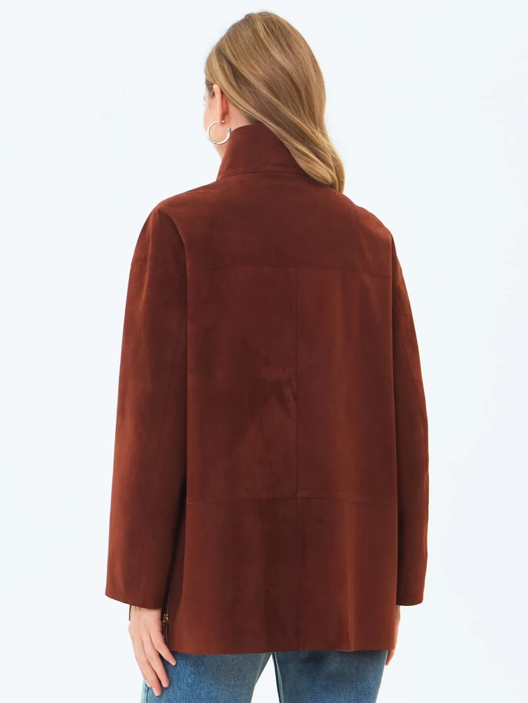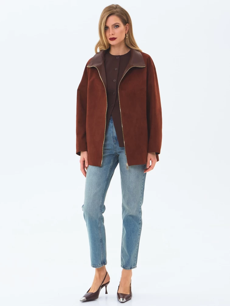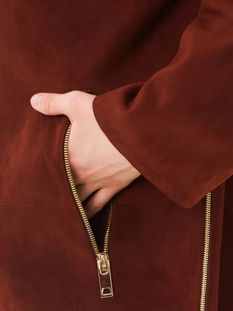 Удлиненную куртку со спущенной линией плеч силуэта оверсайз, выполнили из тонкой мягкой замши премиум класса. Воротник-стойку можно трансформировать в отложной. Великолепная свобода движений. Модель с двумя боковыми карманами и разрезами застегивается крупной молнией.
