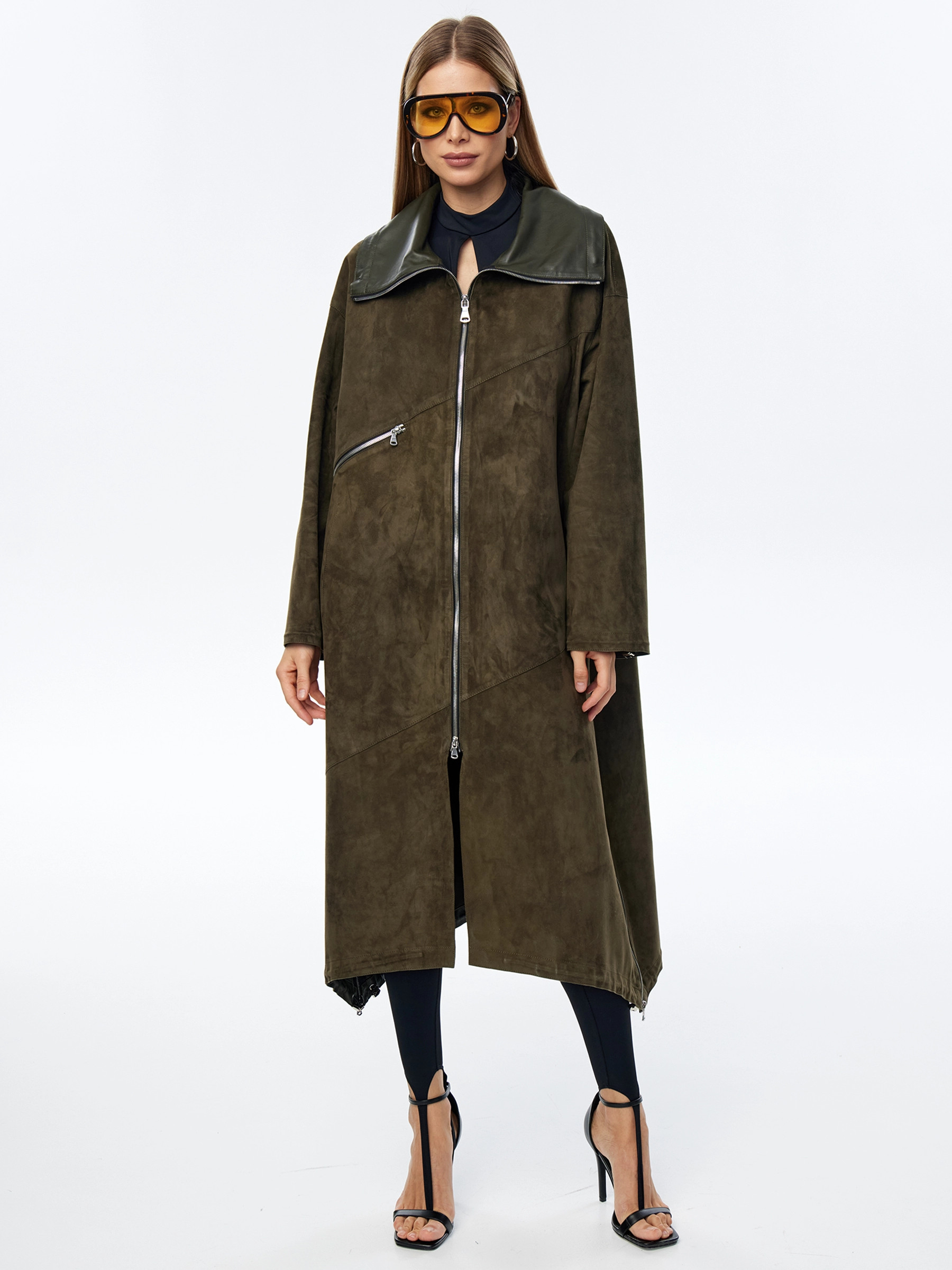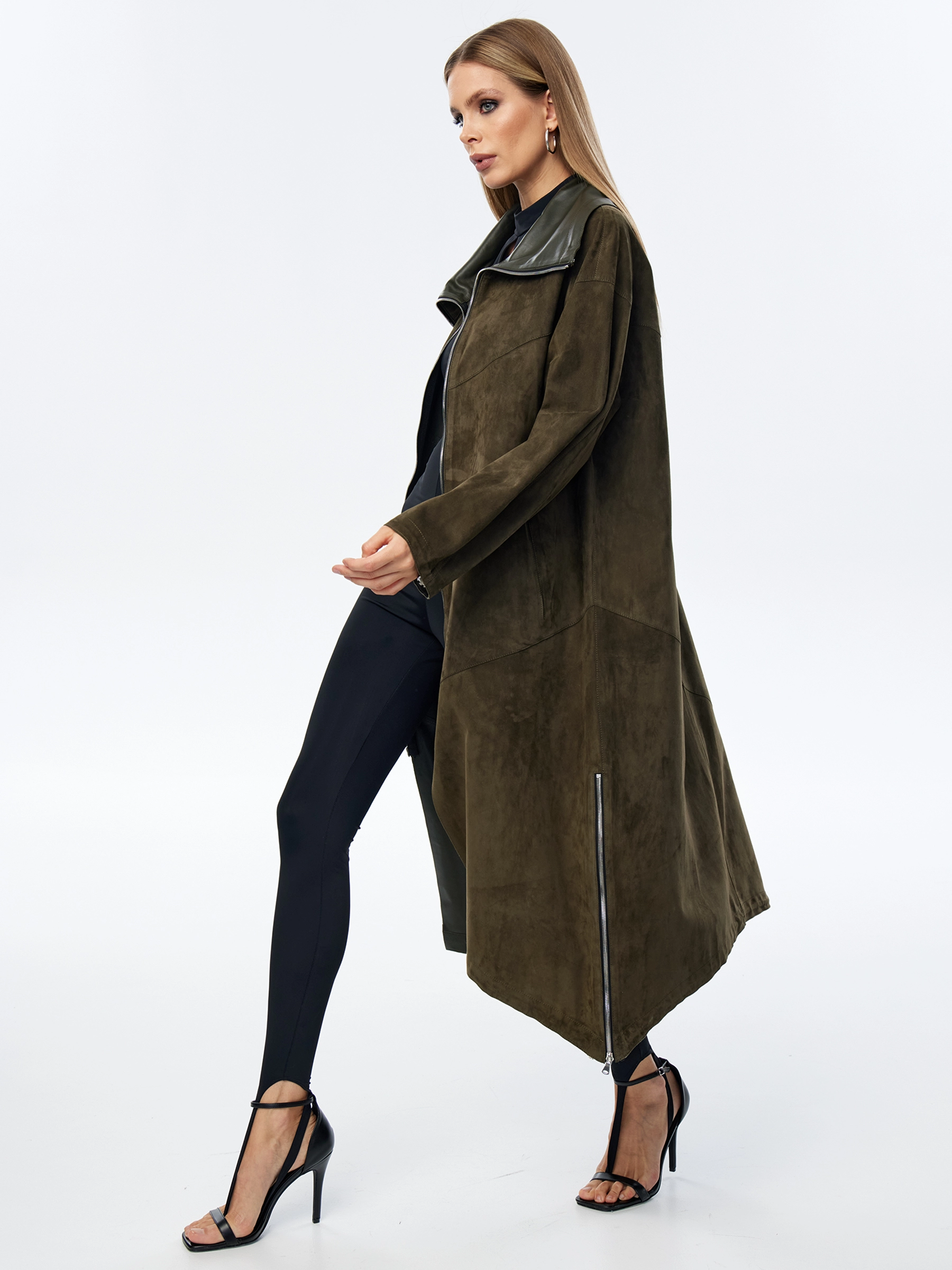 Этот длинный плащ - воплощение стиля и комфорта. Для пошива модели с регулируемыми отложным воротником-стойкой и низом, мастера использовали нежную натуральную замшу премиум класса. Свободный крой, два врезных кармана,боковые разрезы как и сама модель застегиваются крупными молниями. Акцент сделали на асимметричный декоративный карман