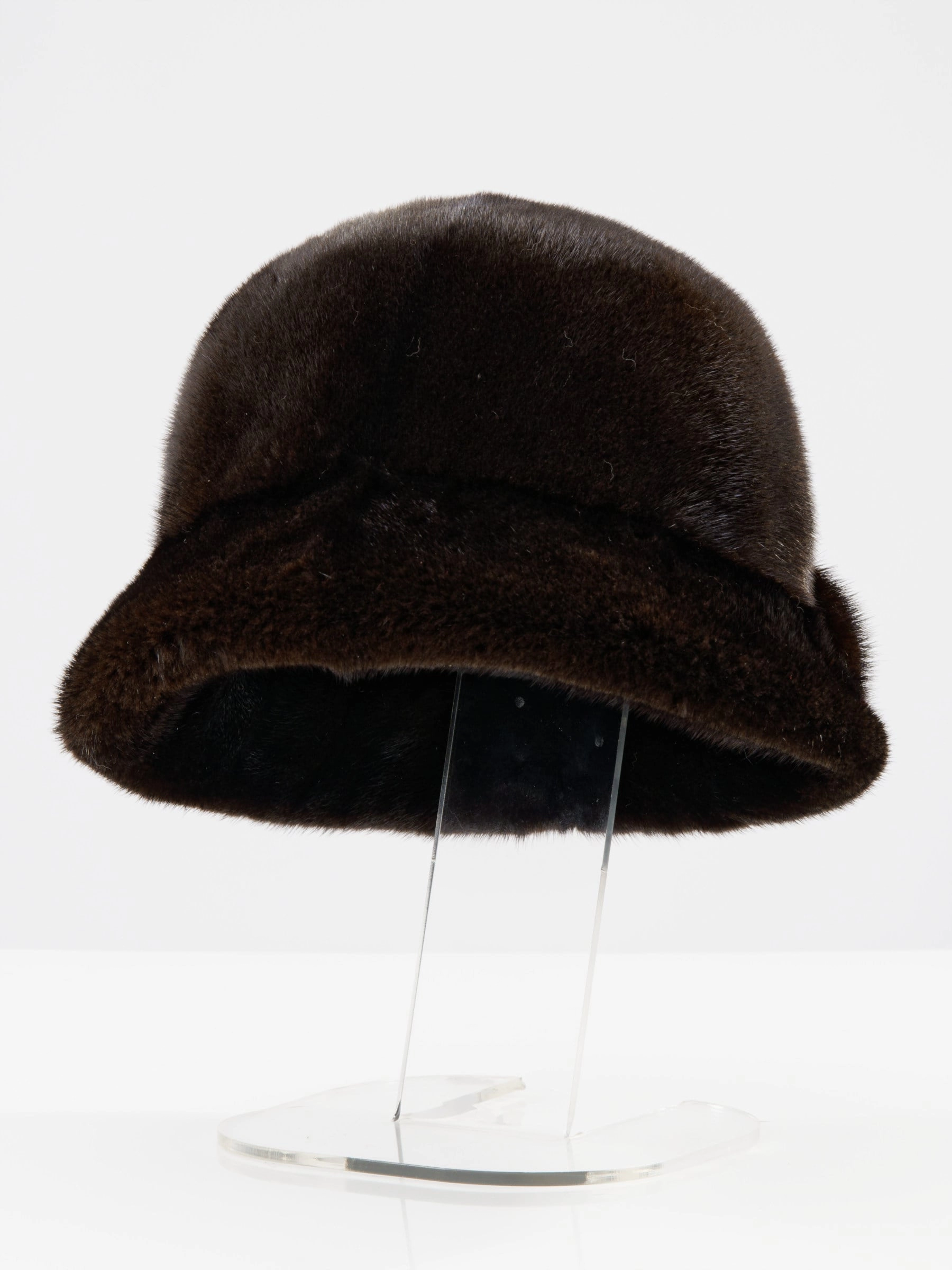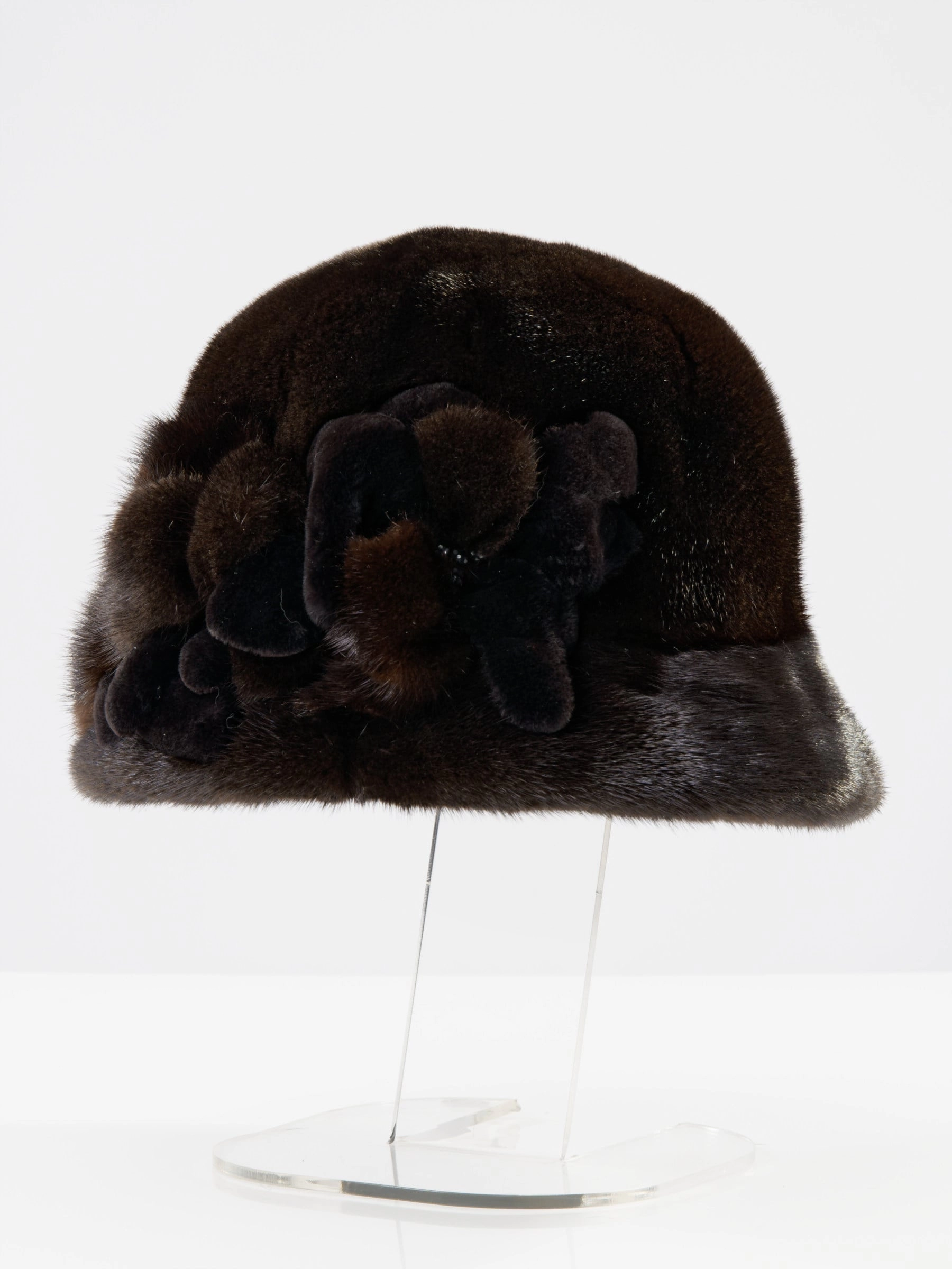 Элегантная теплая норковая шляпка с небольшими полями, высокой тульей и украшением. Посадка глубокая. Отлично дополнит классическую зимнюю одежду.