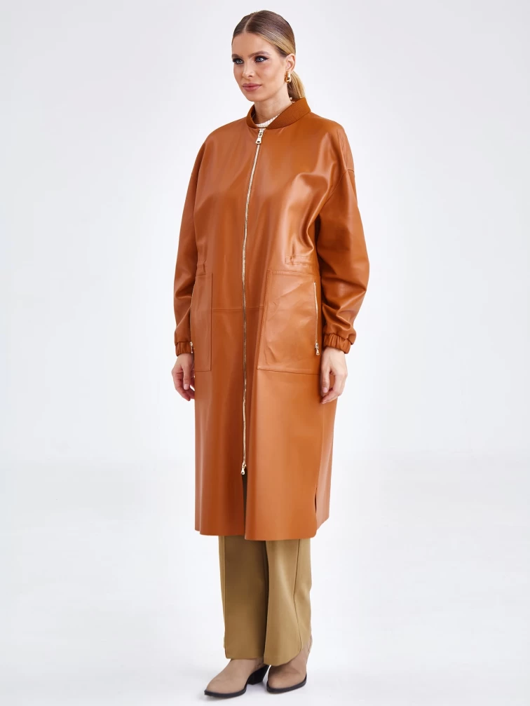 Товар женский кожаный плащ бомбер премиум класса 3035, виски, размер 44, артикул 91931 выполнен из натуральной кожи с застежкой молния. Рассчитан на сезон: весна-лето. Длина изделия 110 см, силуэт прямой.
