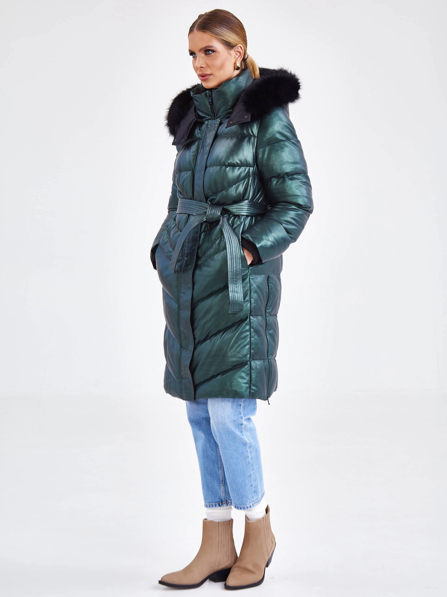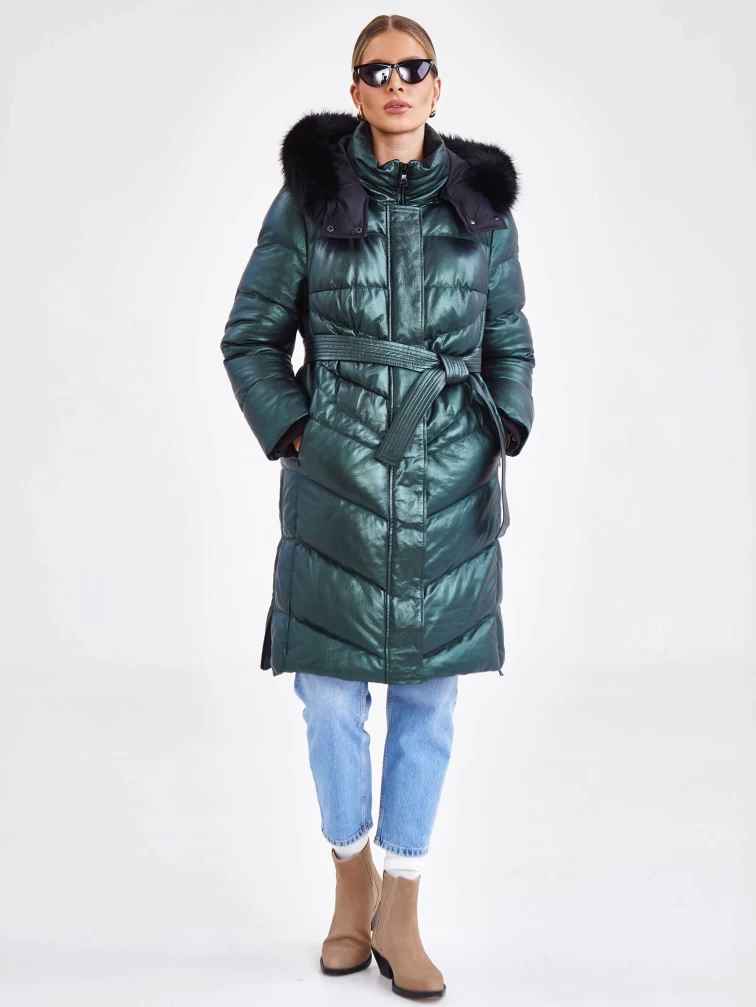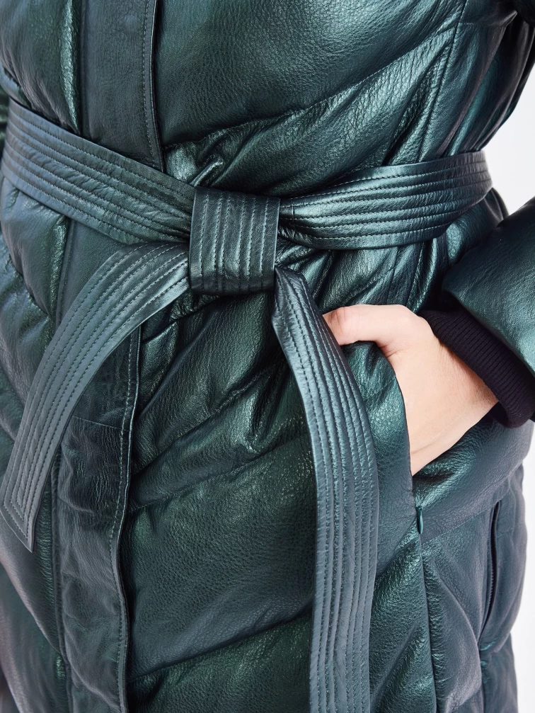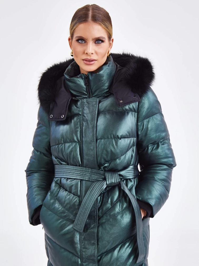 Женский кожаный пуховик с капюшоном премиум класса 3048, зеленый, размер 44, артикул 25450